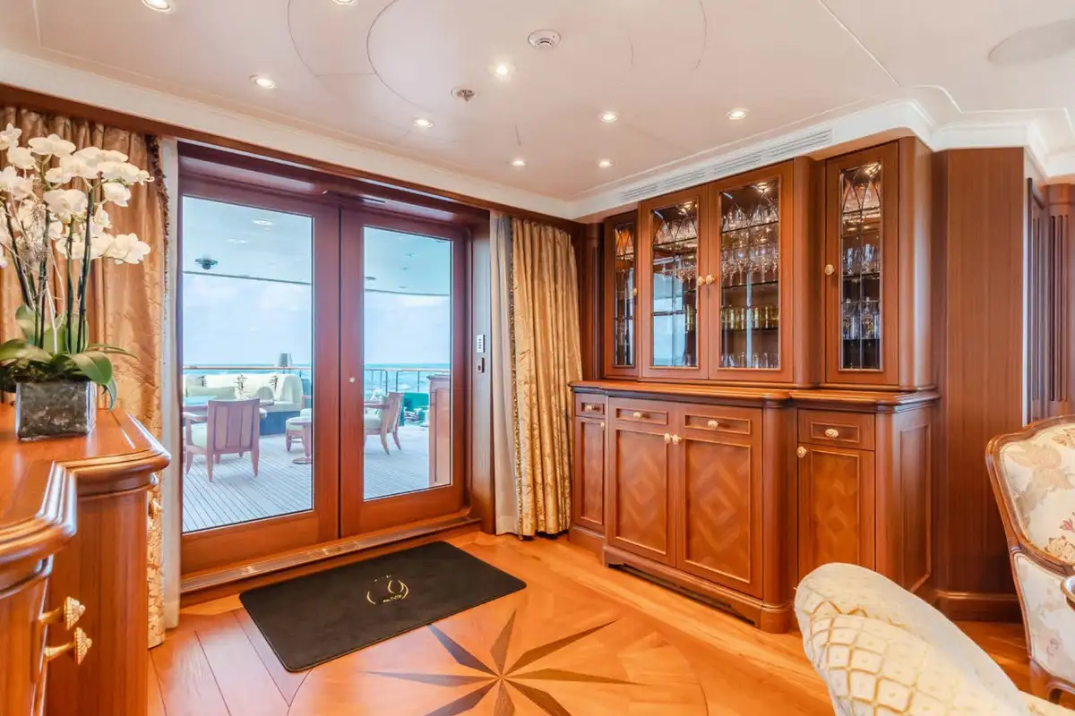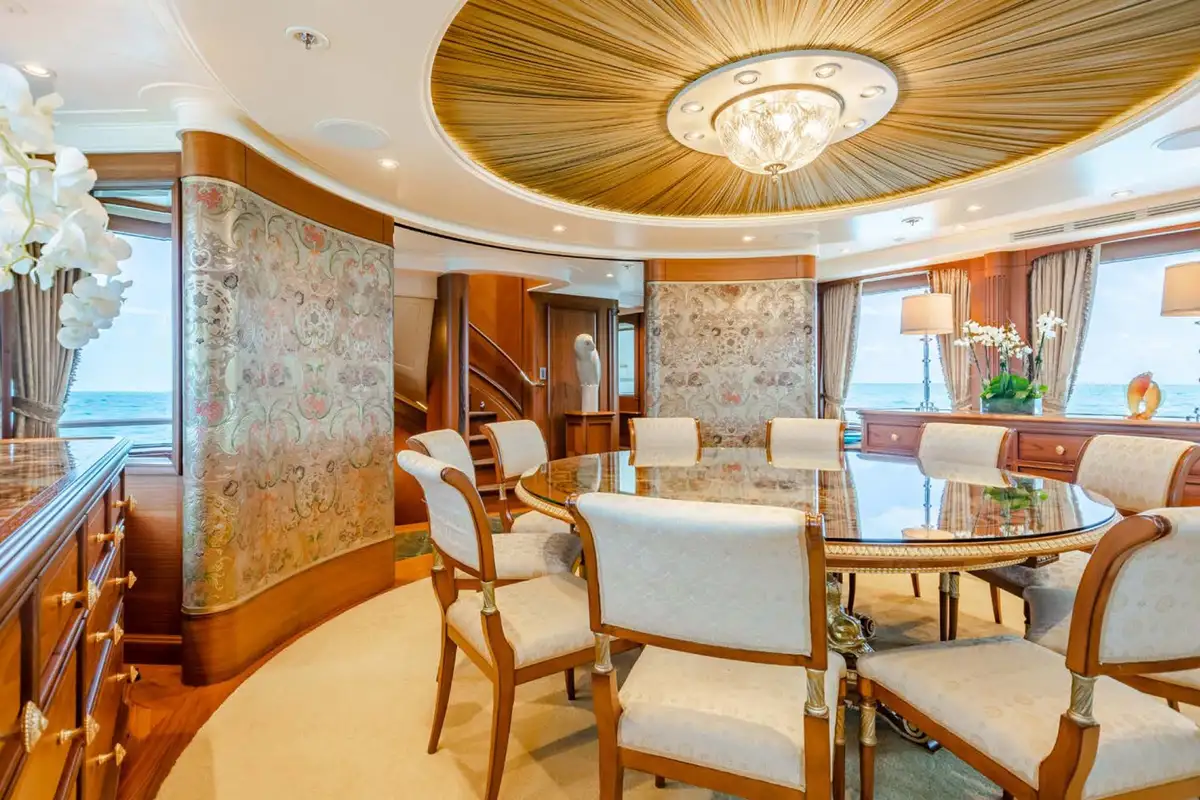 On the main deck, an al fresco lounge area in the cockpit invites guests to breakfast and the start of a new day, while inside, the main deck saloon showcases the craftsmanship and care that has gone into SHADOWL's design. With lounge areas furnished with sofas and armchairs, and a formal dining area featuring a circular dining table, guests can indulge in delicious fine dining experiences and entertaining soirées.
