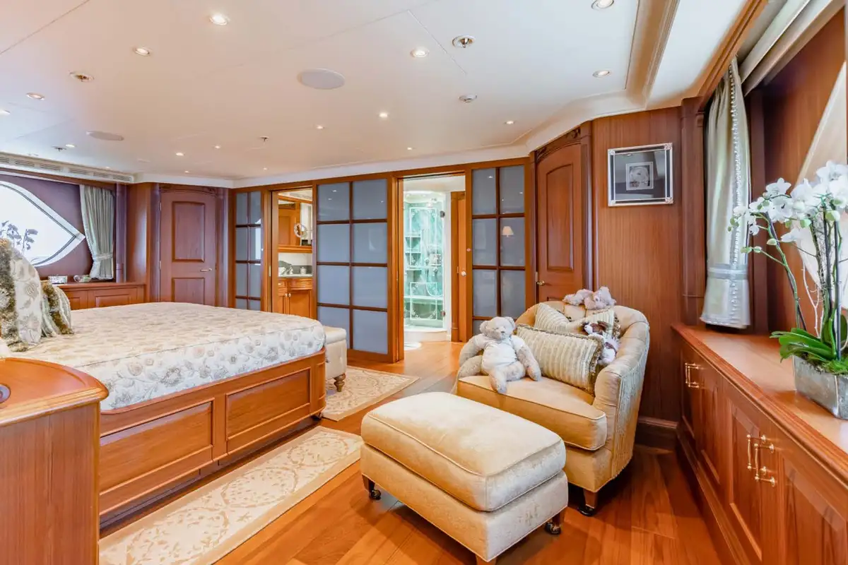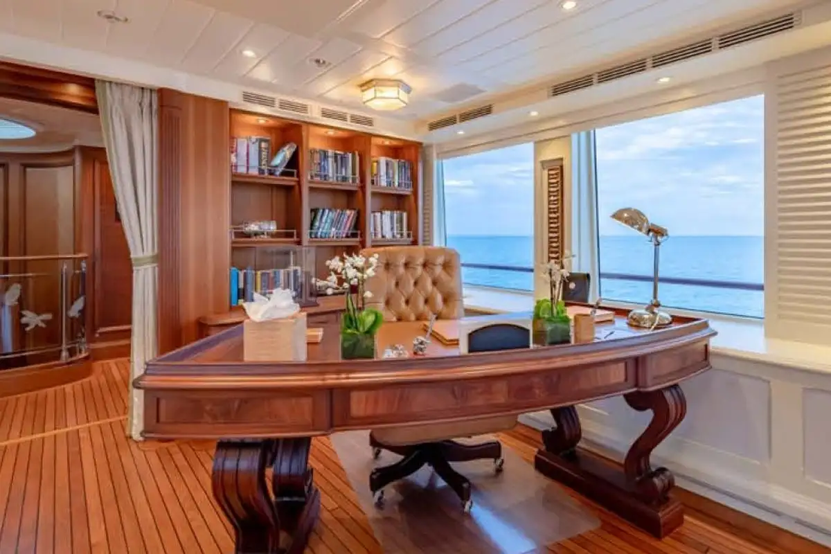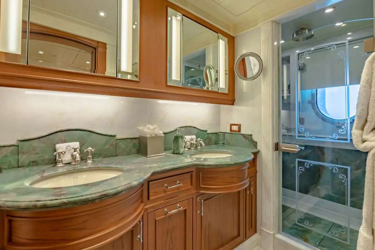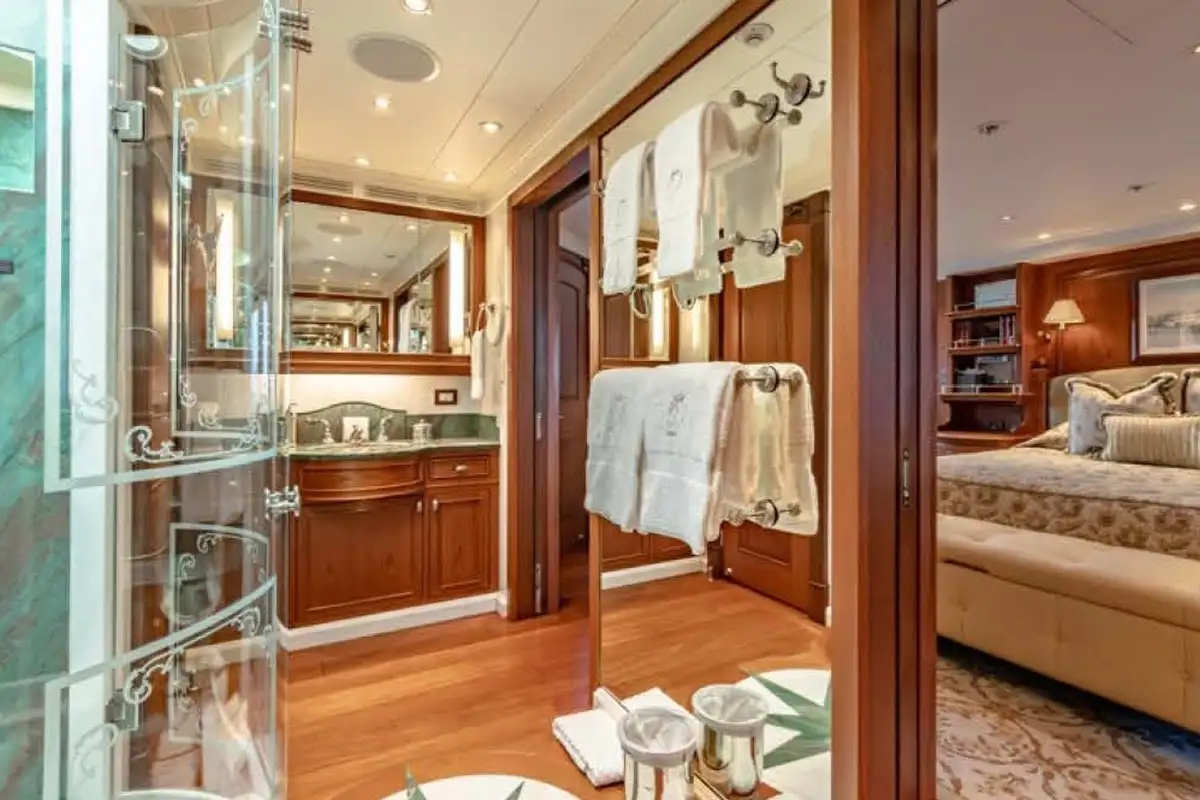 SHADOWL features a main deck master suite, accessed through a private office. The spacious suite boasts a full-beam layout and a large en suite bathroom with a jade-lined shower compartment, providing you with the ultimate retreat for rejuvenation. On the lower deck, guests will discover three luxurious double berth suites and one twin-berth suite, all offering ample space for complete relaxation.