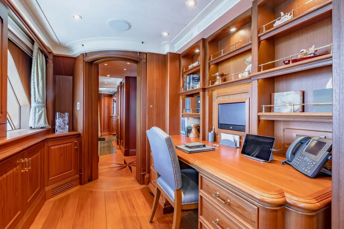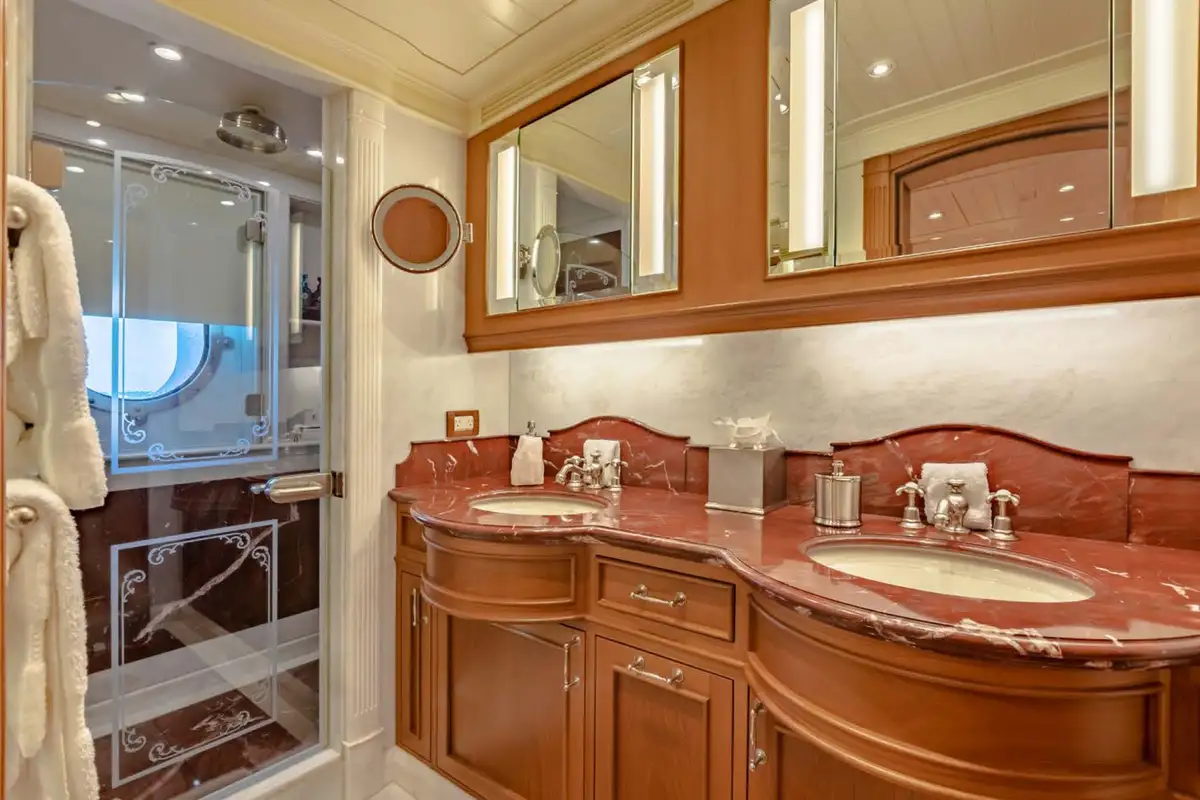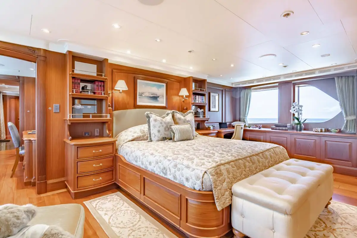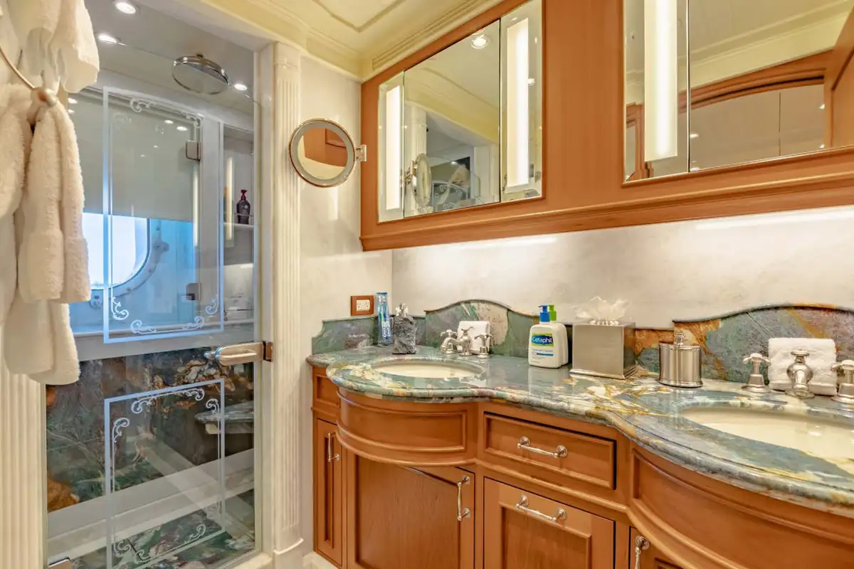 SHADOWL features a main deck master suite, accessed through a private office. The spacious suite boasts a full-beam layout and a large en suite bathroom with a jade-lined shower compartment, providing you with the ultimate retreat for rejuvenation. On the lower deck, guests will discover three luxurious double berth suites and one twin-berth suite, all offering ample space for complete relaxation.