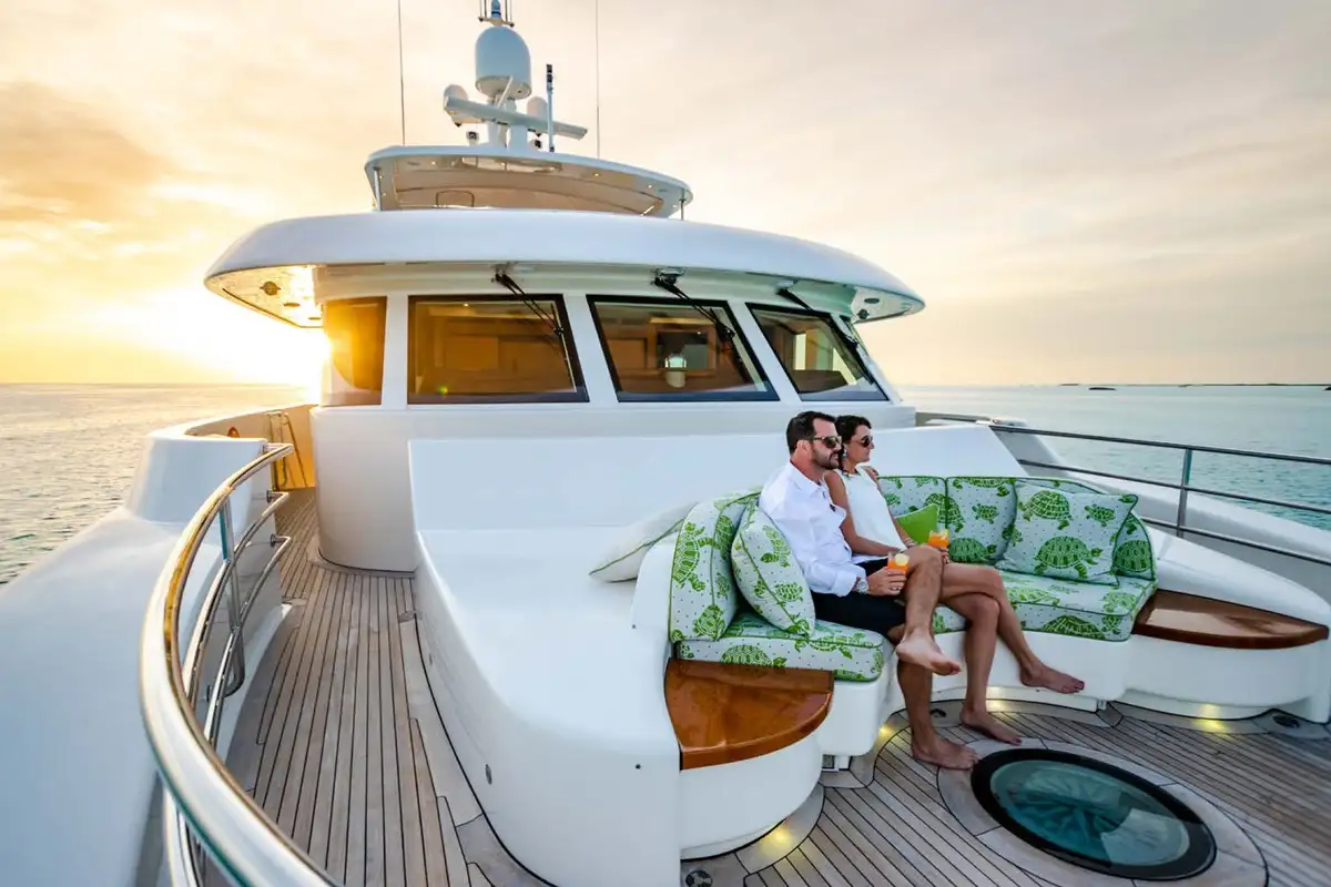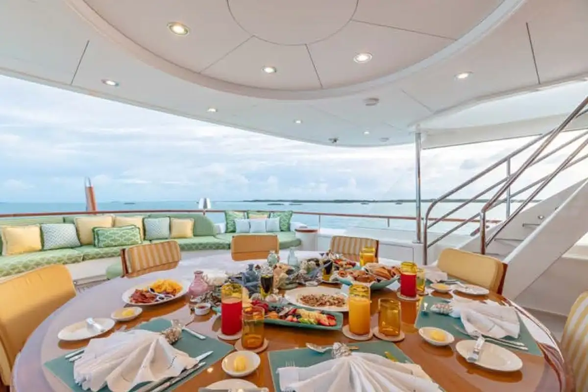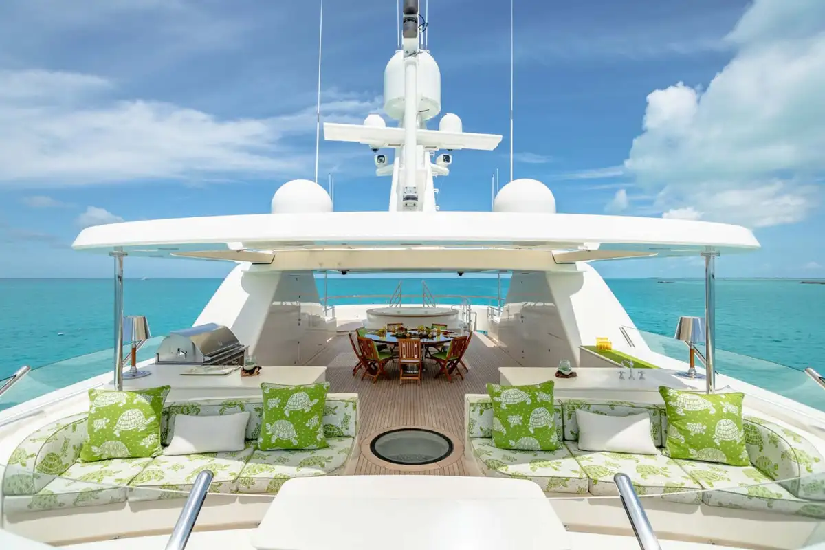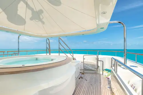 On the sundeck, forward-facing seating is complemented by a BBQ, wet bar area, and shaded al fresco dining area. Further aft, a raised jacuzzi invites you to unwind and soak up the stunning vistas.