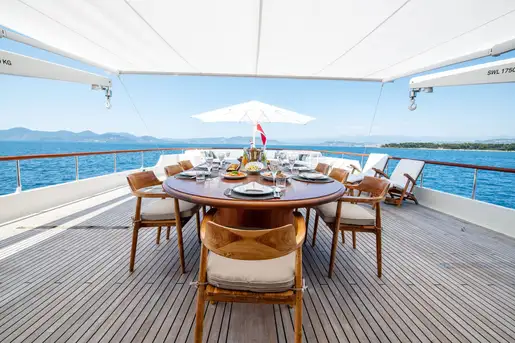 The upper lounge on the bridgedeck level is a sociable and versatile living room, also beautifully restored with many of its original features preserved. It’s bright and airy with a grand sweep of panoramic windows and double doors leading out onto the upper aft deck. This is a long, broad and open expanse of traditional laid teak with classic mahogany rails all round. An awning slides out to shade the dining table and there’s a semicircle of sofas astern with a large parasol.