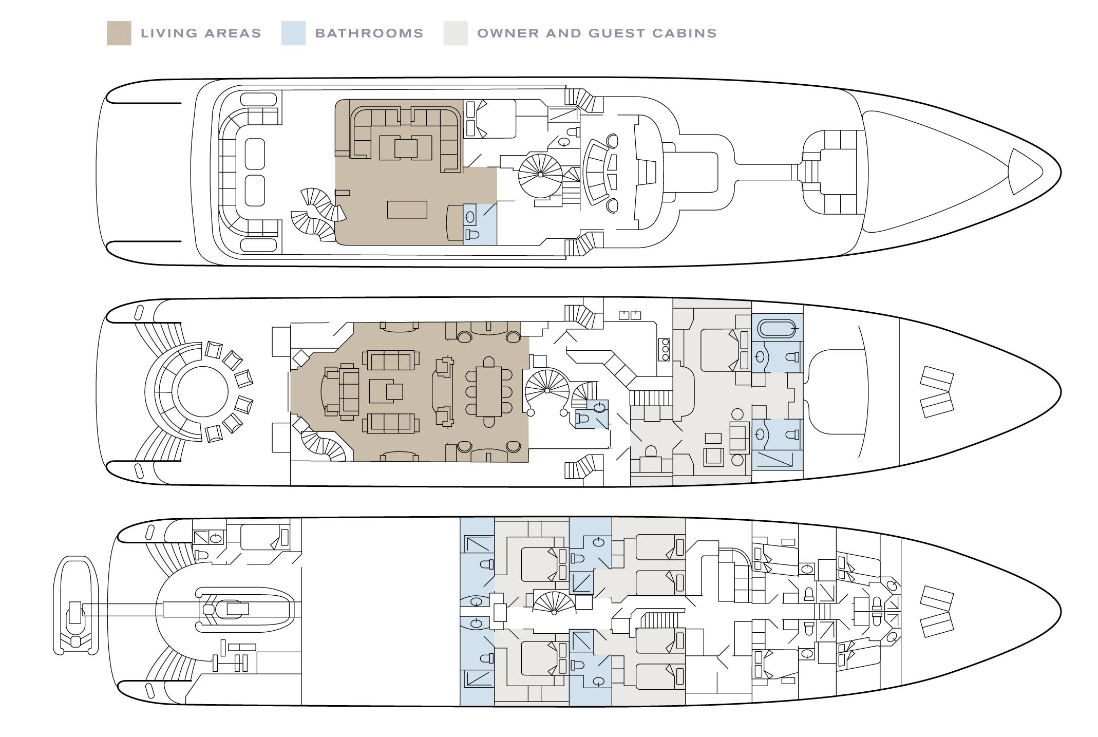 The supremely spacious full-beam master suite incorporates a seating area, study, dressing room and his and her bathrooms. Gently curved shapes and warm tones create a peaceful ambience. Two double and two twin cabins on the lower deck offer a welcoming retreat for other guests at the end of the day.