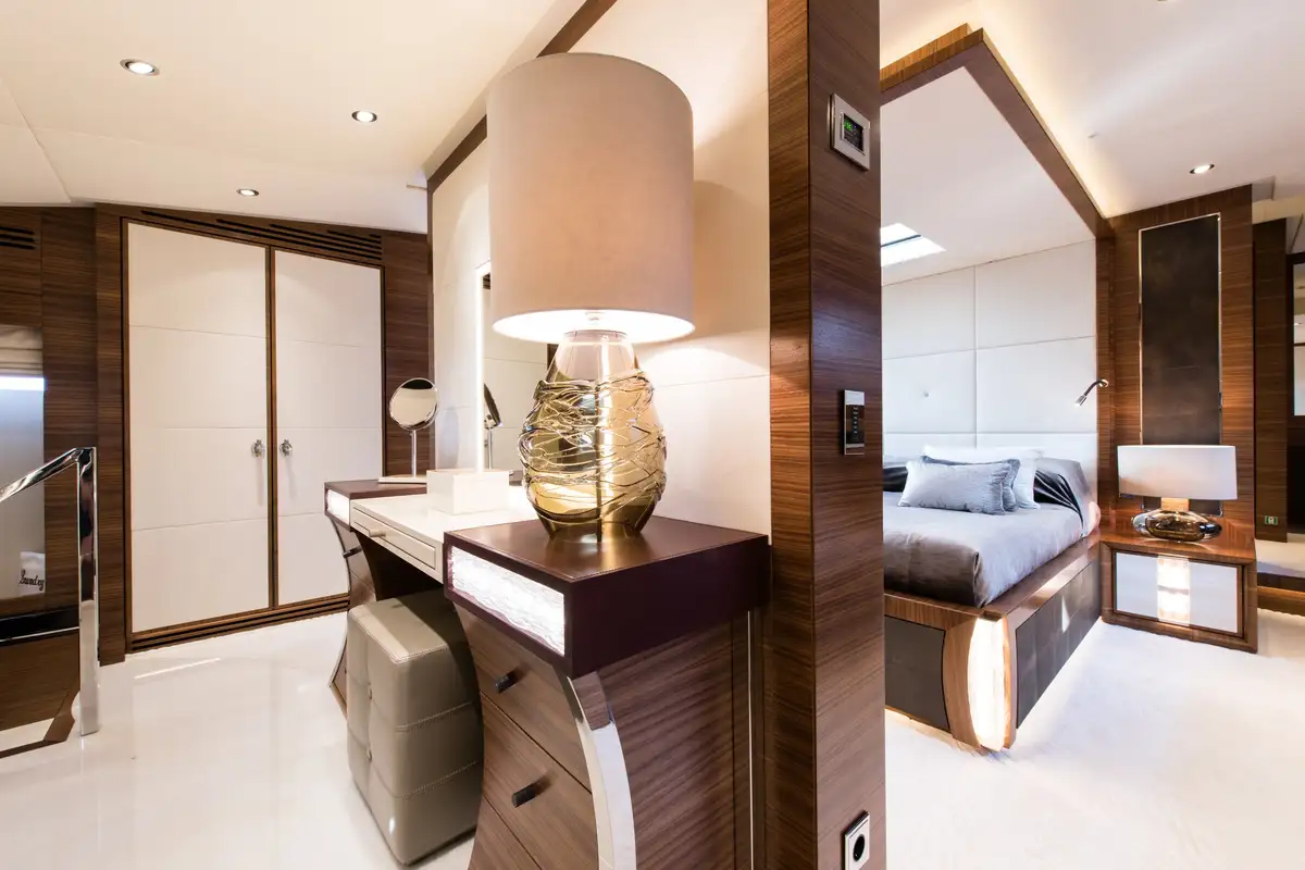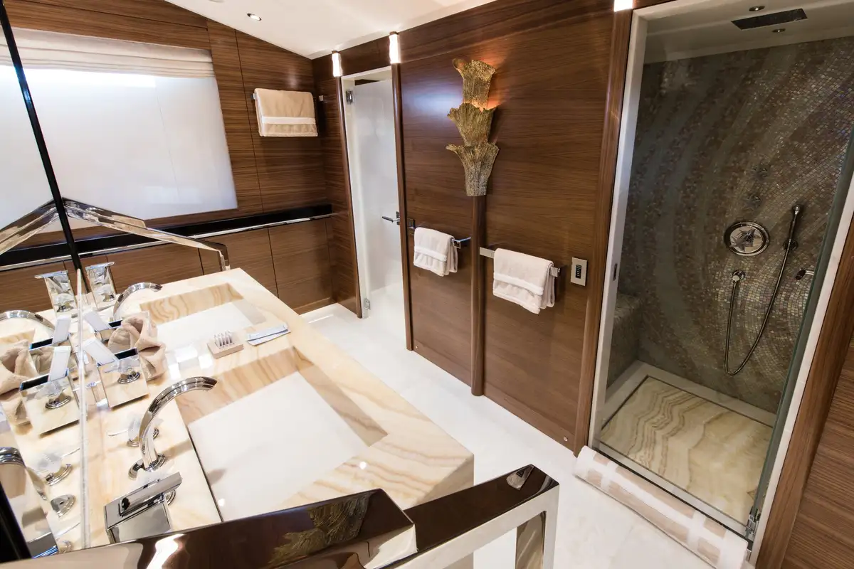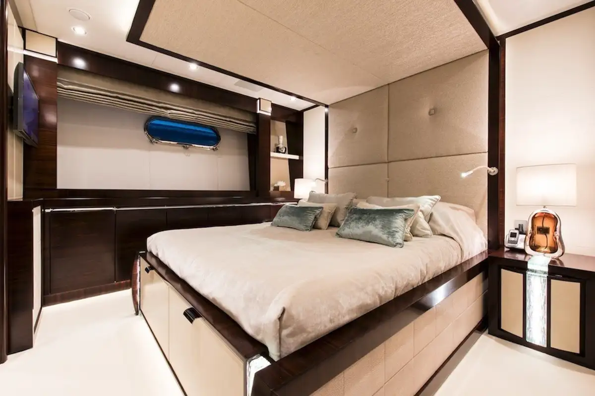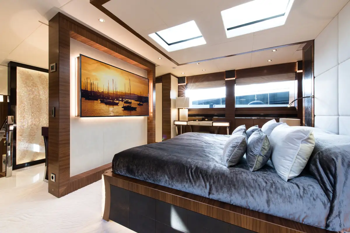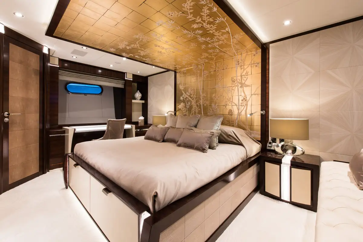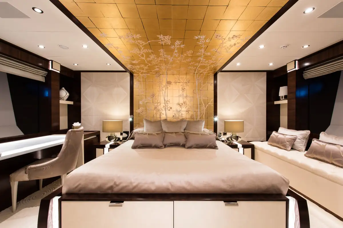 Lavish materials and attention to detail define the interior character. Throughout, soft furnishings of neutral cream and powdery blue tones work beautifully against the walnut and rosewood wood features. During the 2018 refit, a fifth guest cabin was created for added flexibility extending her capacity to sleep 11 guests in five cabins. All are equipped with iPad control systems, Apple TVs and are subtly decorated with colour schemes designed to echo the beautiful mosaic tiling in each en suite.
