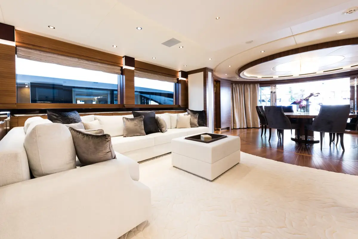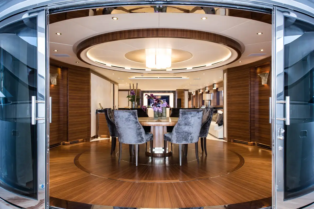 Unusually, the main deck dining area is positioned at the aft deck entrance so you can enjoy the views without compromising on privacy. The circular table accommodates six, eight or 12 thanks to her hidden extensions stored in the surrounding wall.