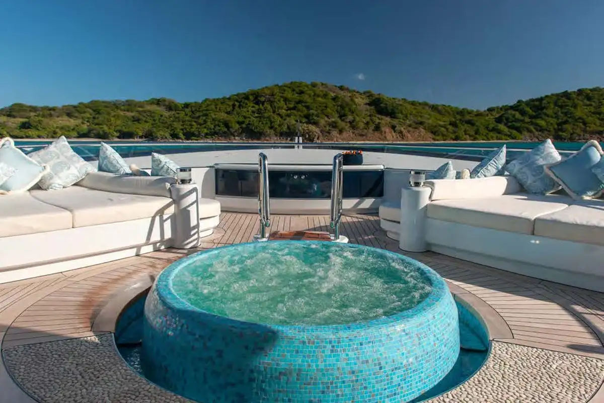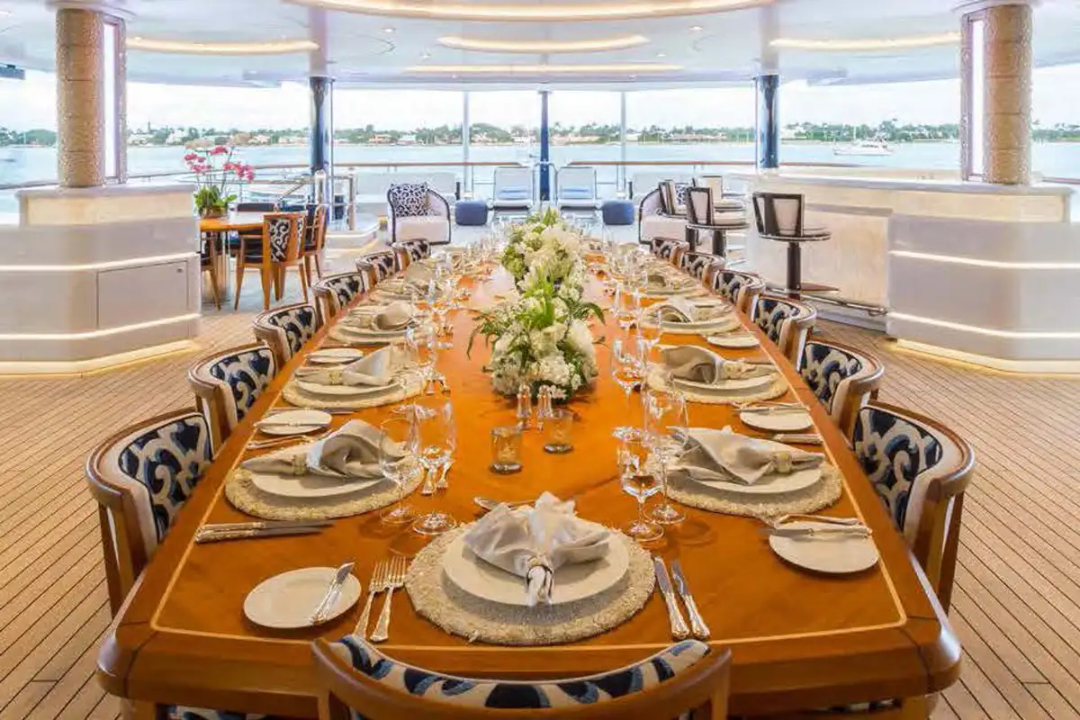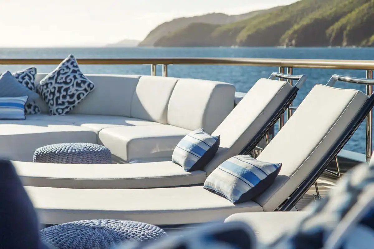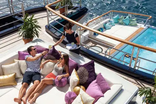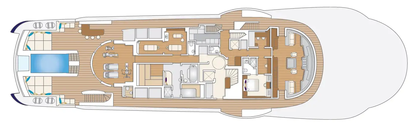 After so much activity, it’s time to refuel with lunch on the owner’s deck aft prepared by the talented chef with the freshest ingredients available. Whether guests choose to linger over a long lunch here or lounge around one of three pools, the afternoon is all about relaxation. With a spa pool located on the top deck, a large counter current pool on the bridge deck, and a second spa pool on the owner’s deck forward, there are plenty of bathing options whether you are looking for a quiet dip or time spent with others.