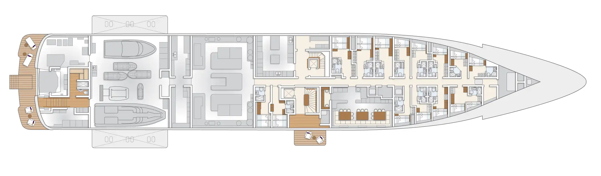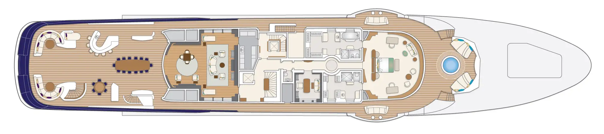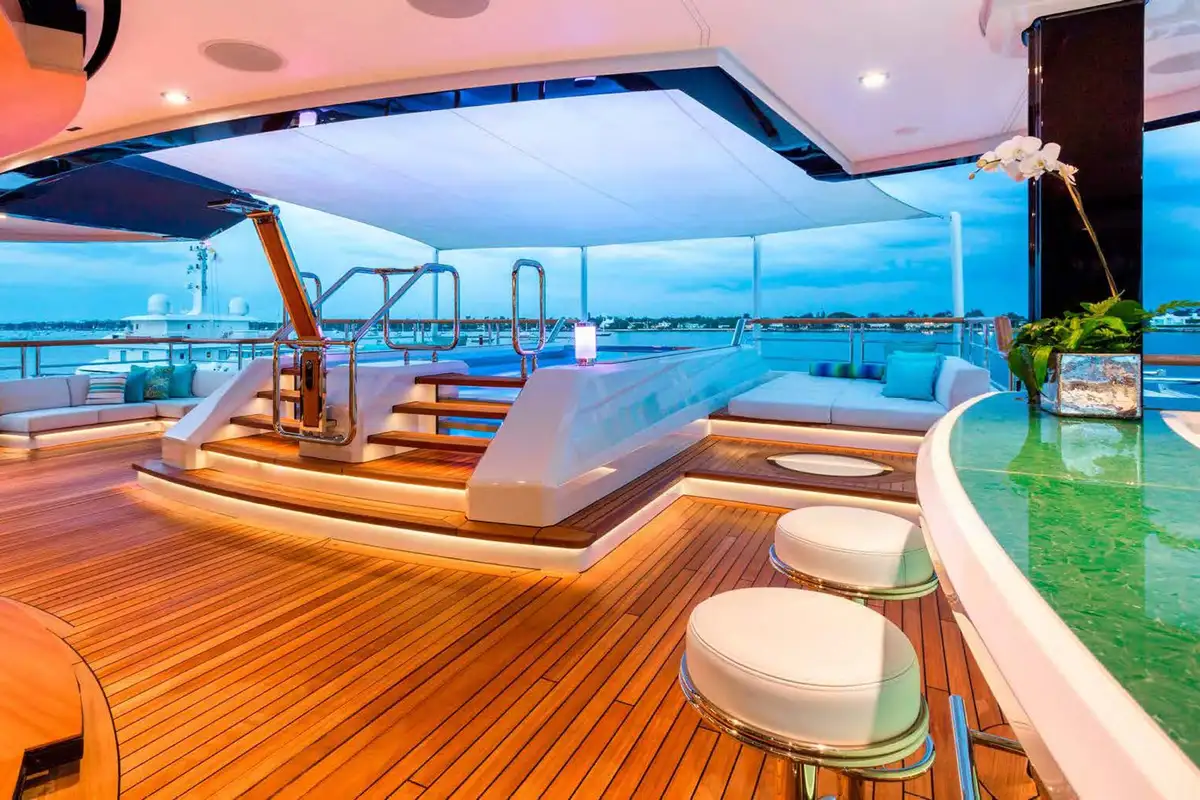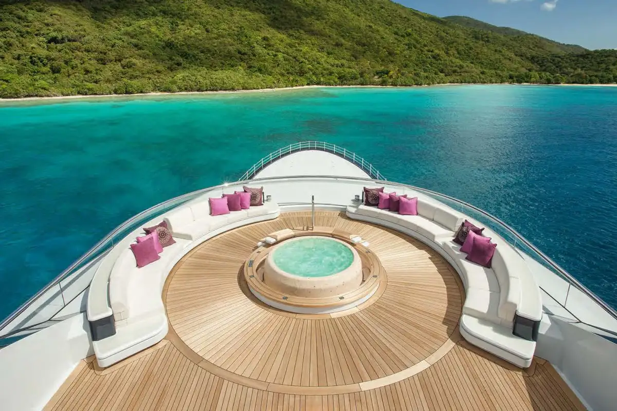 After so much activity, it’s time to refuel with lunch on the owner’s deck aft prepared by the talented chef with the freshest ingredients available. Whether guests choose to linger over a long lunch here or lounge around one of three pools, the afternoon is all about relaxation. With a spa pool located on the top deck, a large counter current pool on the bridge deck, and a second spa pool on the owner’s deck forward, there are plenty of bathing options whether you are looking for a quiet dip or time spent with others.