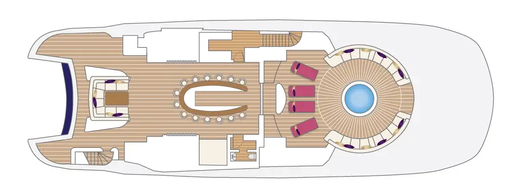 On the three aft decks lots of lounging areas and a variety of al fresco dining possibilities let you spend each day on board in a different location. Begin your day with a workout in the bridge deck's air conditioned gym with wraparound views through floor to ceiling picture windows. Follow your workout with a massage in the chromatherapy spa, complete with hammam and massage room with on board masseuse.