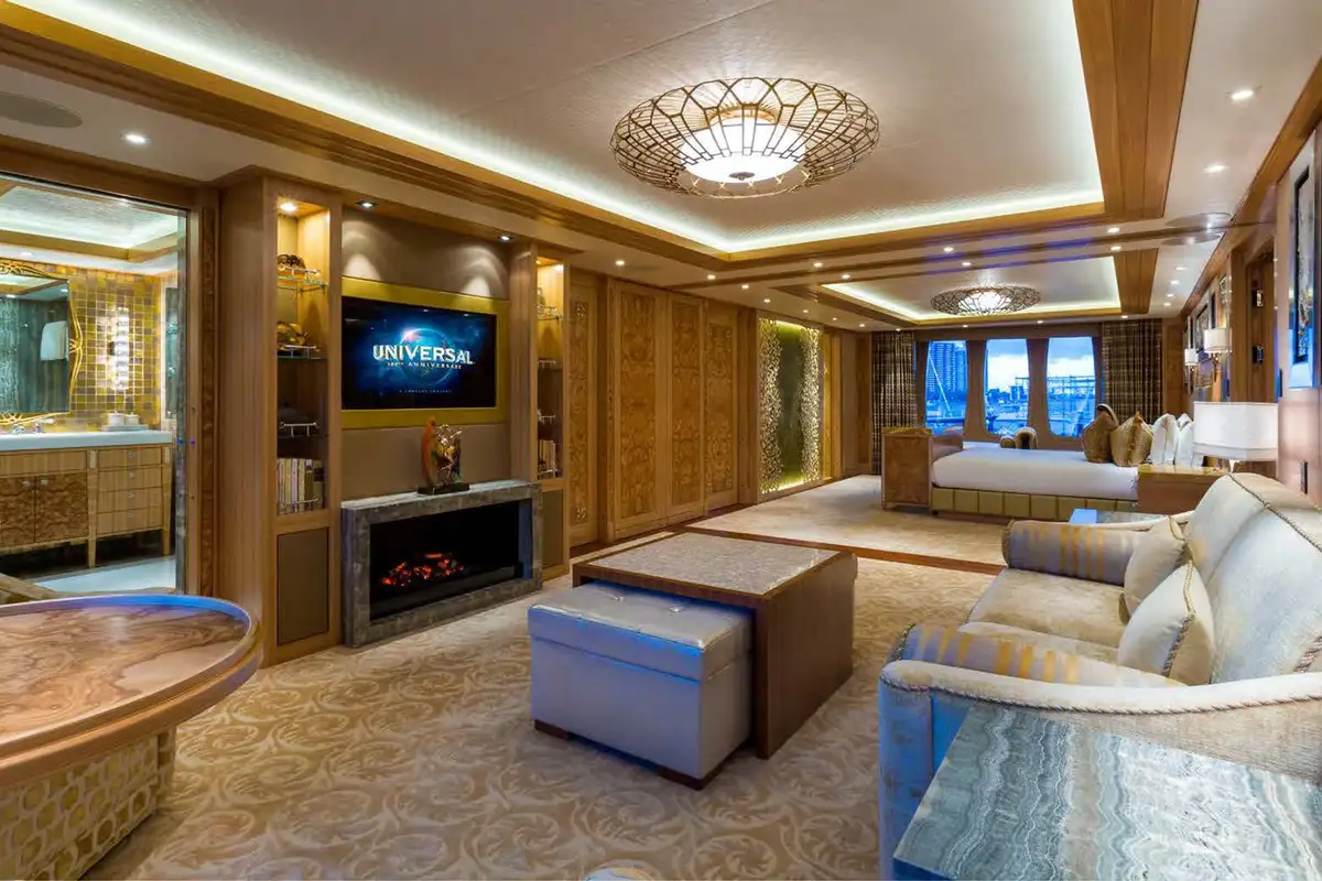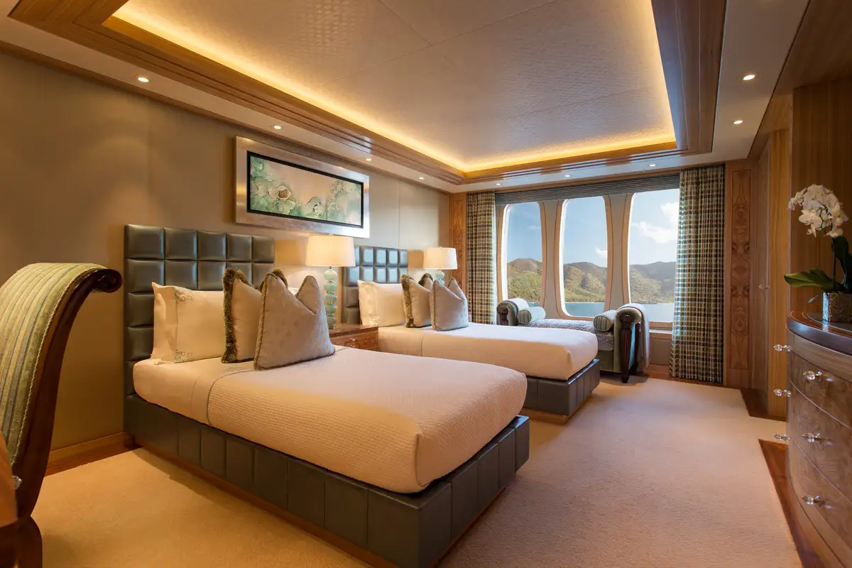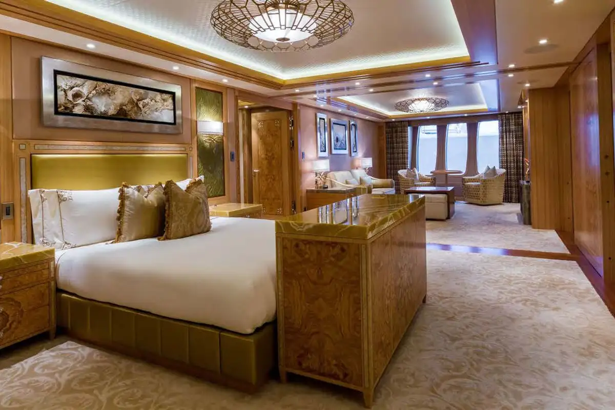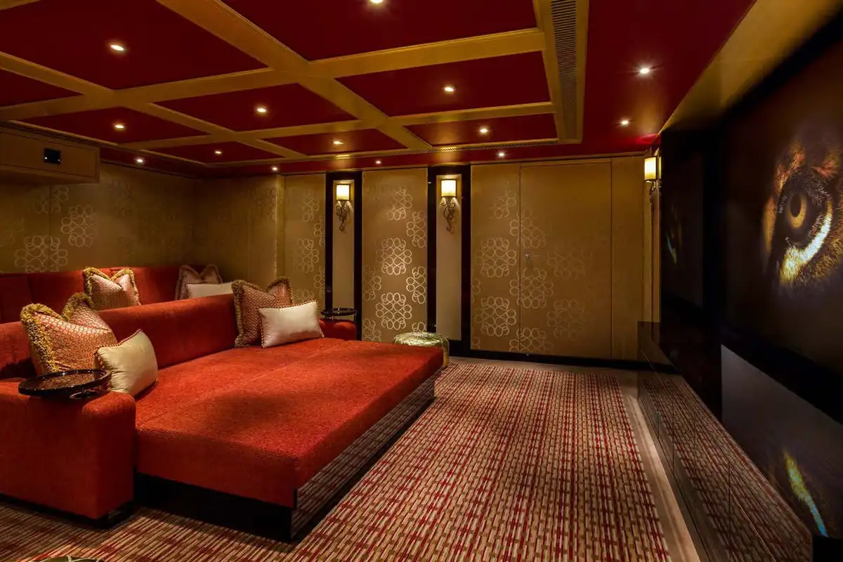 Come dinner time, there are several seating and al fresco dining areas on offer, with a particularly grand dining table on the owner’s deck aft if formal is your thing. Enjoy a gastronomic extravaganza at any of these to your precise requests, before heading up to the top deck for a party. The jacuzzi here can be transformed into a dance floor surrounded by disco lighting and accompanied with music from the built-in DJ console. Alternatively, the younger guests in the charter party can head to the dedicated cinema room, or simply retire to one of the sumptuous suites. After the last dance, retire to the owner’s suite surrounded by all the luxuries and necessities of home, but with full 180-degree views over the ocean to wake up to.