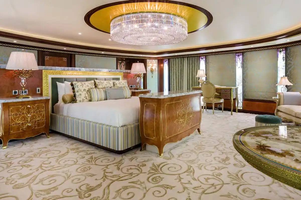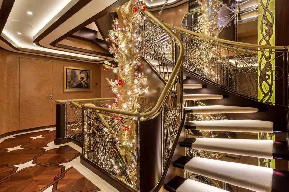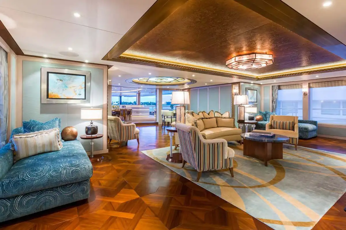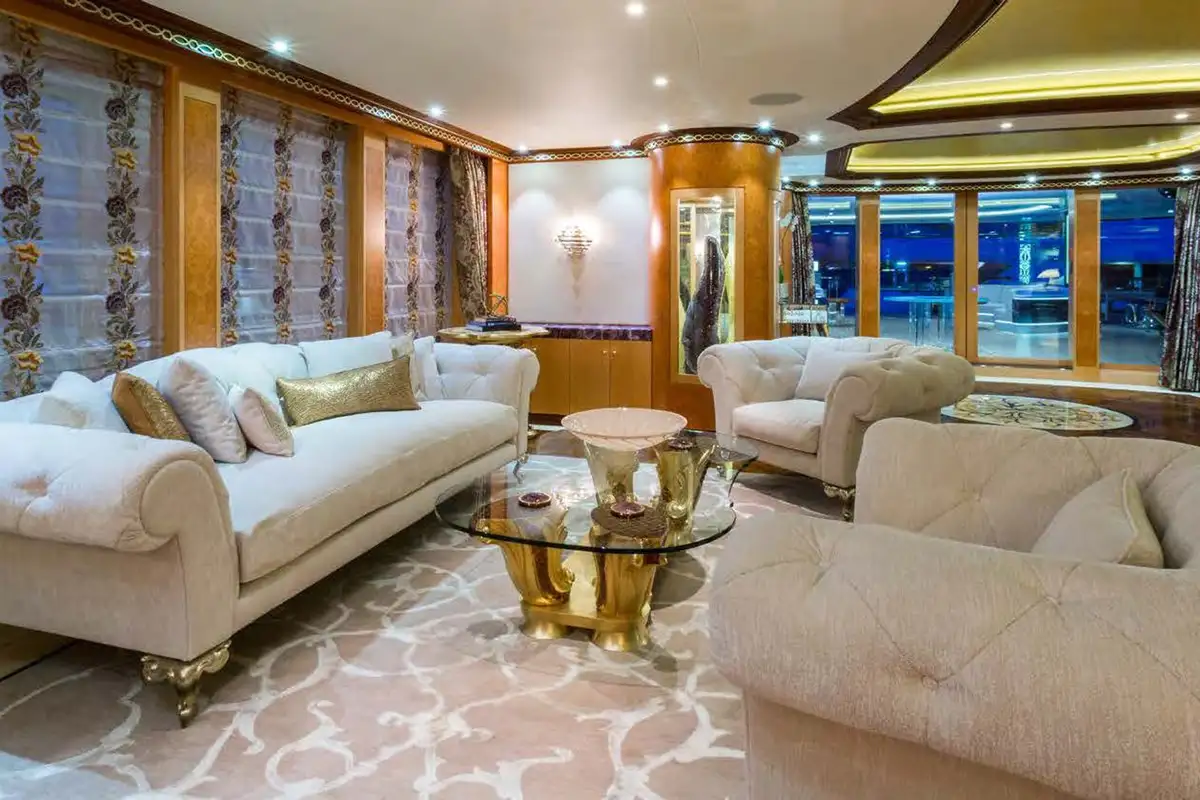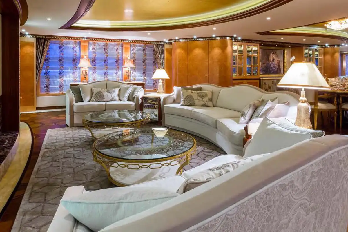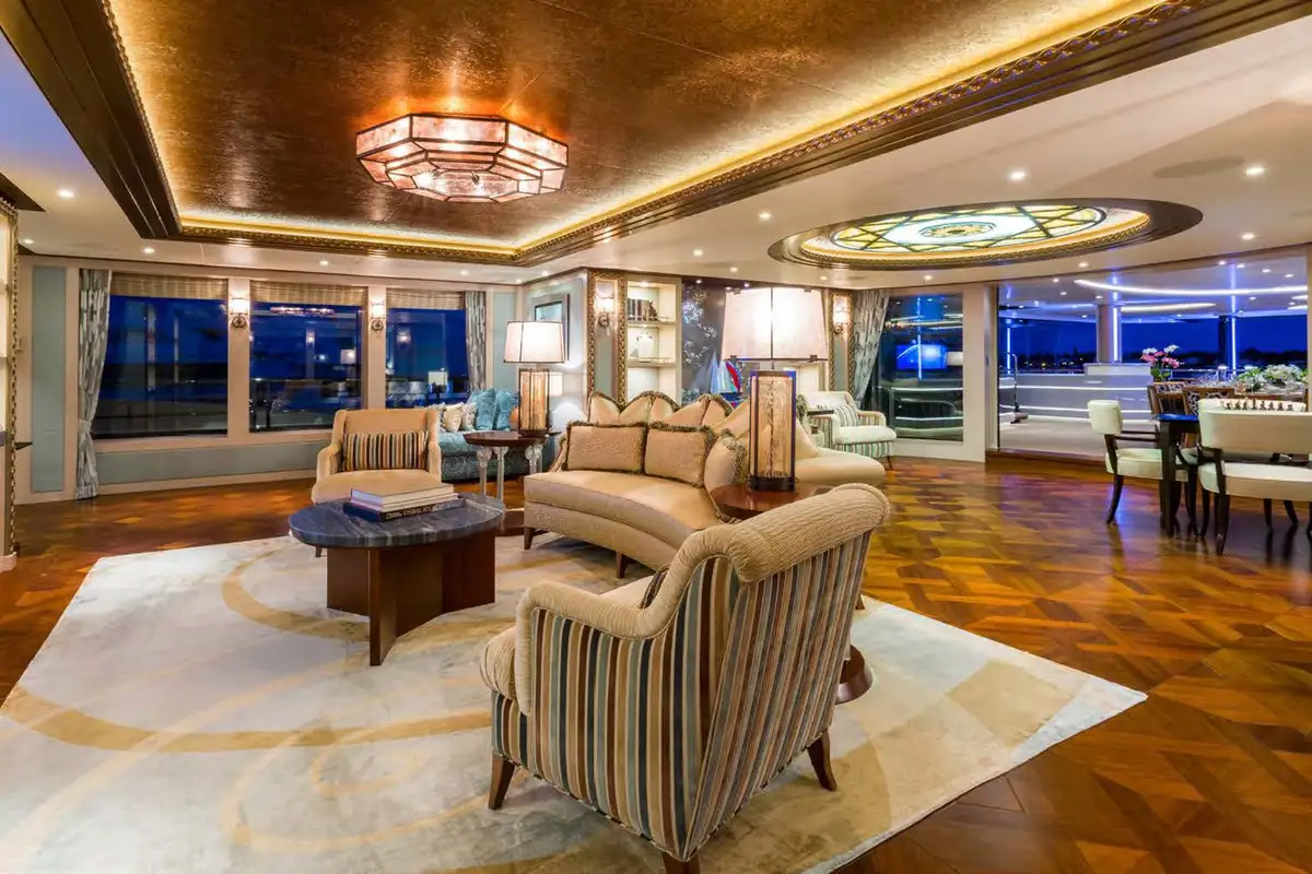 Stepping on board, the first thing you notice is her exquisite elegance. Her luxurious main saloon, for example, has two walls of back-lit amethyst, beautiful wooden floors with borders of honey onyx stone, gold leaf ceilings with Schonbeck chandeliers, and Venetian furnishings.