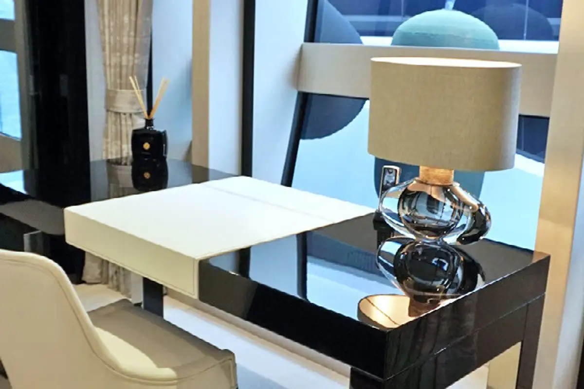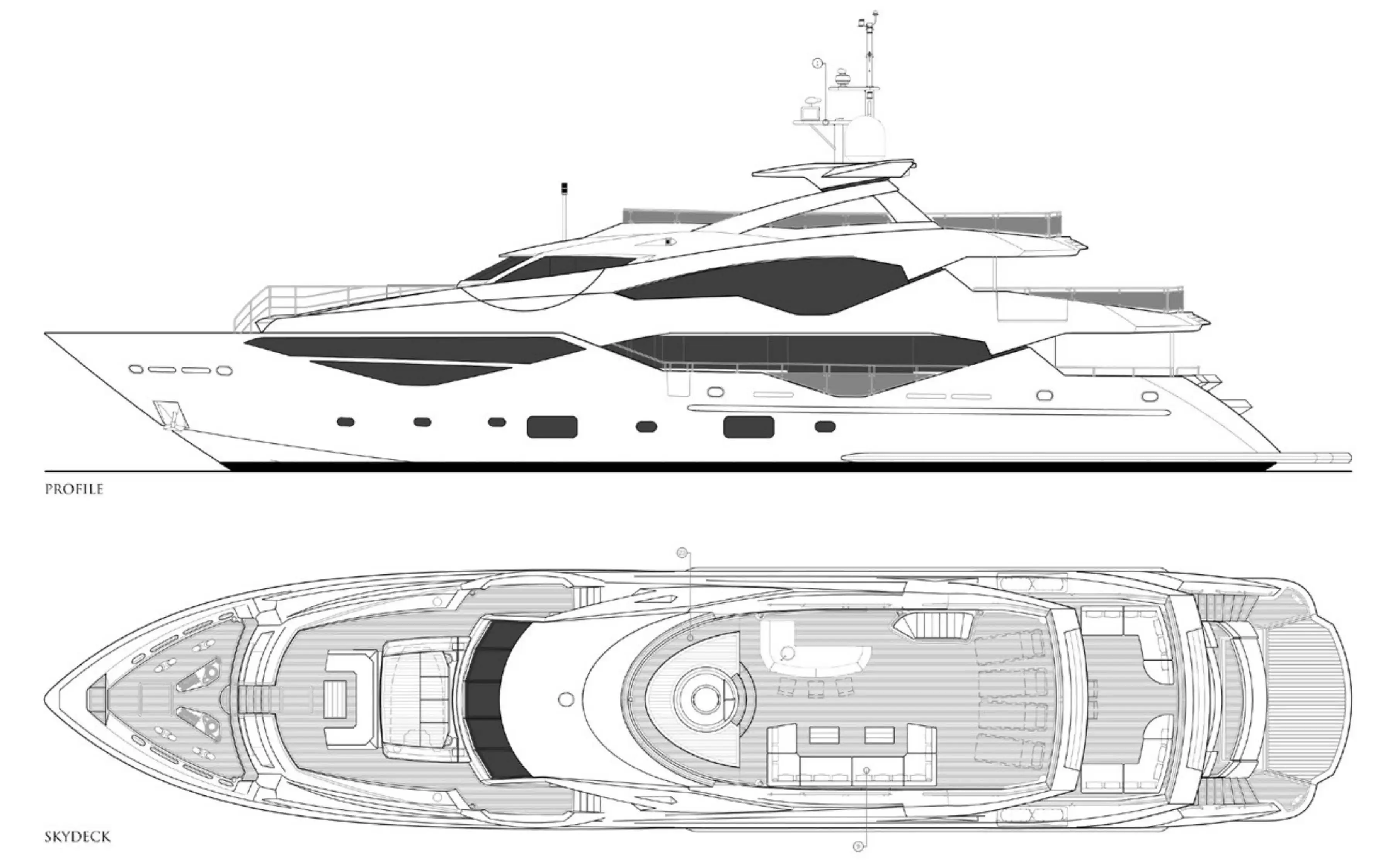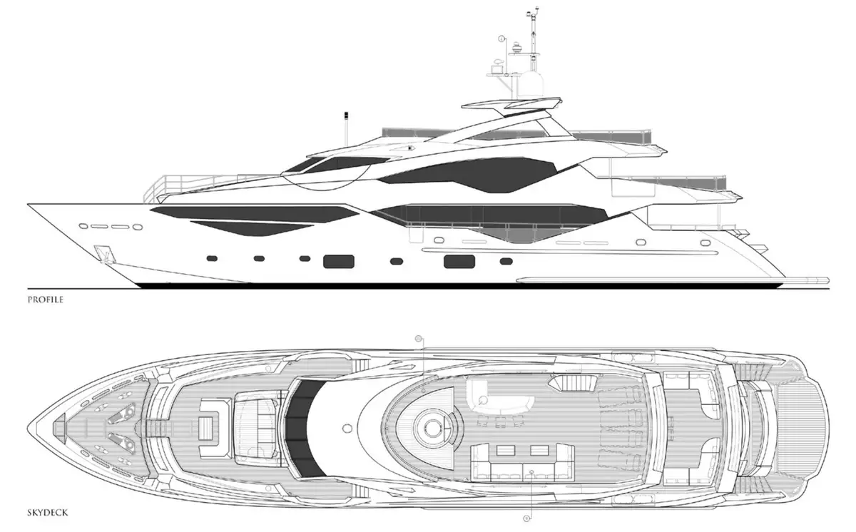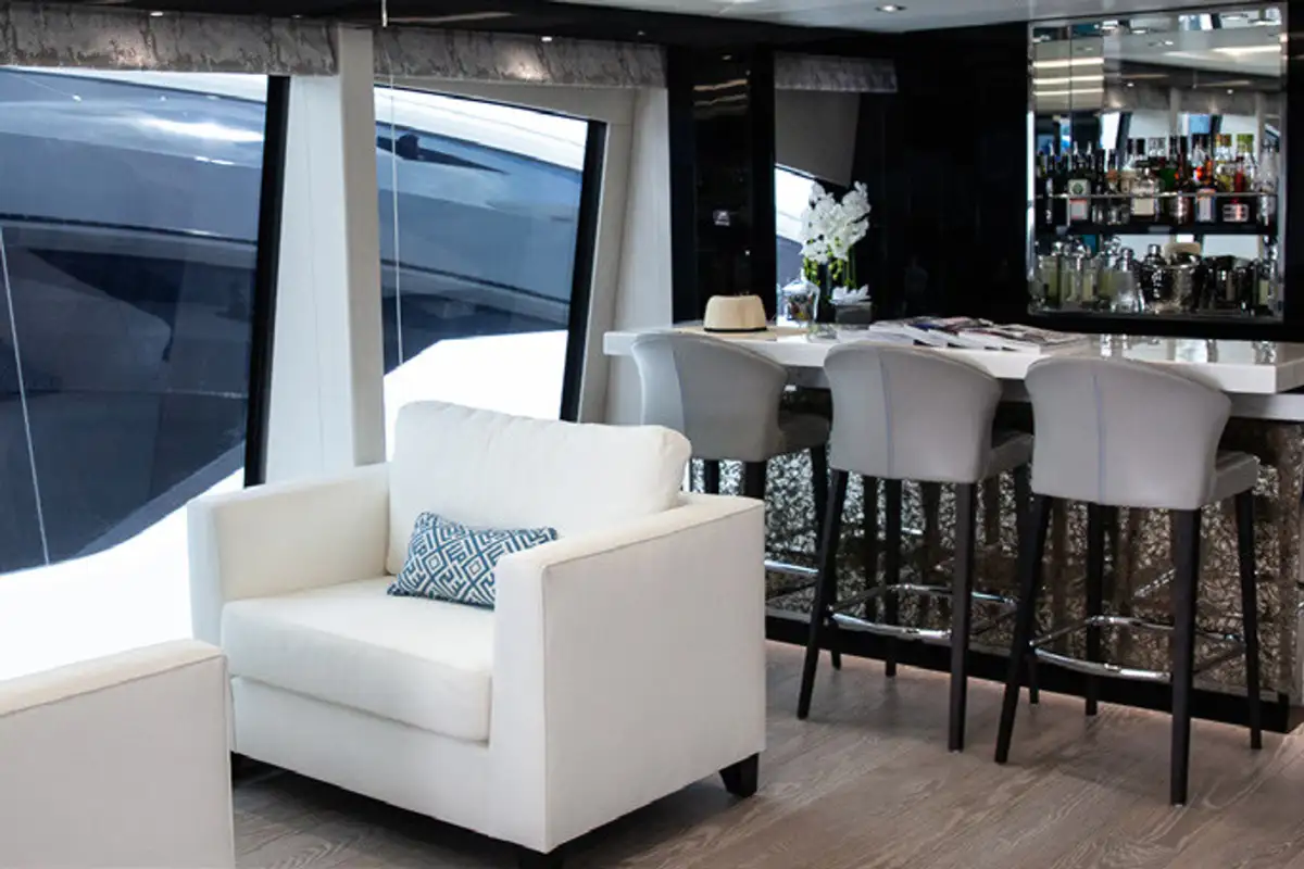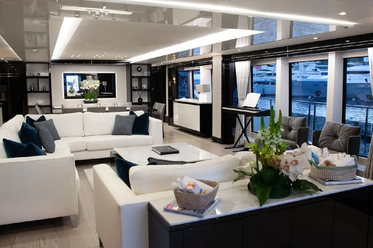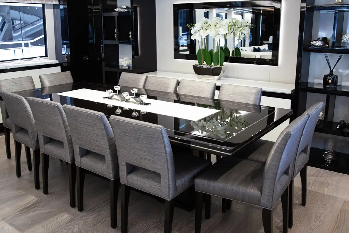 The yacht has high contrast contemporary interiors. Black and soft grey furnishings are flooded with natural light thanks floor to ceiling windows in the lounge paired with rich fabrics and modern furniture. The sky lounge offers a comfortable seating area and beautifully designed bar. A large table is located on the bridge deck aft, the ideal spot for a lazy breakfast with panoramic views or al fresco dining. The foredeck also offers a cosy Portuguese bridge with sun pads and an intimate dining area for those looking for privacy, especially while in port.
