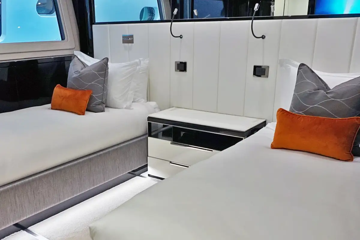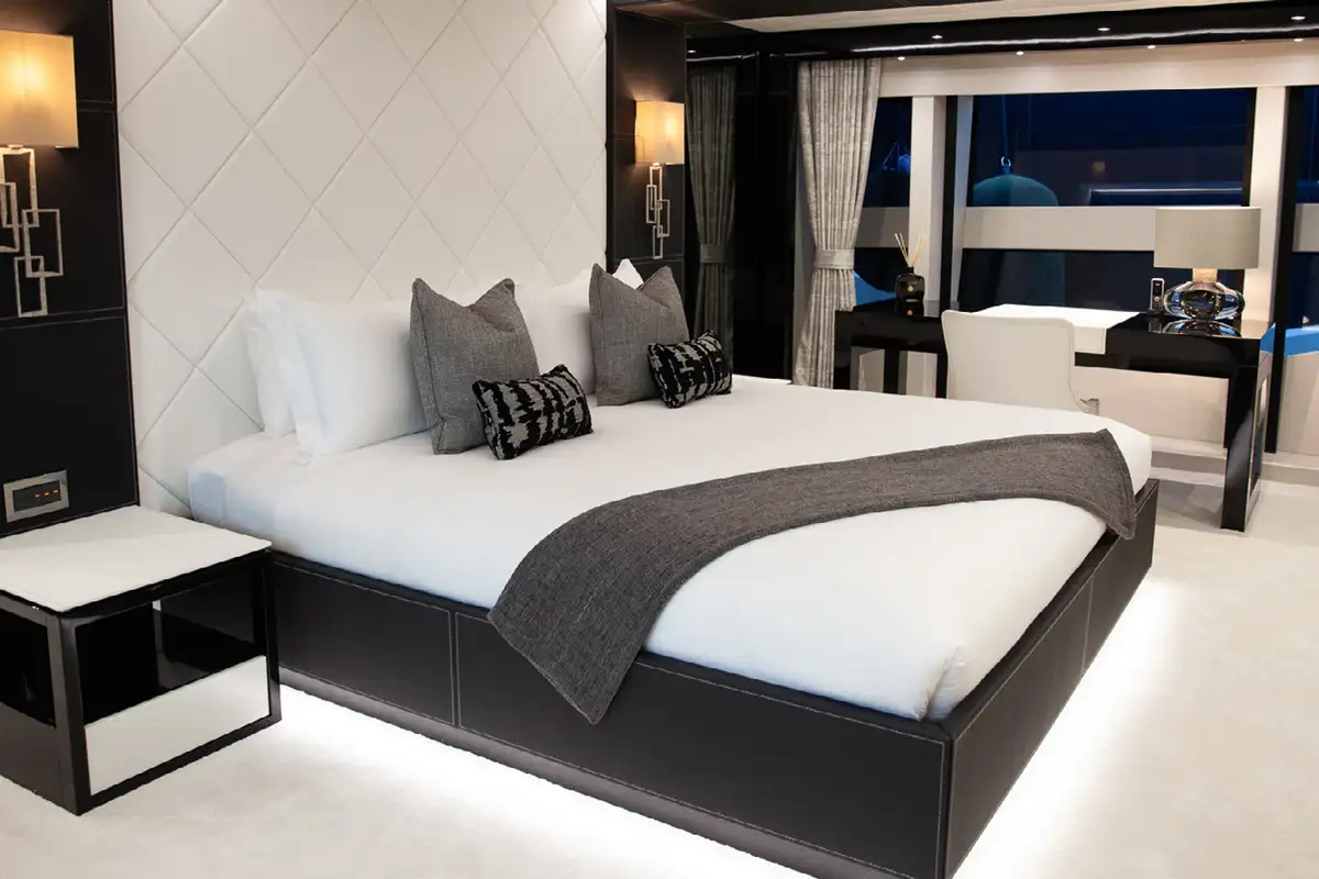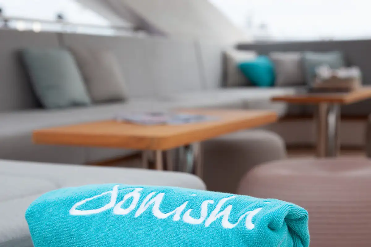 The guest cabins are spacious and luxuriously appointed. These include a full beam master suite on the main deck and four more guest cabins on the lower deck comprising of two double cabins and two twins that can convert into doubles. With her ideal charter layout, fully customised interior and all the latest AV systems throughout, SONISHI is sure to please.