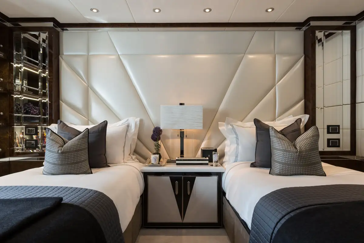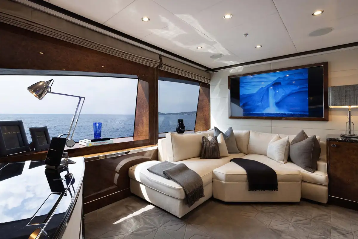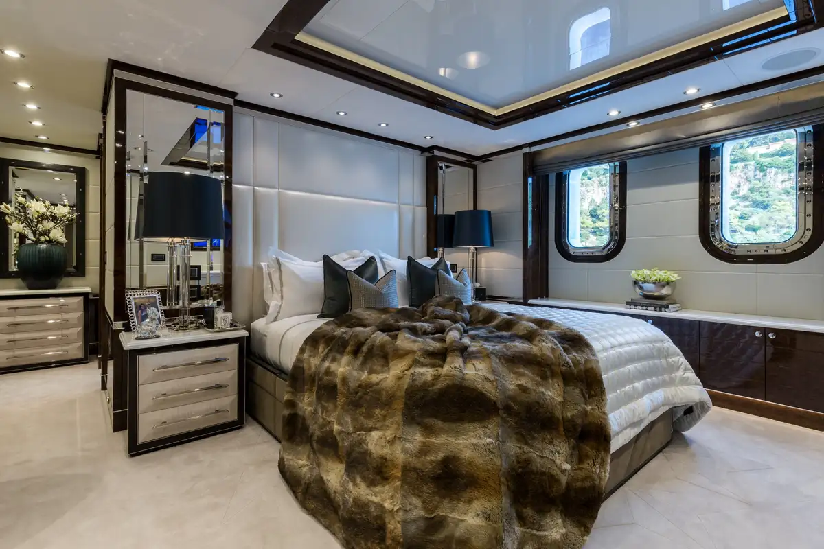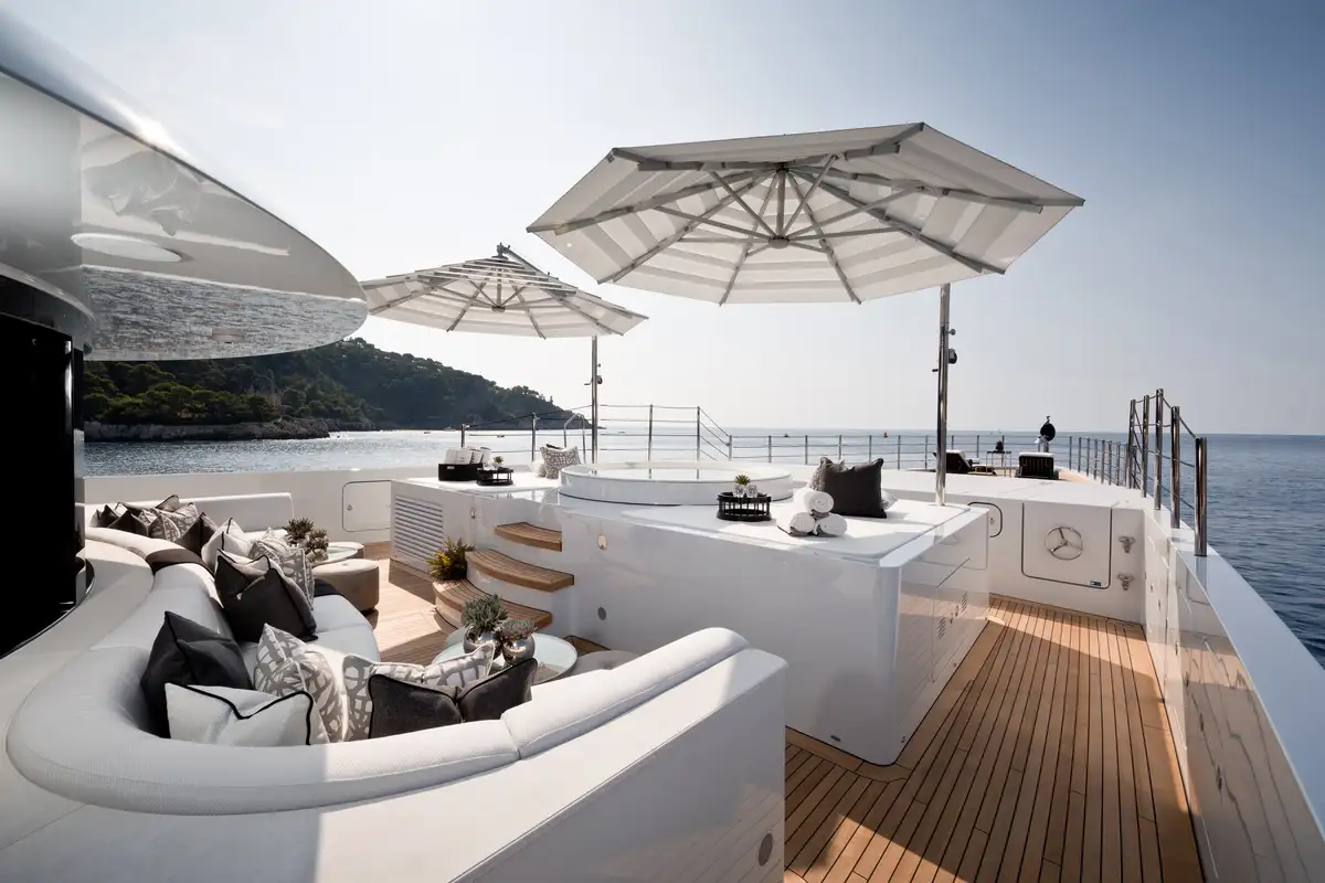 She offers flexible accommodation that is ideal for family groups. The full-beam VIP suite sits on the main deck and is as large as the master, with its own, separate lounge and spacious bathroom. The master is on the upper deck and comes complete with its own private deck and 180 degree views, jet pool and sunbathing area. There is also a nursery room with a cot adjacent to the master. The four other guest cabins are on the lower deck and are all doubles, though two can convert to twins if preferred.