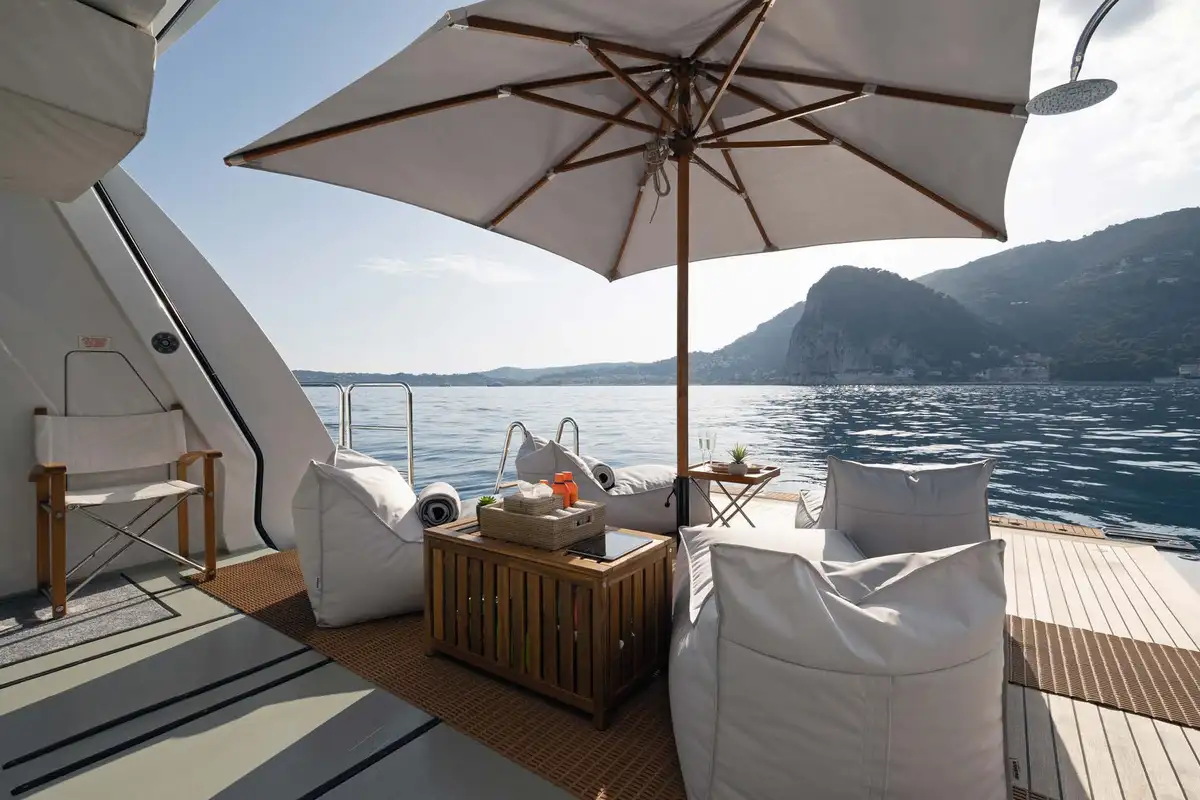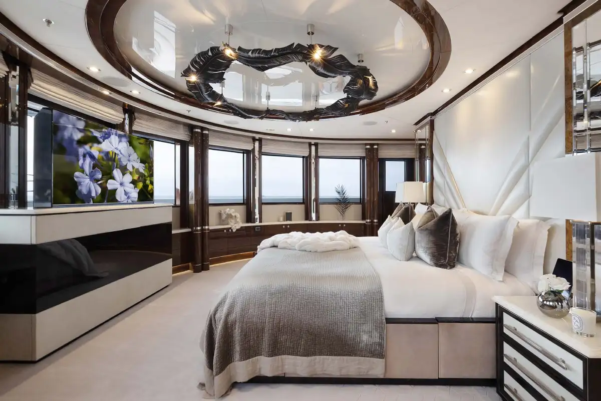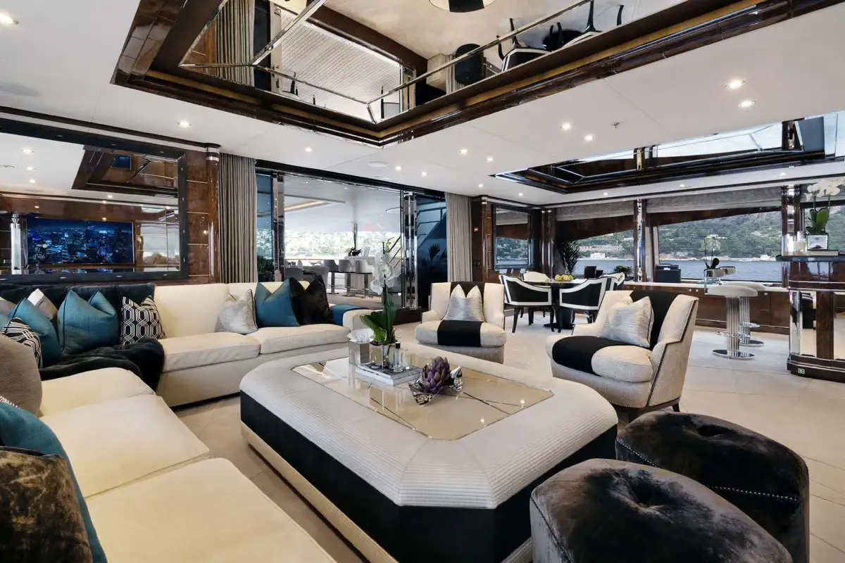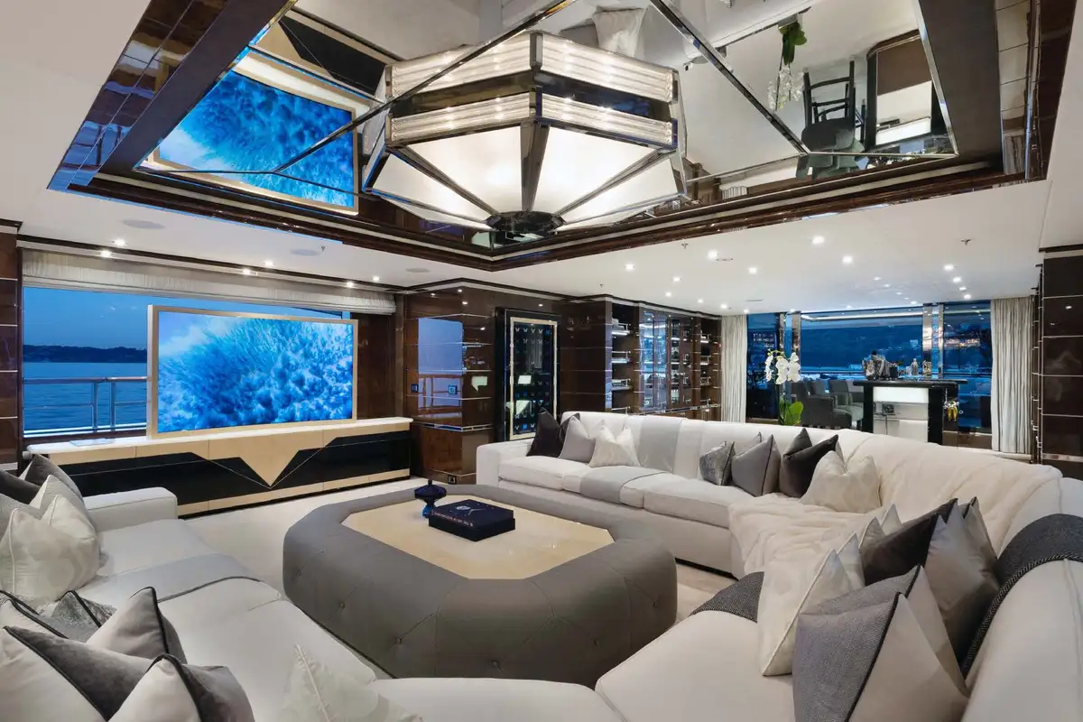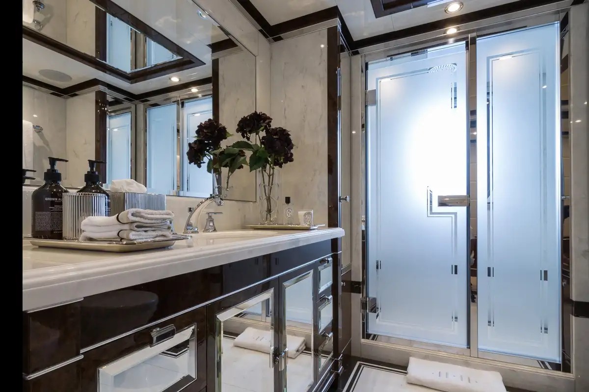 She offers flexible accommodation that is ideal for family groups. The full-beam VIP suite sits on the main deck and is as large as the master, with its own, separate lounge and spacious bathroom. The master is on the upper deck and comes complete with its own private deck and 180 degree views, jet pool and sunbathing area. There is also a nursery room with a cot adjacent to the master. The four other guest cabins are on the lower deck and are all doubles, though two can convert to twins if preferred.
