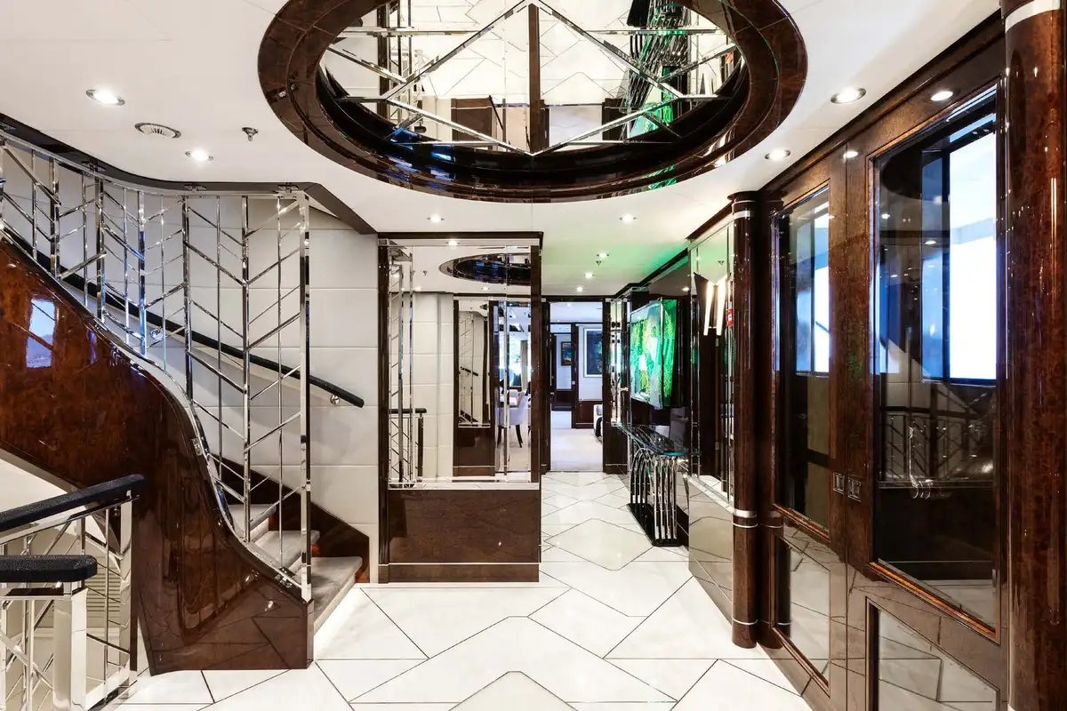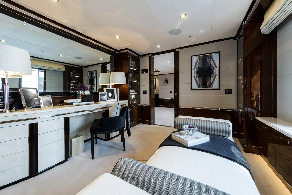 She possesses a striking axe bow with vertical blade, a feature which enhances the fuel efficiency of this world cruiser. Crafted by the owner's personal design team, her interiors draw inspiration from the Art Deco period, combining cool beiges, dark browns, whites and creams accented with textured fabrics and hand crafted, one-of-a-kind pieces throughout.