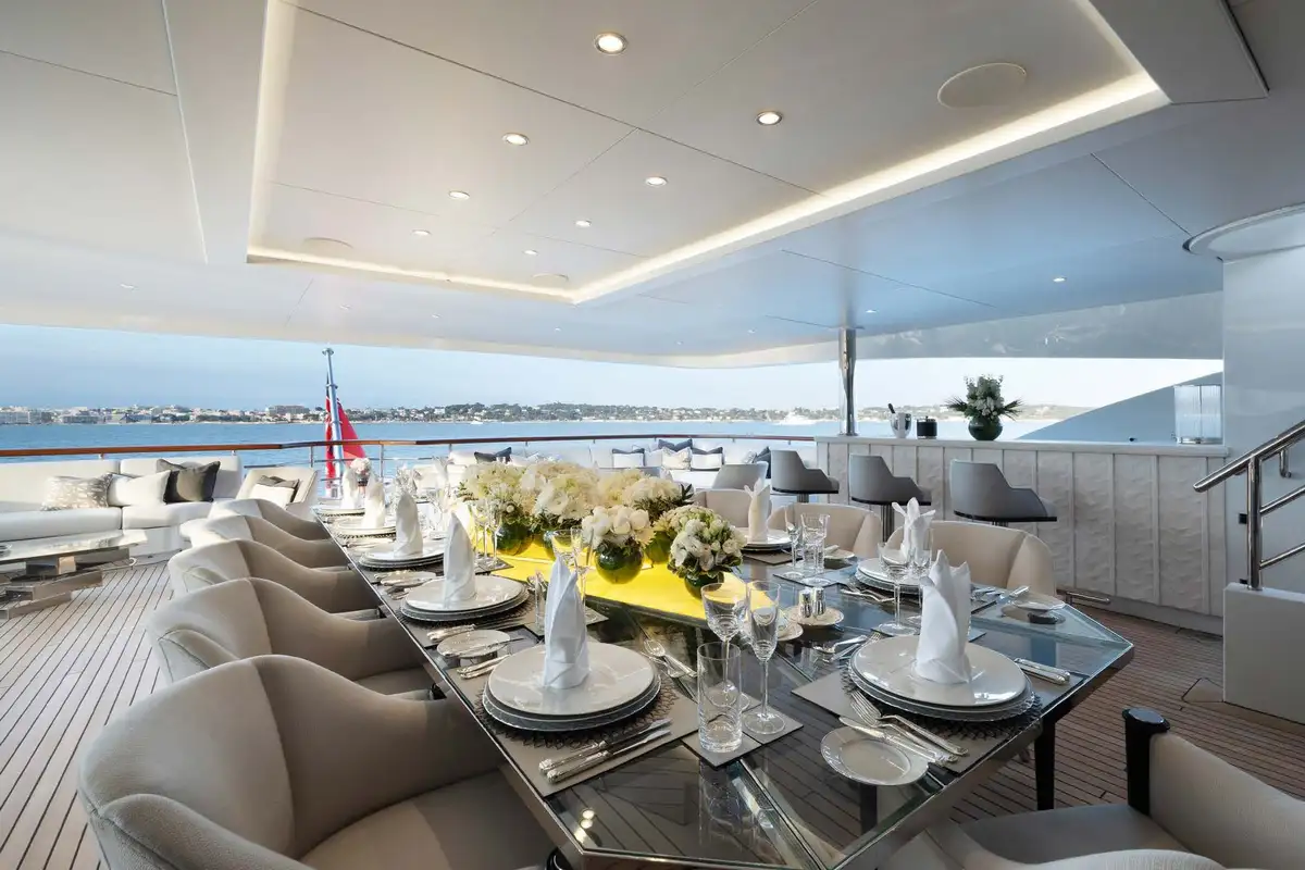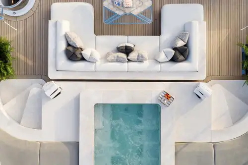 The exteriors are extremely well designed, offering a variety of areas to enjoy throughout the day: a split-level sundeck with large jacuzzi pool, bar, seating and sunbathing, dining on the upper deck aft and a very welcoming exterior lounge on the main deck aft.
