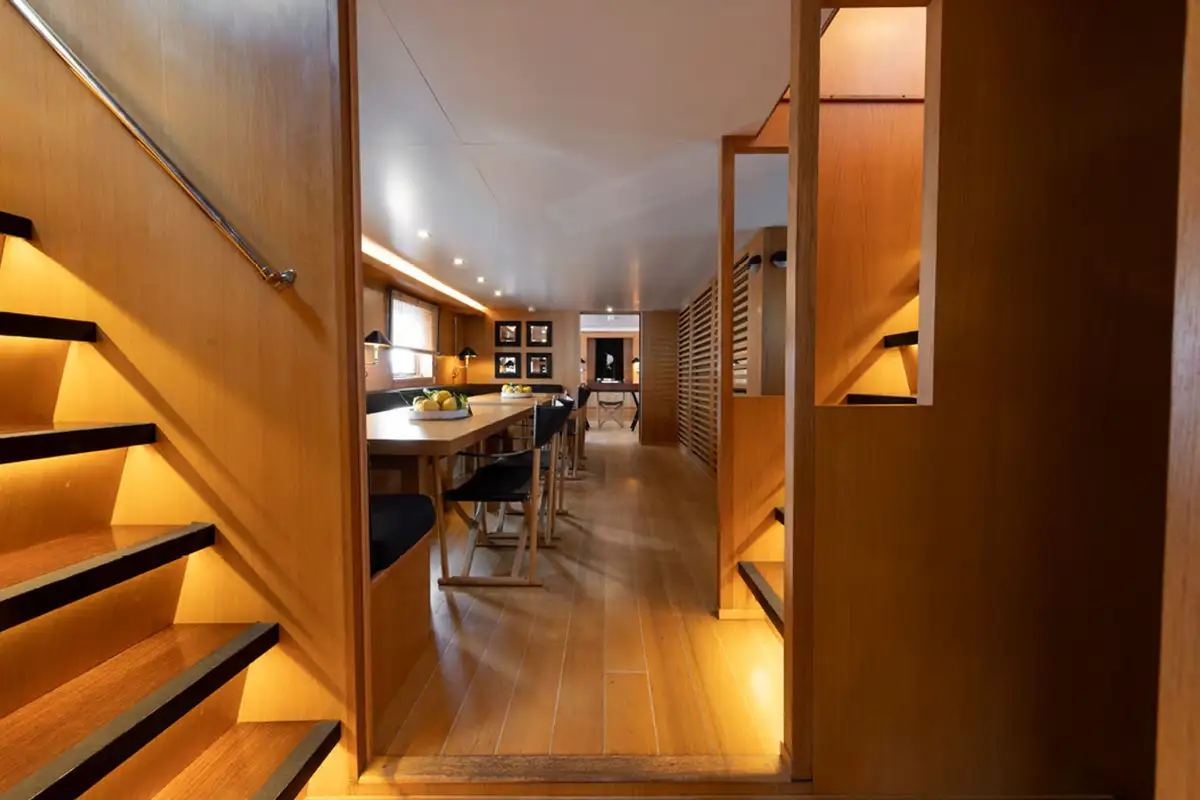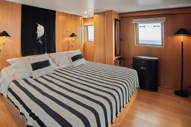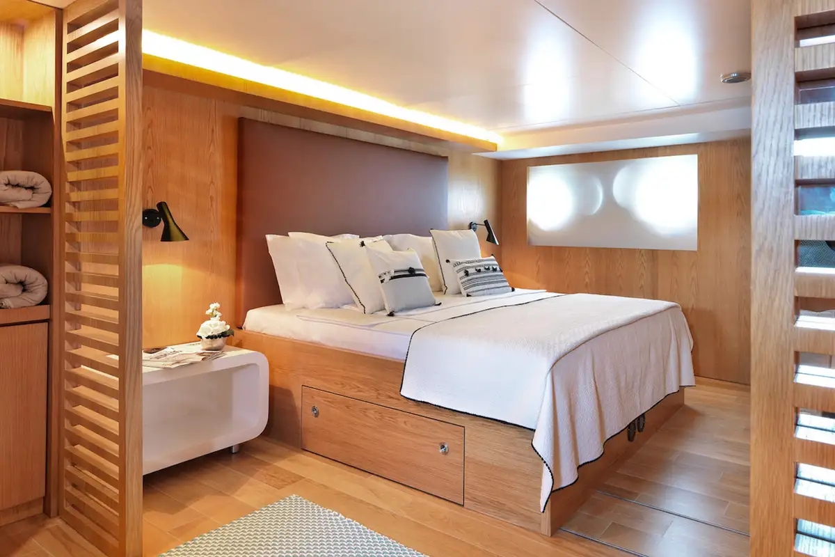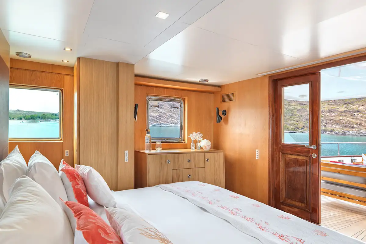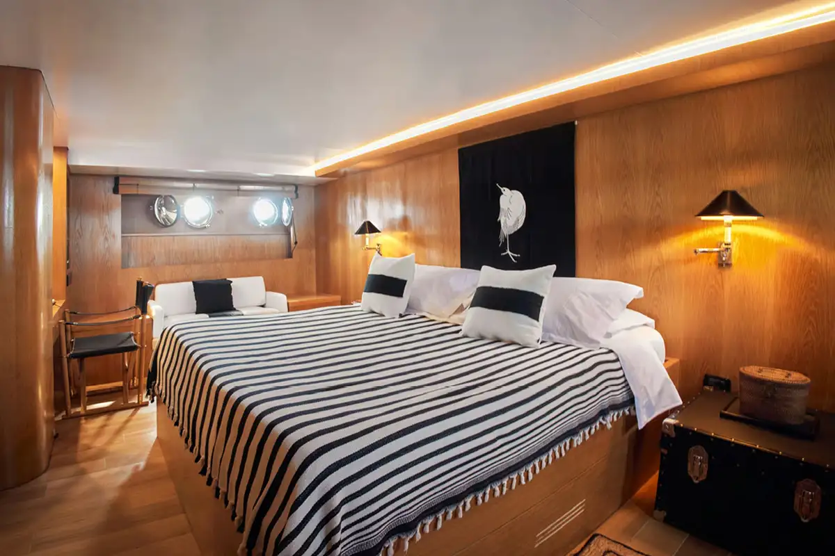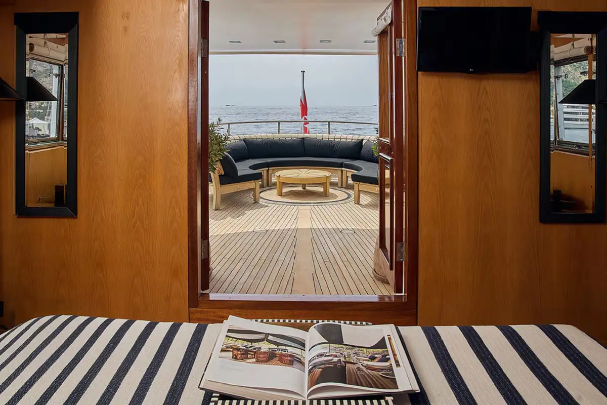 Accommodation is provided for up to 10 guests in four well-appointed cabins. A standout feature is the upper-deck master stateroom, which enjoys direct access to a private aft terrace, ideal for morning coffees or sunset drinks. A second master suite lies forward on the lower deck, accompanied by a spacious VIP double and a twin cabin, all with en suite facilities and a harmonious design scheme.