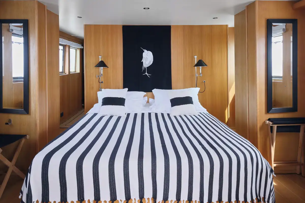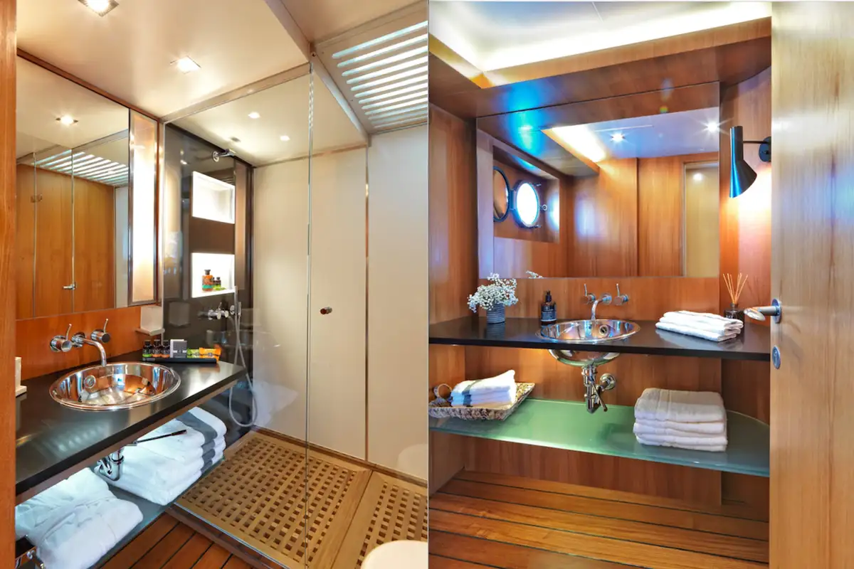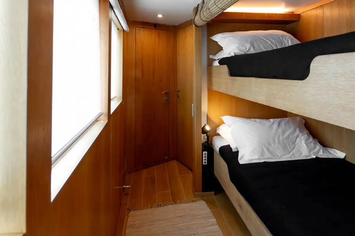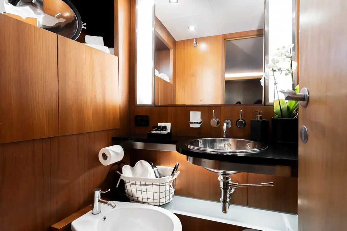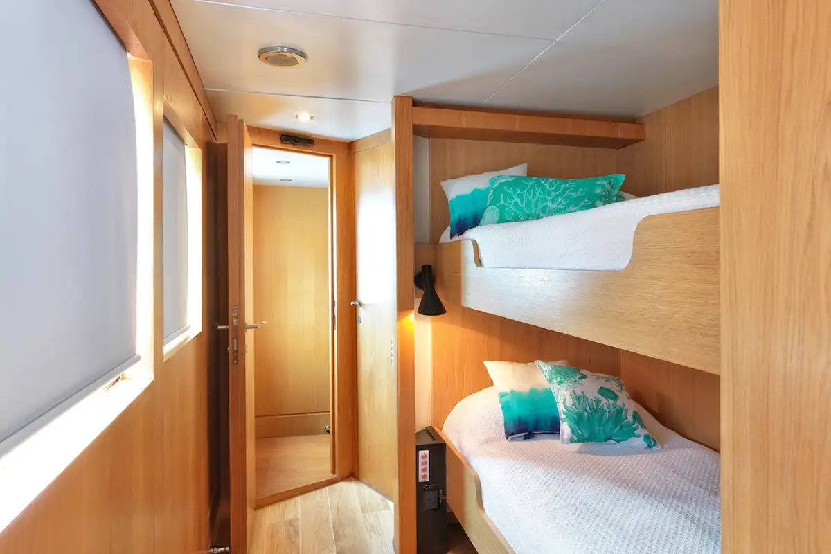 Accommodation is provided for up to 10 guests in four well-appointed cabins. A standout feature is the upper-deck master stateroom, which enjoys direct access to a private aft terrace, ideal for morning coffees or sunset drinks. A second master suite lies forward on the lower deck, accompanied by a spacious VIP double and a twin cabin, all with en suite facilities and a harmonious design scheme.