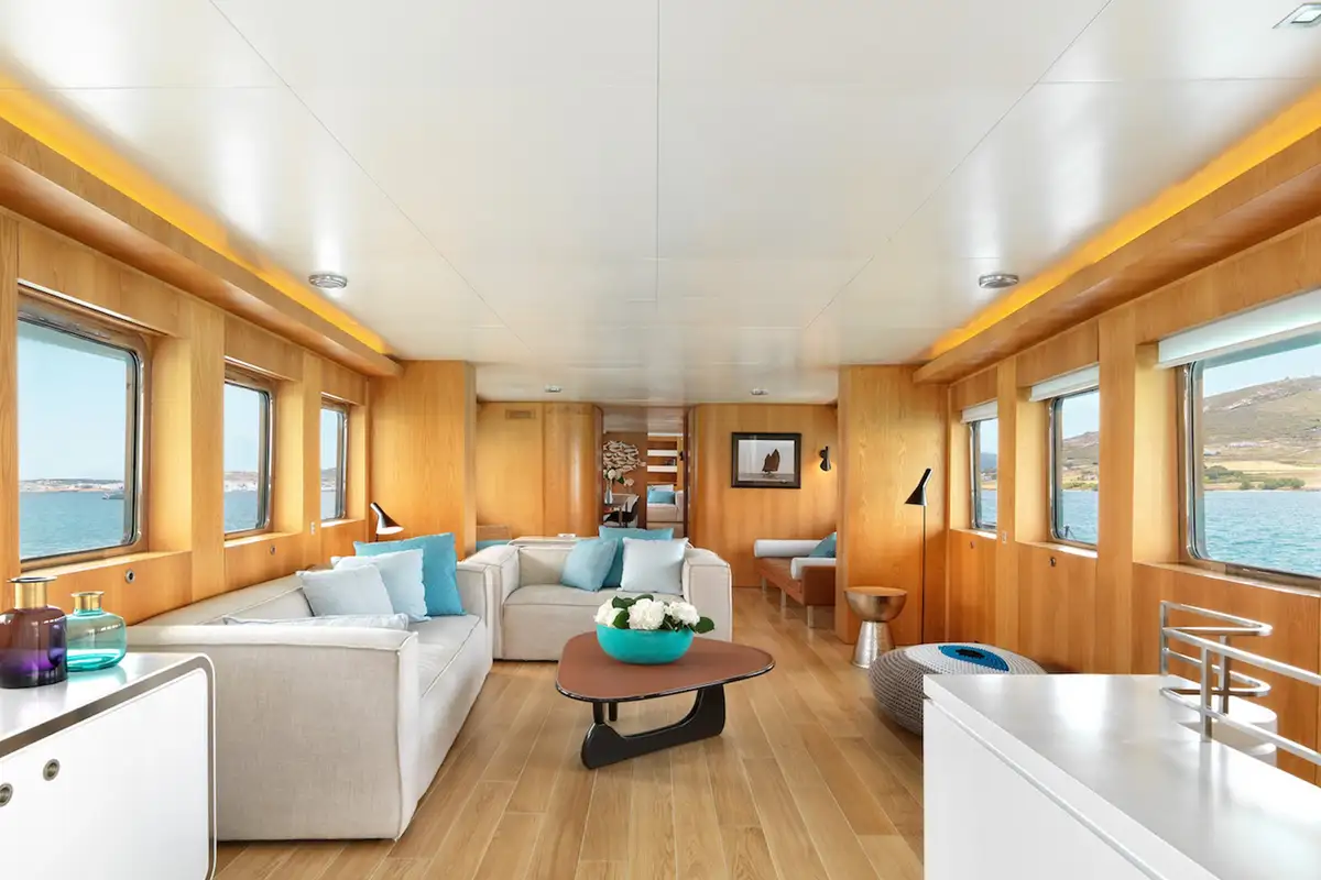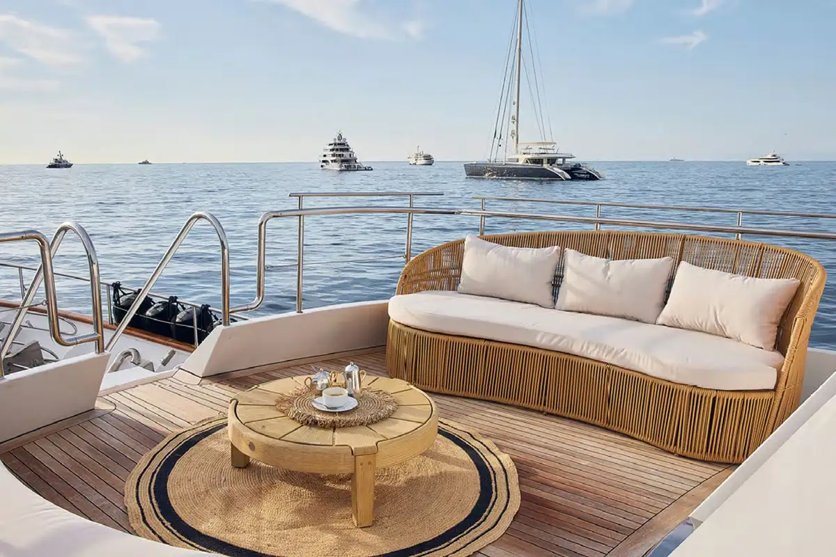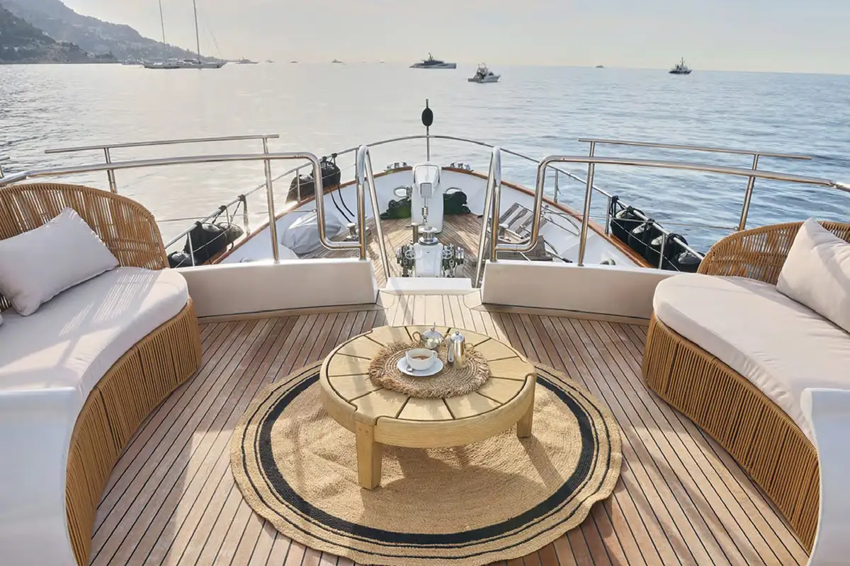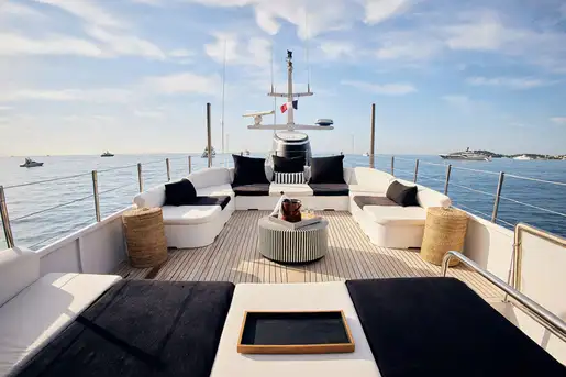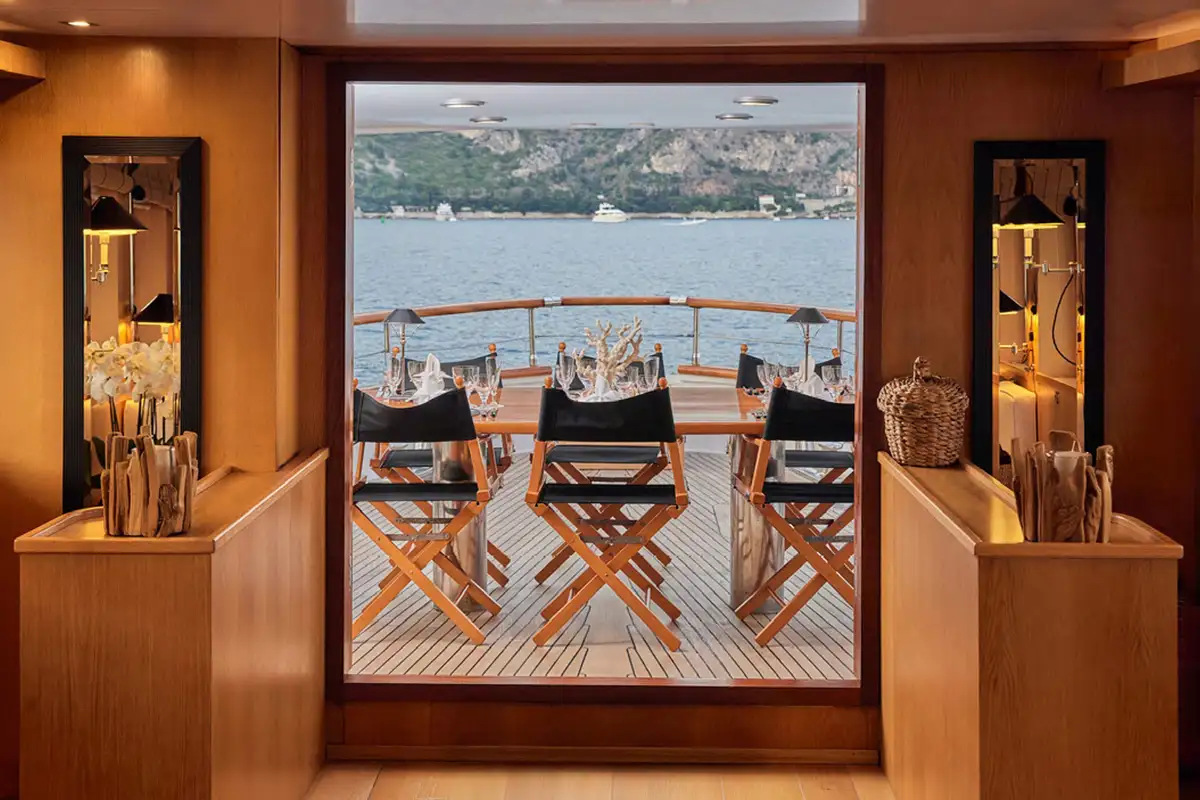 Her recent interior transformation has introduced a bright, open-plan aesthetic, with honey-toned wood panelling, crisp white furnishings, and vibrant turquoise accents lending a fresh and welcoming atmosphere throughout. Spread across three levels, the tri-deck configuration allows for effortless flow between expansive exterior lounges, shaded dining spaces, and sun-drenched terraces.
