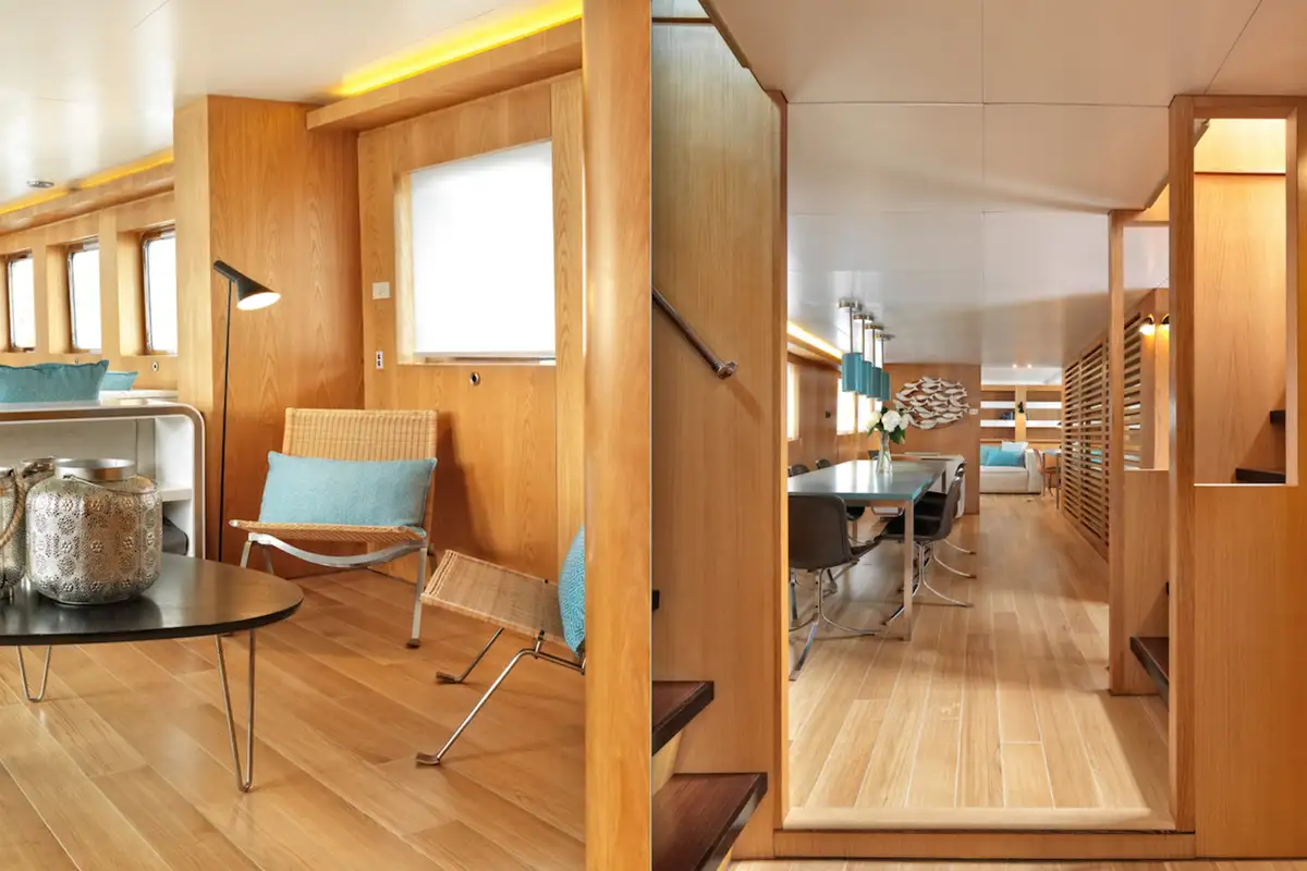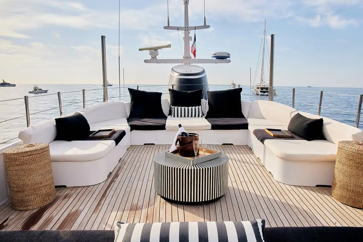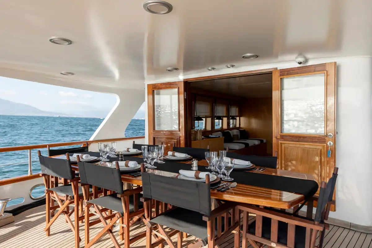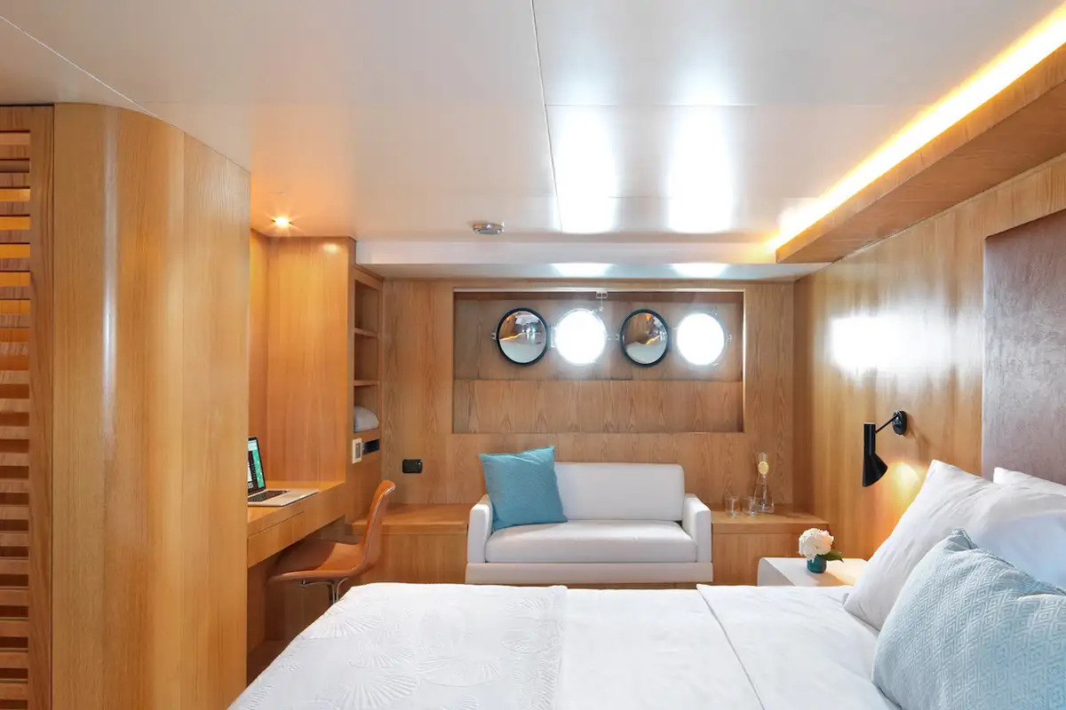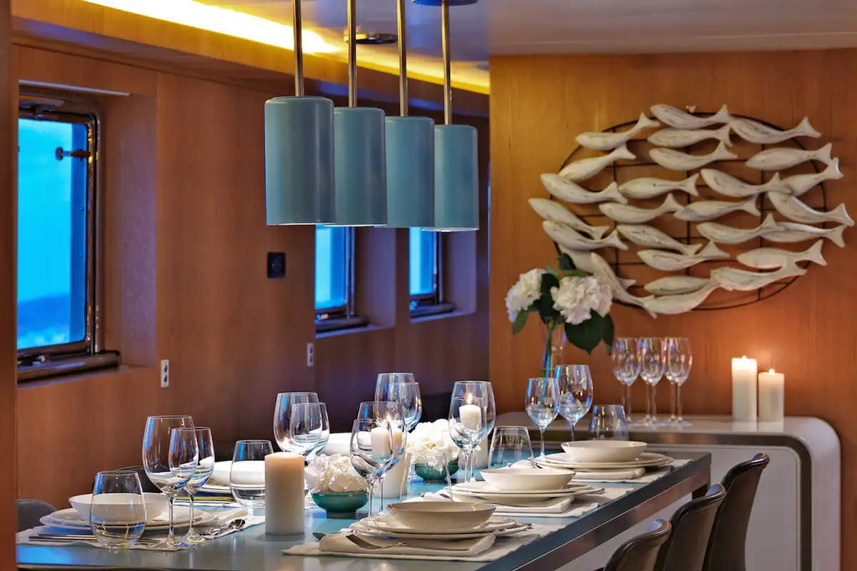 Her recent interior transformation has introduced a bright, open-plan aesthetic, with honey-toned wood panelling, crisp white furnishings, and vibrant turquoise accents lending a fresh and welcoming atmosphere throughout. Spread across three levels, the tri-deck configuration allows for effortless flow between expansive exterior lounges, shaded dining spaces, and sun-drenched terraces.