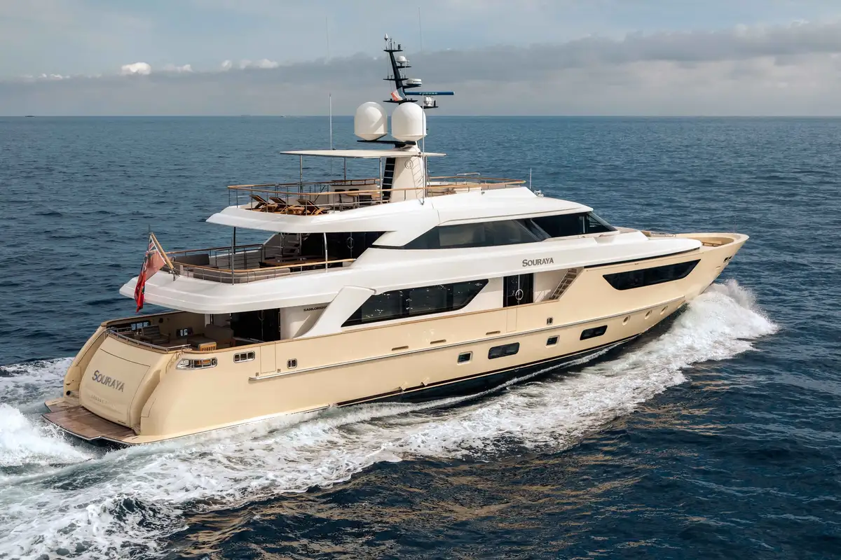 Welcome aboard SOURAYA 38m (125ft), a stunning Sanlorenzo yacht that offers contemporary style, palatial comfort and generous space for you to make the most of your time on the water. From the al fresco dining area, jacuzzi and generous sunpads on the sundeck, down to the tender garage brimming with watersports equipment, your experience on board SOURAYA will be both memorable and special.