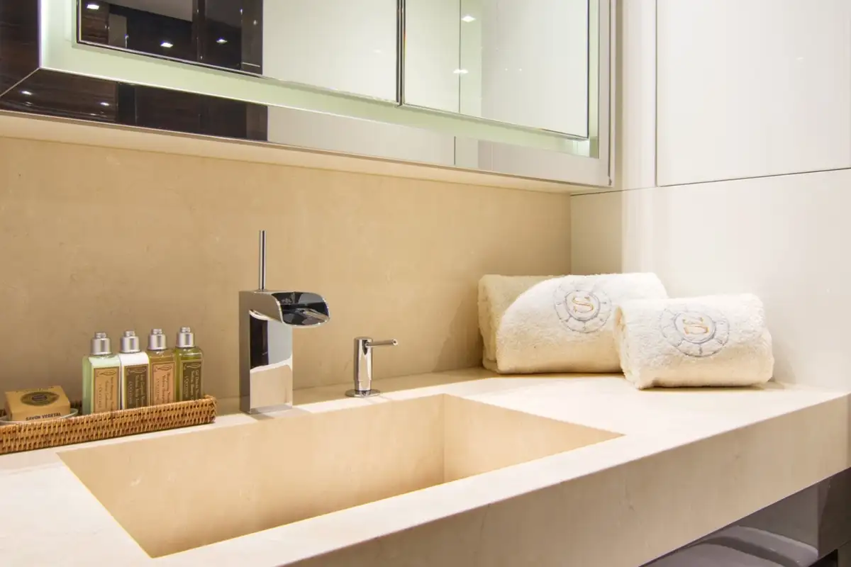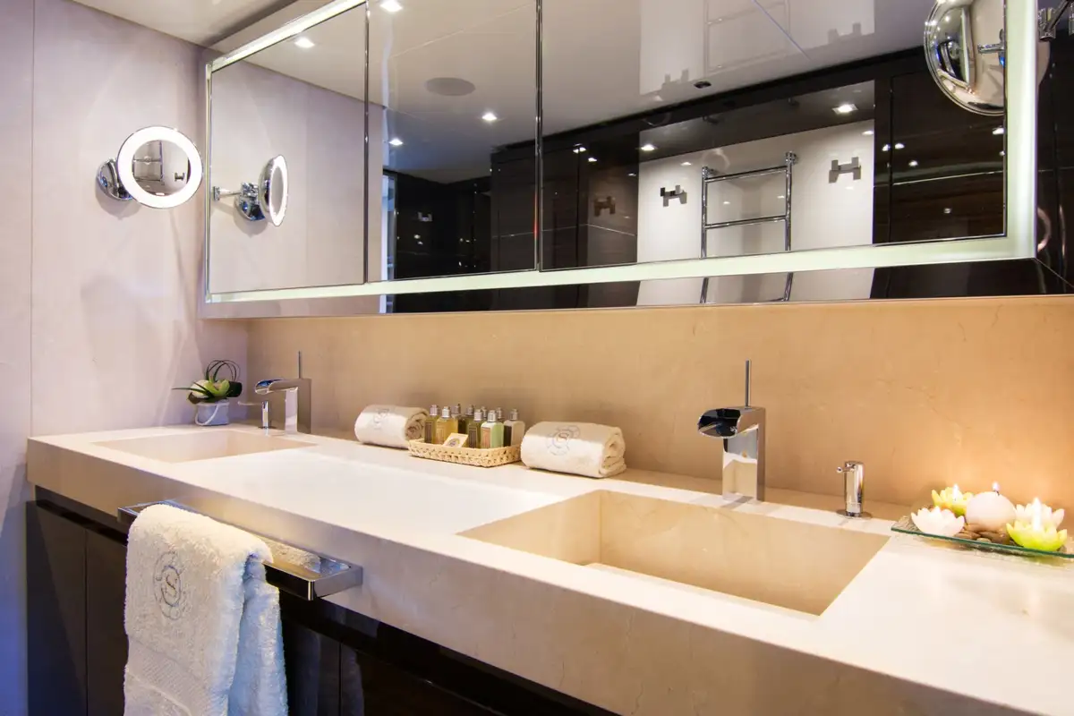 SOURAYA’s five guest suites are designed to be contemporary havens of relaxation for you and your guests to wind down. Your full-beam main deck master suite is accessed via a private office and dressing room. This stylish space benefits from large picture windows on each side, allowing you to appreciate your surroundings while freshening up. It also features a full-beam en suite bathroom with his and hers sinks, shower and bath areas.