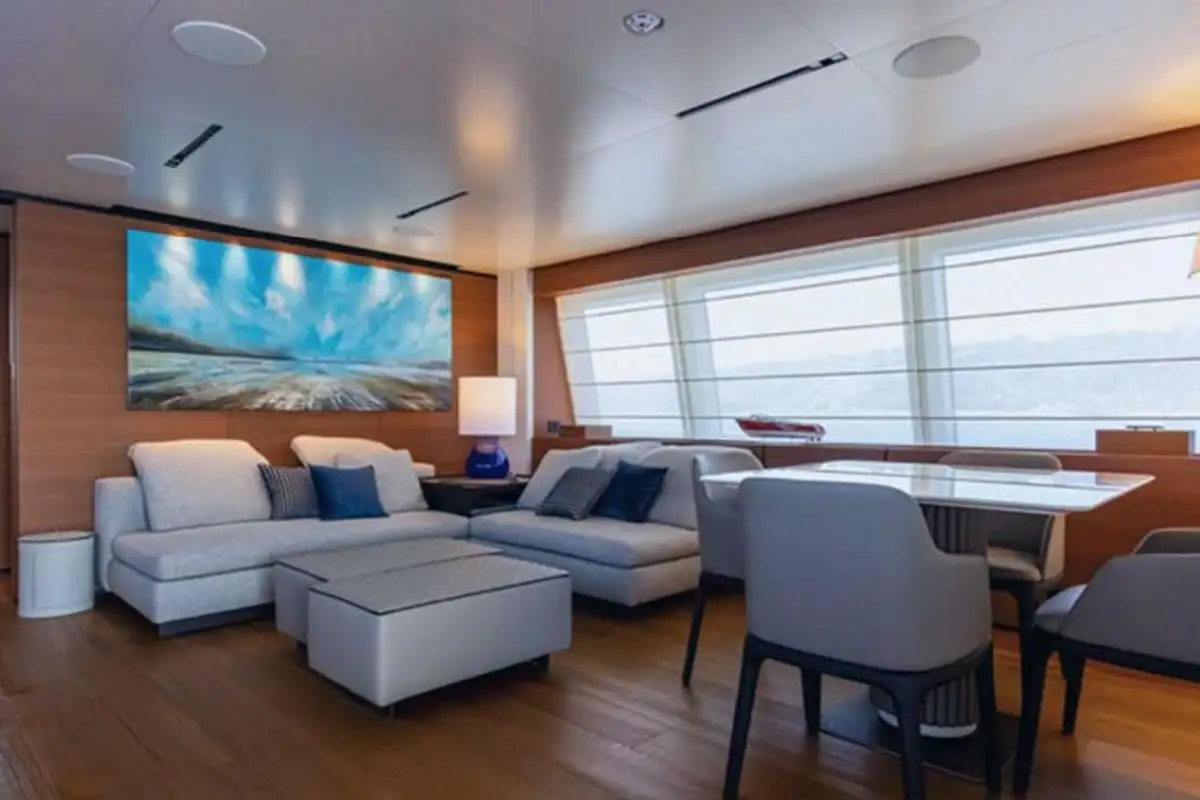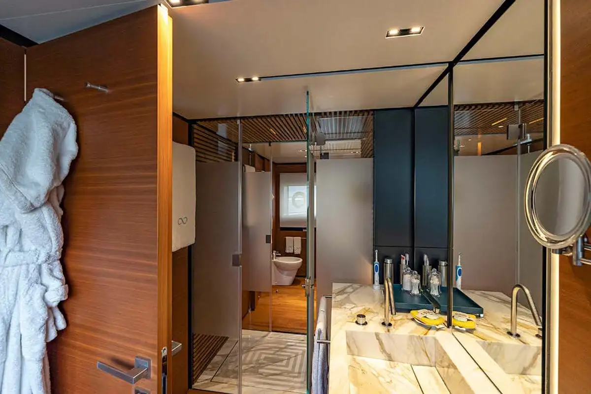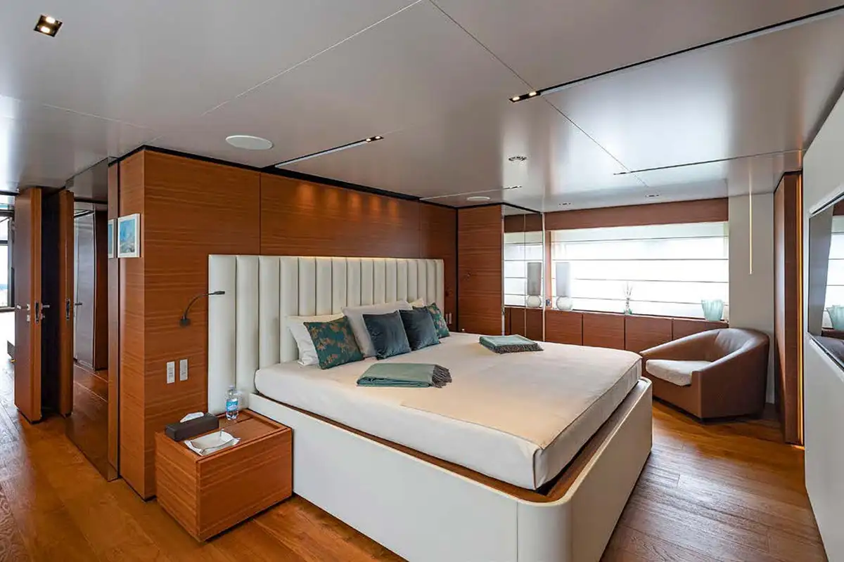 Inside, the areas dedicated to the family and their guests open up on all 4 decks, from the wide-body Master suite forward on the main deck to the 4 guest cabins below. She accommodates up to 11 guests. The light-filled salon comes with a formal dining area. The Upper deck offers complete privacy and features a dining table, grill, and a large sofa. The sun deck features a Jacuzzi and sun loungers, as well as a conversation area with a comfortable sofa and a coffee table. SOUTH offers an extensive selection of water toys. The stabilizers ensure that everyone can enjoy the view and the on board experience both while cruising and when at rest. It's no surprise that she is the ideal yacht for a charter in the Mediterranean. The crew of 6 dynamic and experienced members is ready to make sure that your vacation aboard SOUTH is nothing short of perfection.