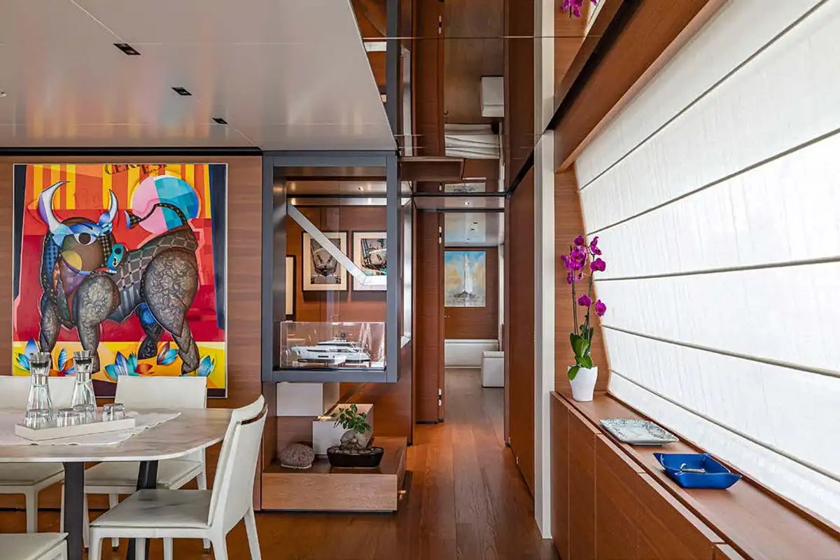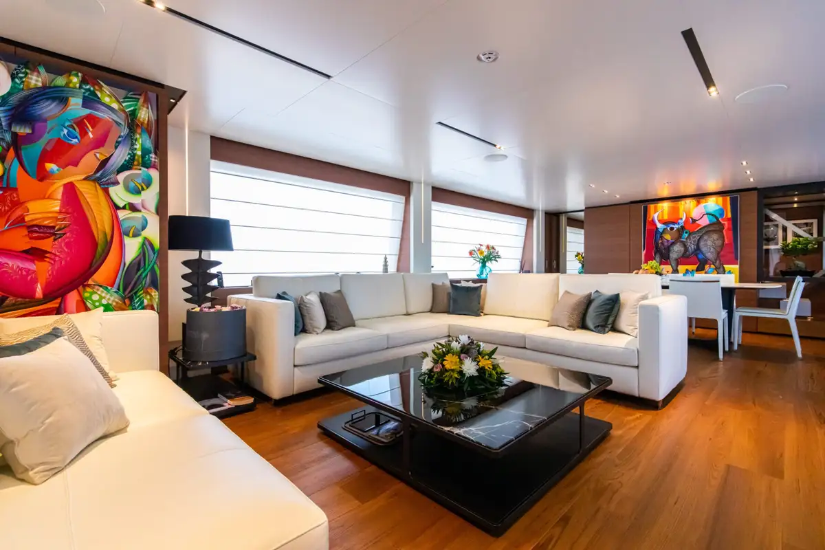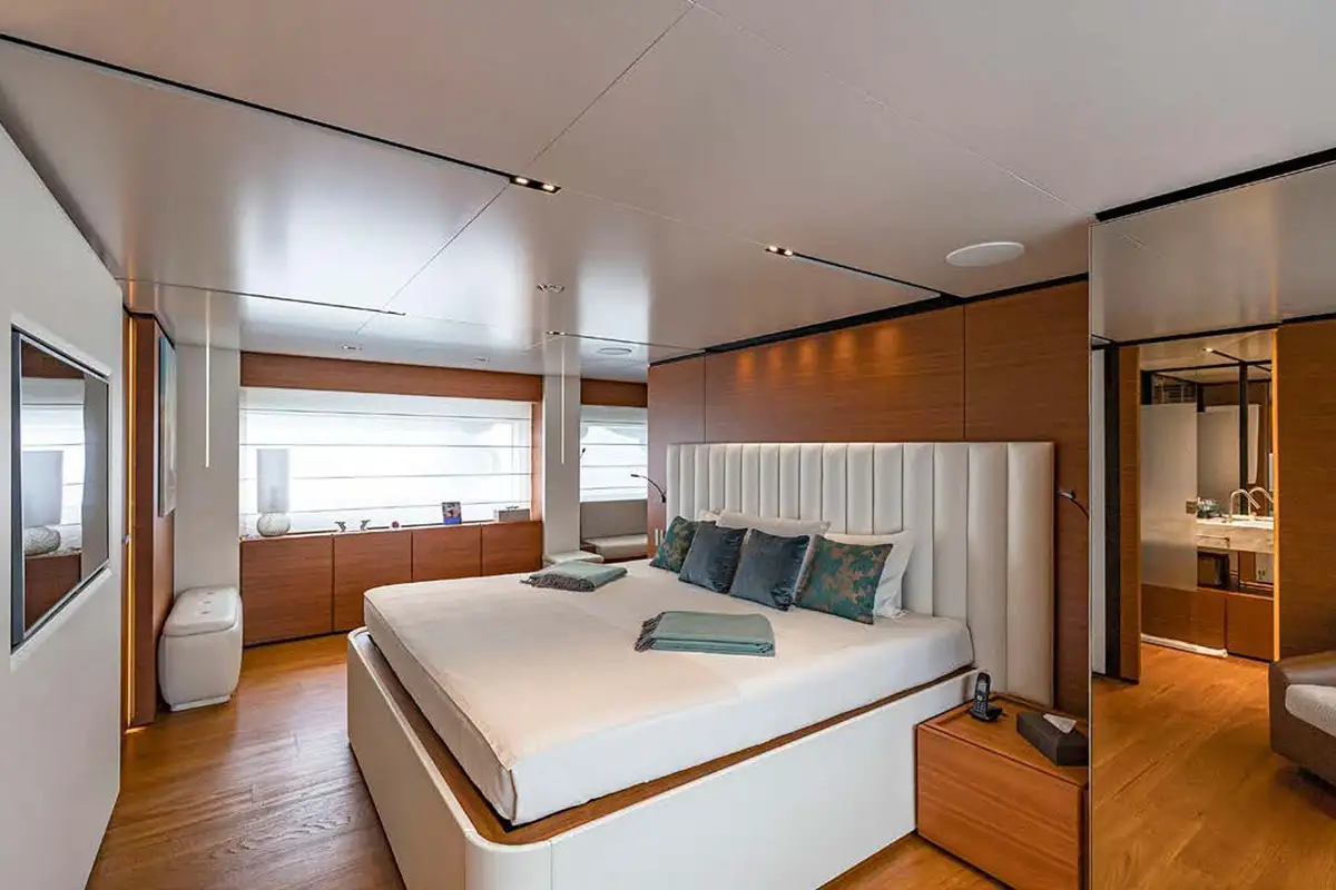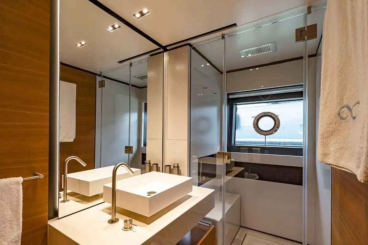 Inside, the areas dedicated to the family and their guests open up on all 4 decks, from the wide-body Master suite forward on the main deck to the 4 guest cabins below. She accommodates up to 11 guests. The light-filled salon comes with a formal dining area. The Upper deck offers complete privacy and features a dining table, grill, and a large sofa. The sun deck features a Jacuzzi and sun loungers, as well as a conversation area with a comfortable sofa and a coffee table. SOUTH offers an extensive selection of water toys. The stabilizers ensure that everyone can enjoy the view and the on board experience both while cruising and when at rest. It's no surprise that she is the ideal yacht for a charter in the Mediterranean. The crew of 6 dynamic and experienced members is ready to make sure that your vacation aboard SOUTH is nothing short of perfection.