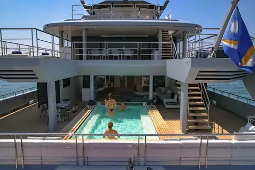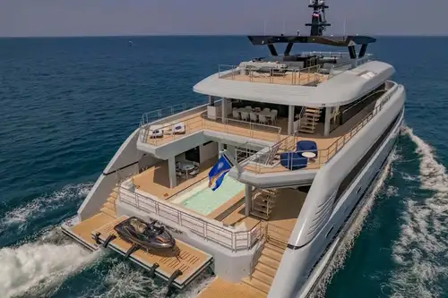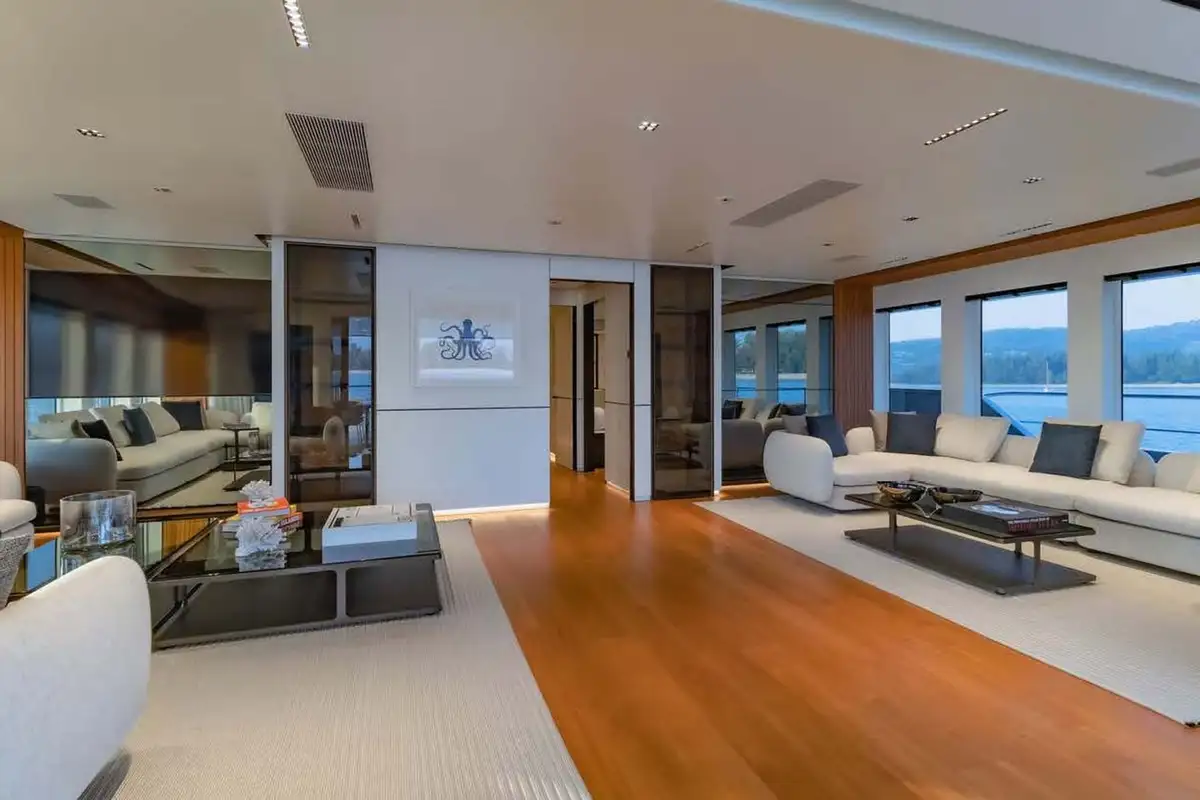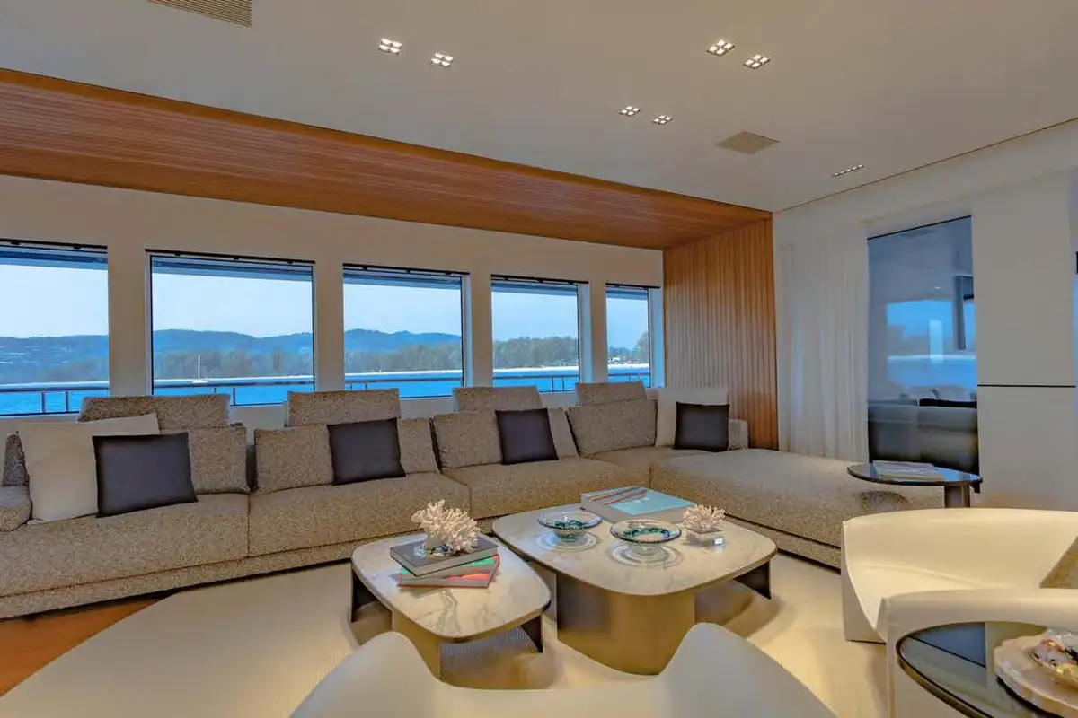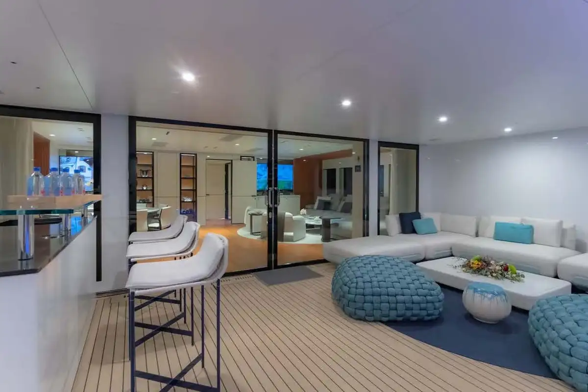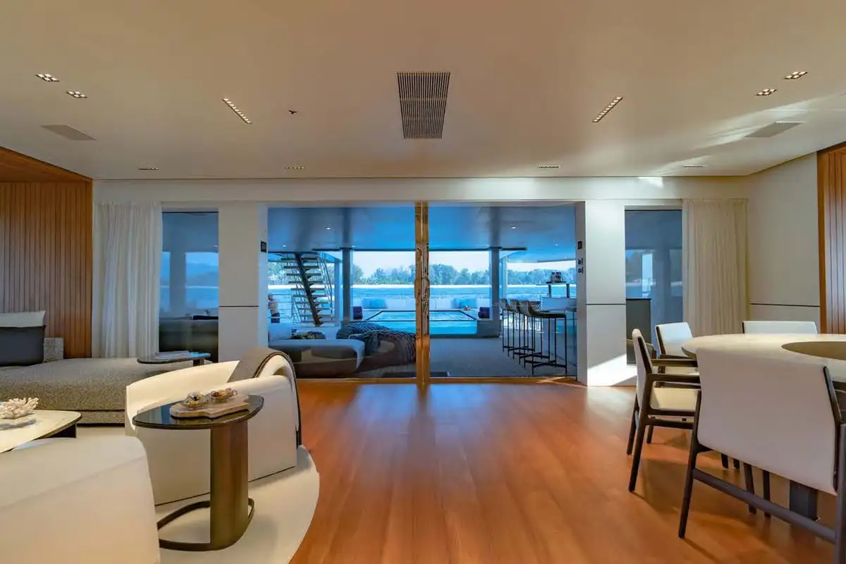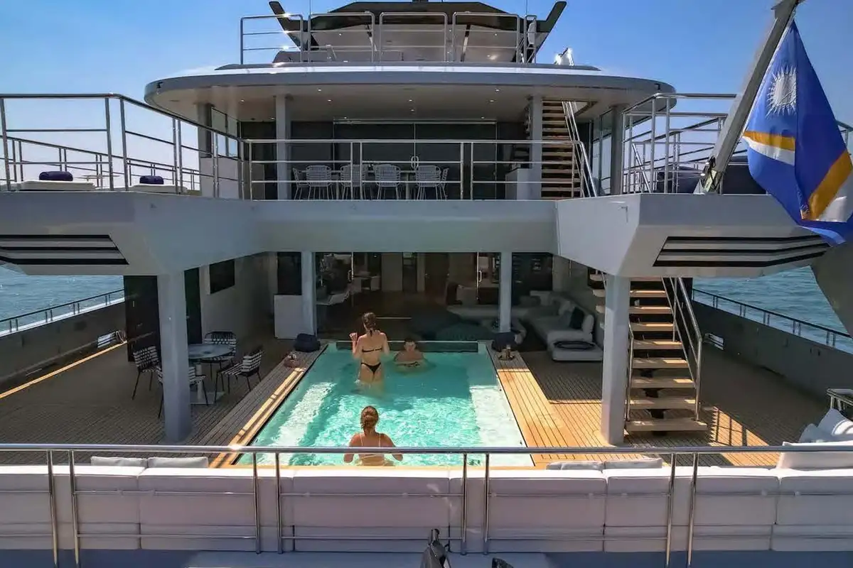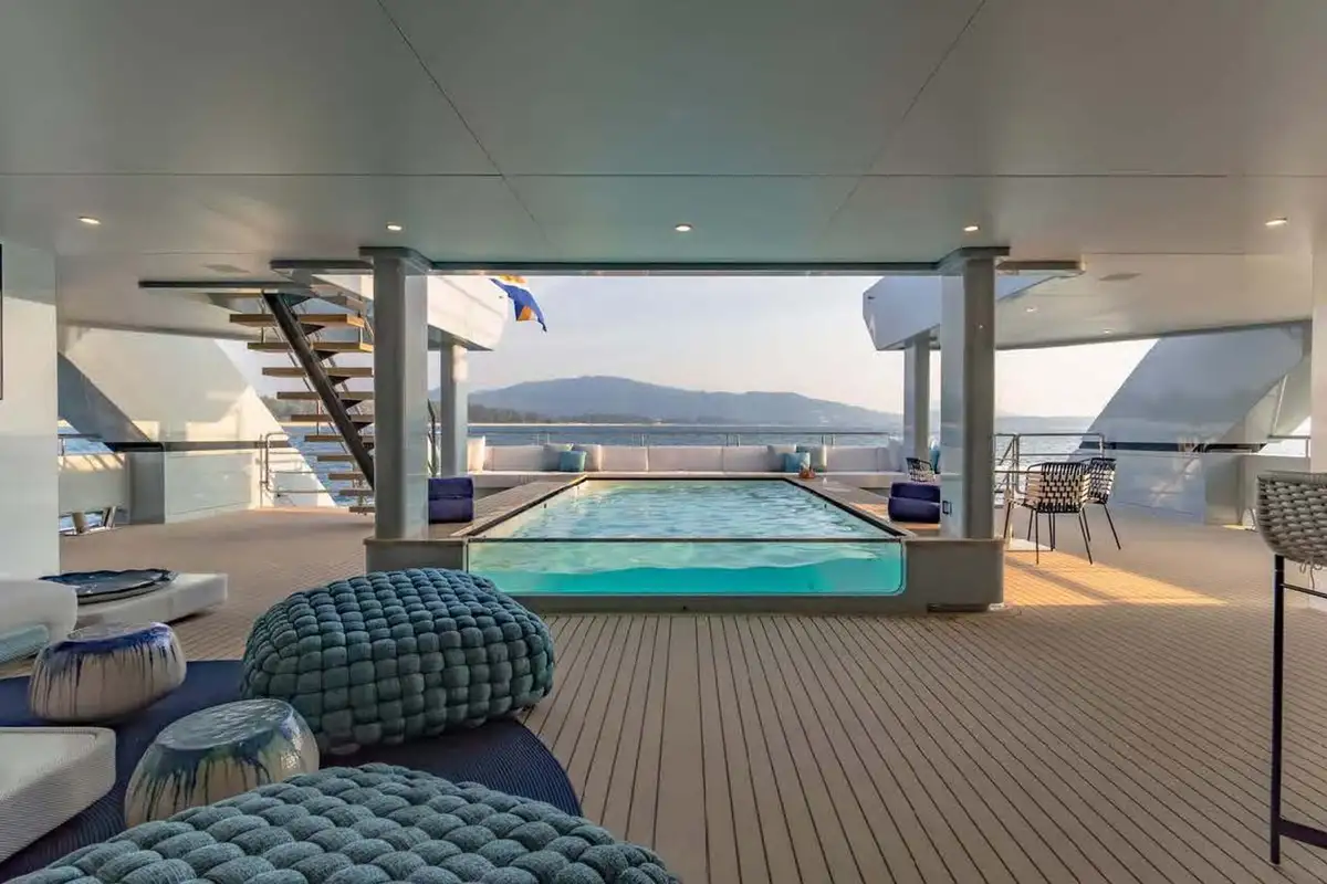 Also available for saleStep onto the wide main deck lounge, where light pours in through large windows onto an uber-stylish lounge. Another standout feature on SPACECAT is the massive aft deck beach club, which includes a swimming pool, shaded couches, and a well-appointed bar. This is truly luxury living on the water and offers an extraordinary space for relaxation and entertainment.