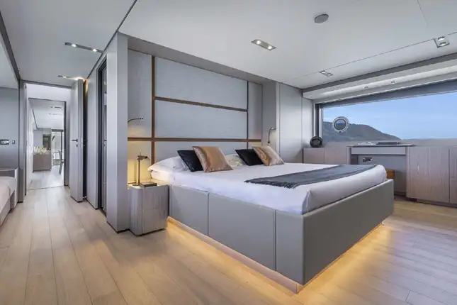 Inside, SPICA is no less impressive. Her long main lounge is flanked by picture windows that give way to floor-to-ceiling windows in the stylish formal dining area. The lounge has a large L-shaped sofa and freestanding seating, making it a wonderful social space. Ahead of this is the dining area with a serving window that gives direct access to the galley.