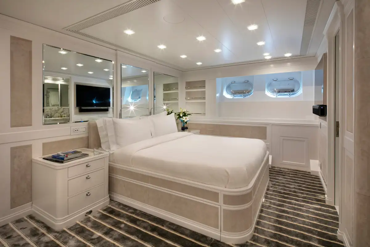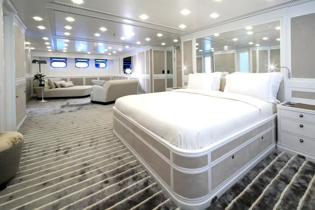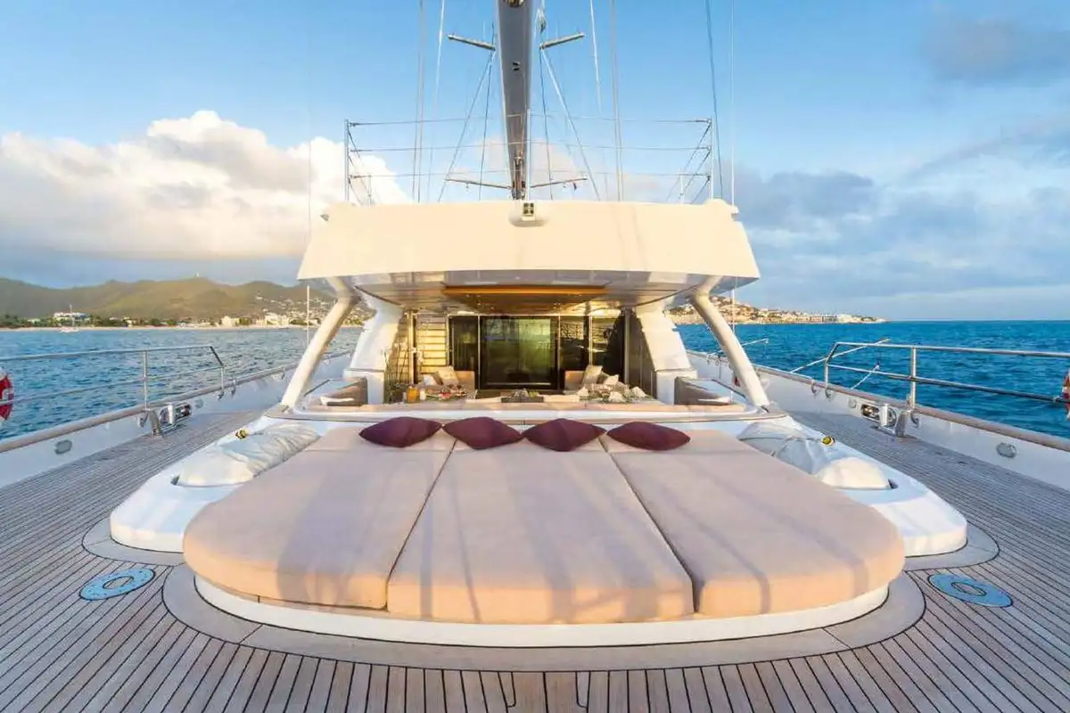 A delicious lunch of freshly grilled lobster and salads is served on the sun deck, which has a retractable awning to provide shade if desired. For the afternoon, take your pick from the selection of sunloungers and sun pads dotted across the yacht’s decks, whether you crave some time alone or with companions. The large sunbathing area on the sun deck is a particular favourite, thanks to its refreshing jacuzzi and excellent panoramic views, with freshly made cocktails provided by the crew.
