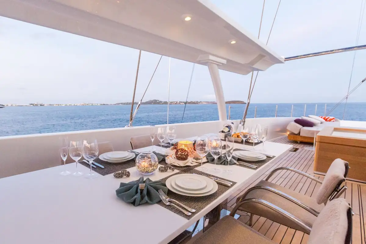 With the evening drawing in, the captain takes you to a romantic sunset cruise along the coastline while the interior crew serve sundowner cocktails complemented by delicious canapés. With the anchors set, dinner is served at the stylishly decorated table on the sun deck, with the gentle breeze and twinkling stars creating a remarkable setting while you share your joyful memories of the day.