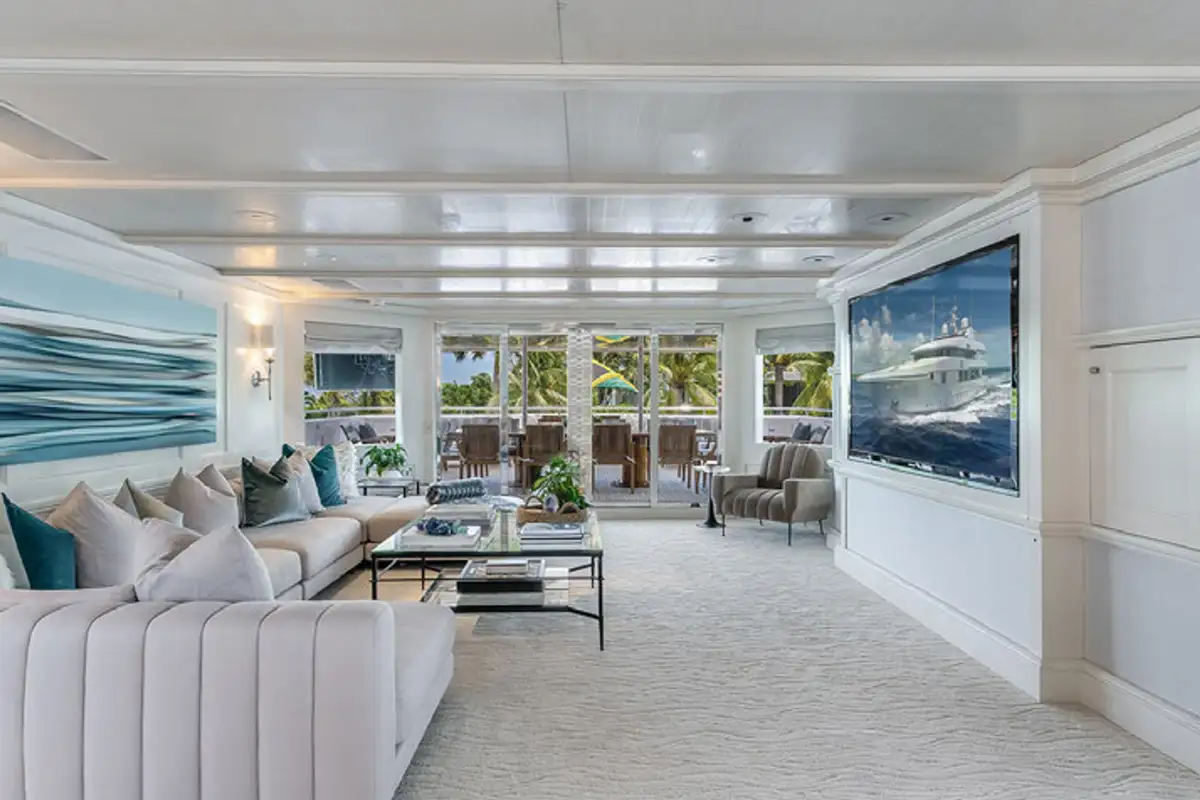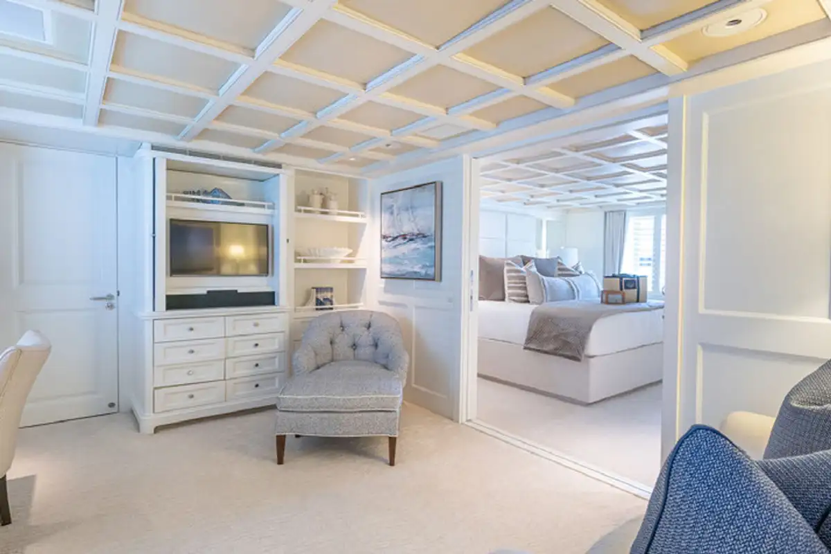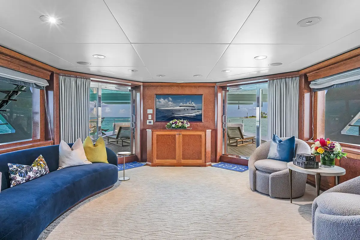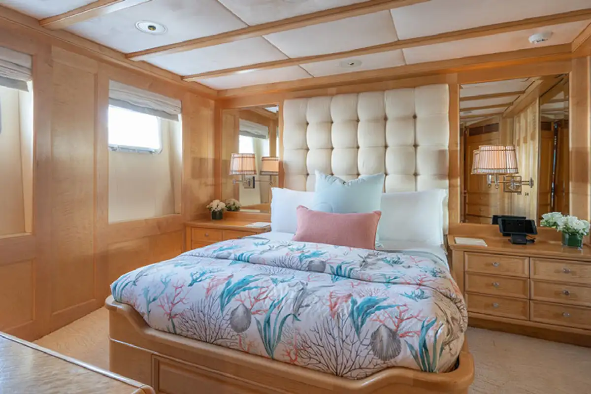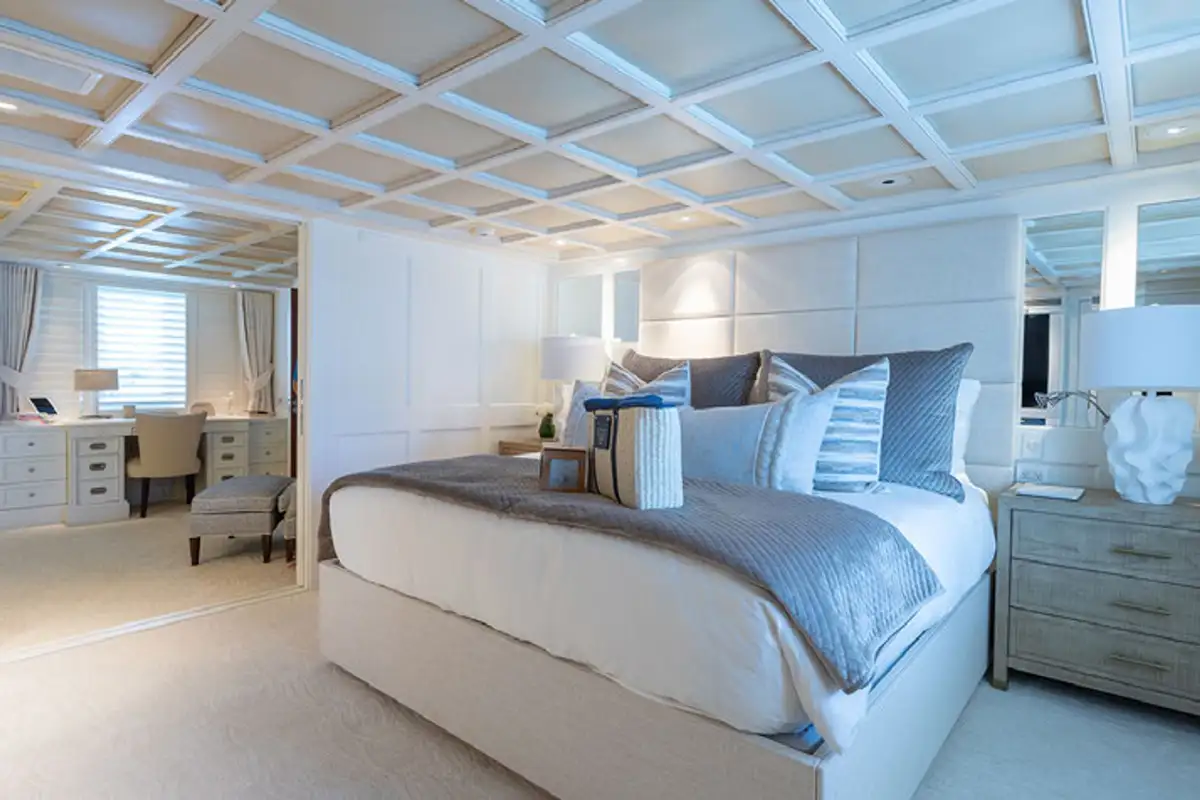 STAR DIAMOND’s interior presents the easy charm of a private beach house, brought to life by designer Donald Starkey. Expansive windows bathe each room in natural light, adding to the breezy, open feel. In the main salon, you’ll find inviting leather-trimmed sofas perfect for movie nights or casual conversations, as well as a well-stocked bar ready for evening cocktails. When it’s time to dine, the adjacent formal dining area offers flexibility—two circular tables for intimate meals or a convertible grand oval setup that seats 12 with a panoramic view.