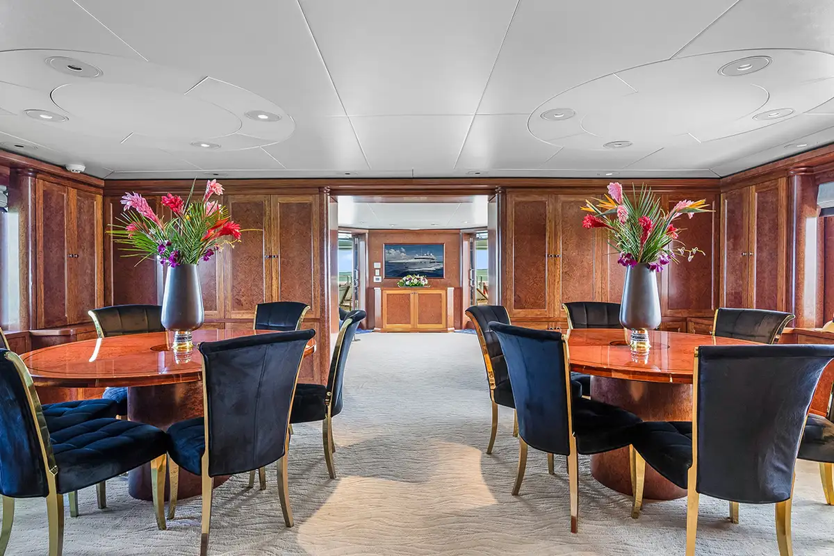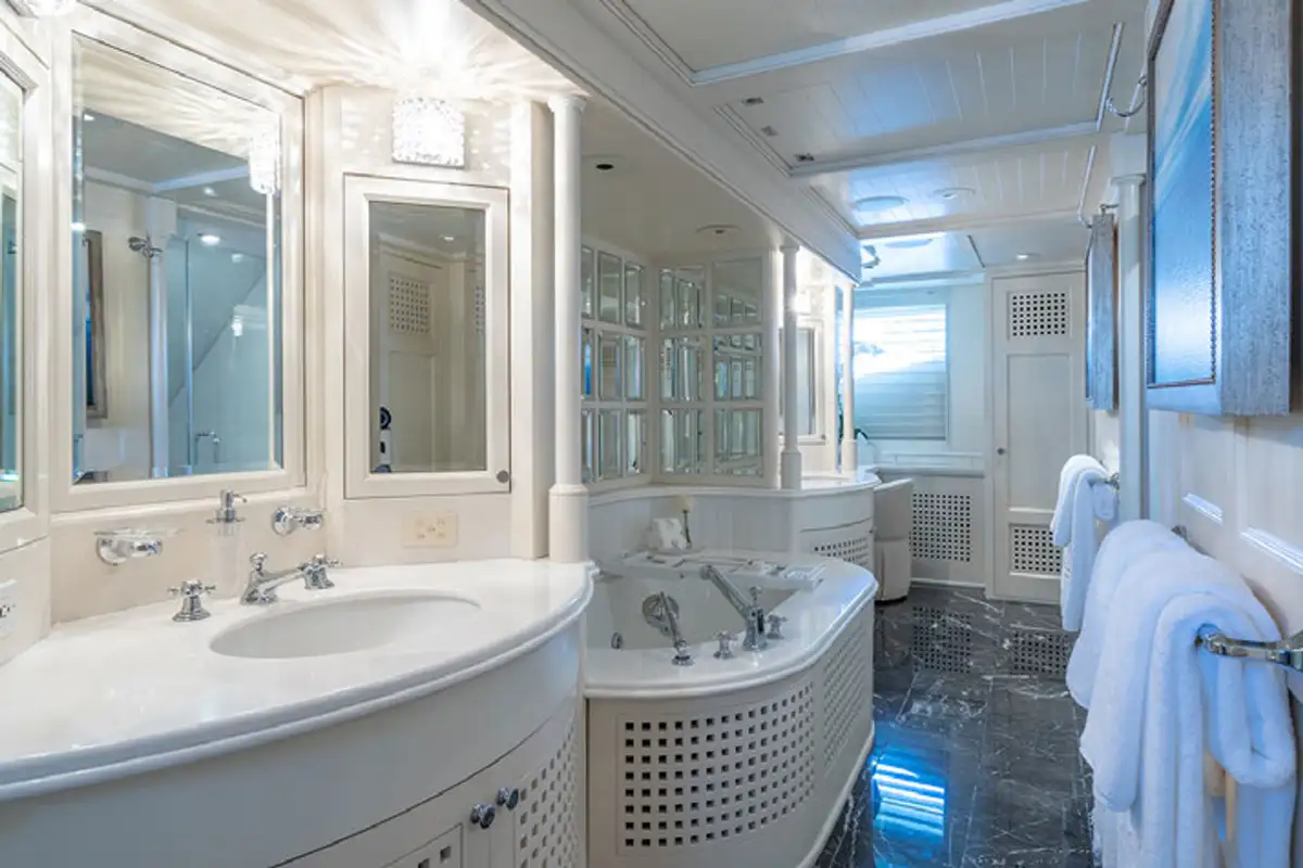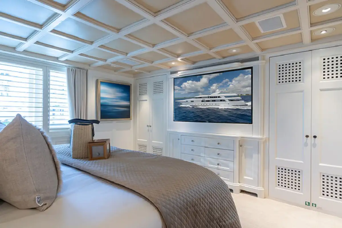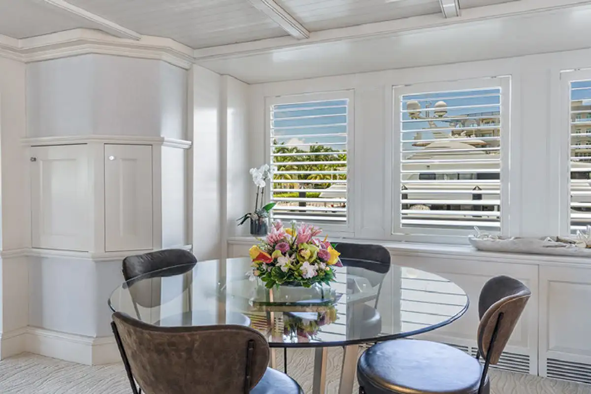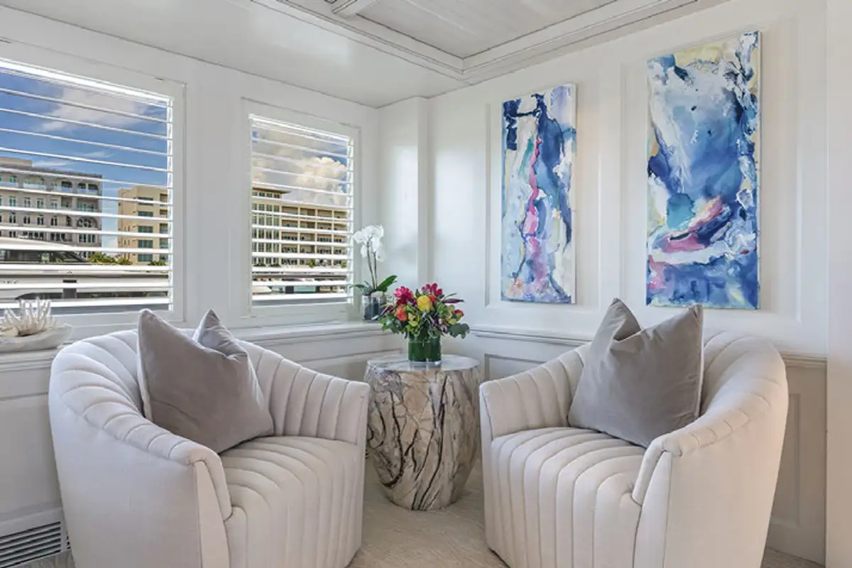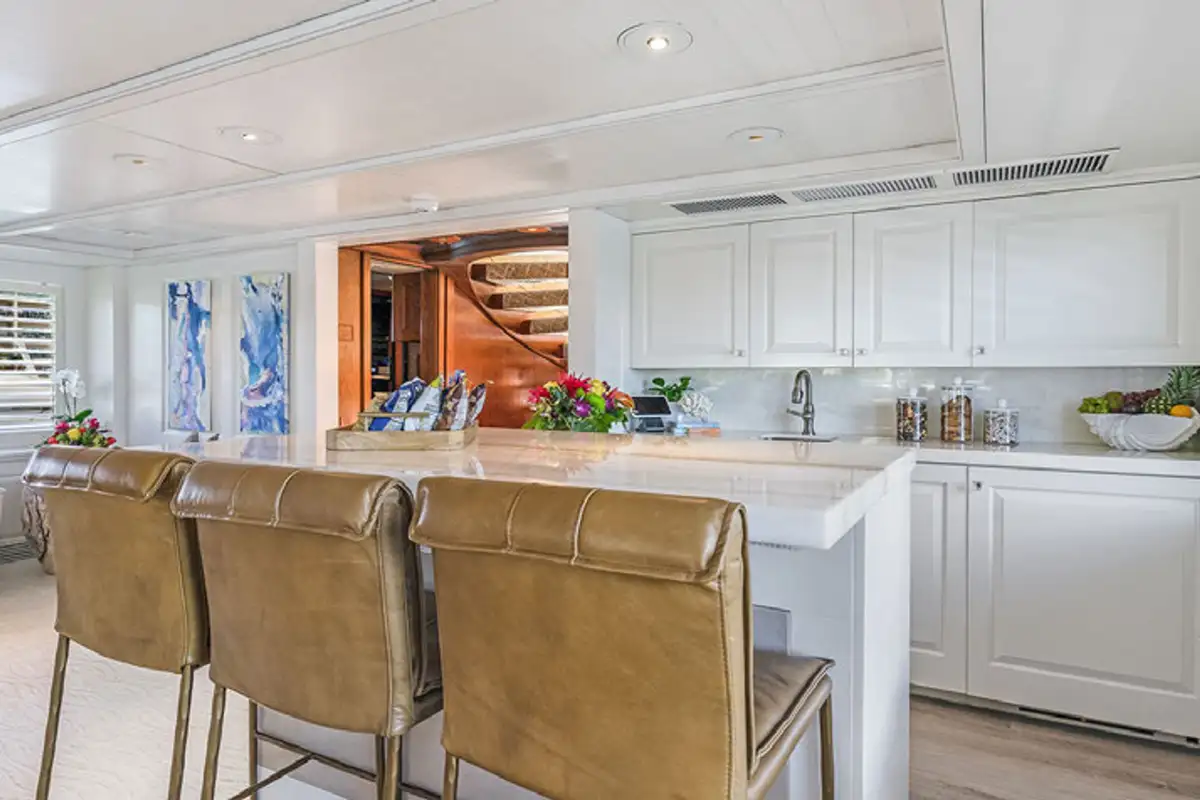 STAR DIAMOND’s interior presents the easy charm of a private beach house, brought to life by designer Donald Starkey. Expansive windows bathe each room in natural light, adding to the breezy, open feel. In the main salon, you’ll find inviting leather-trimmed sofas perfect for movie nights or casual conversations, as well as a well-stocked bar ready for evening cocktails. When it’s time to dine, the adjacent formal dining area offers flexibility—two circular tables for intimate meals or a convertible grand oval setup that seats 12 with a panoramic view.