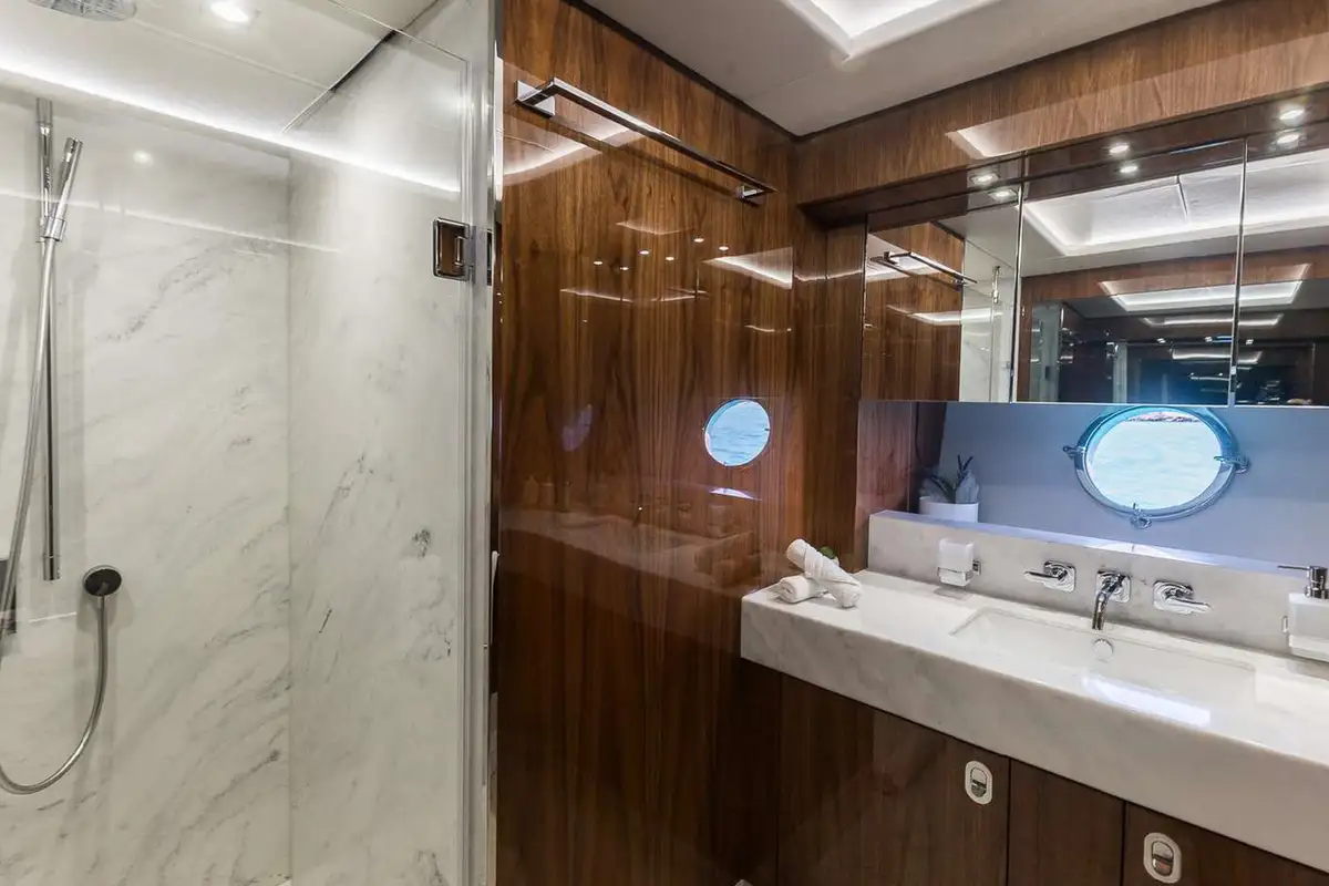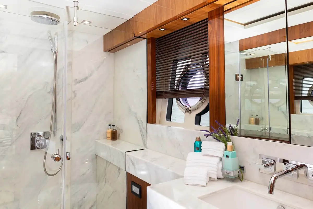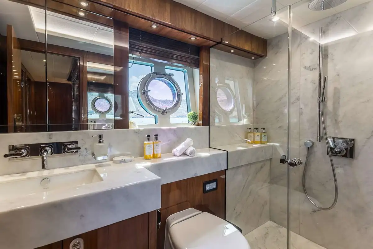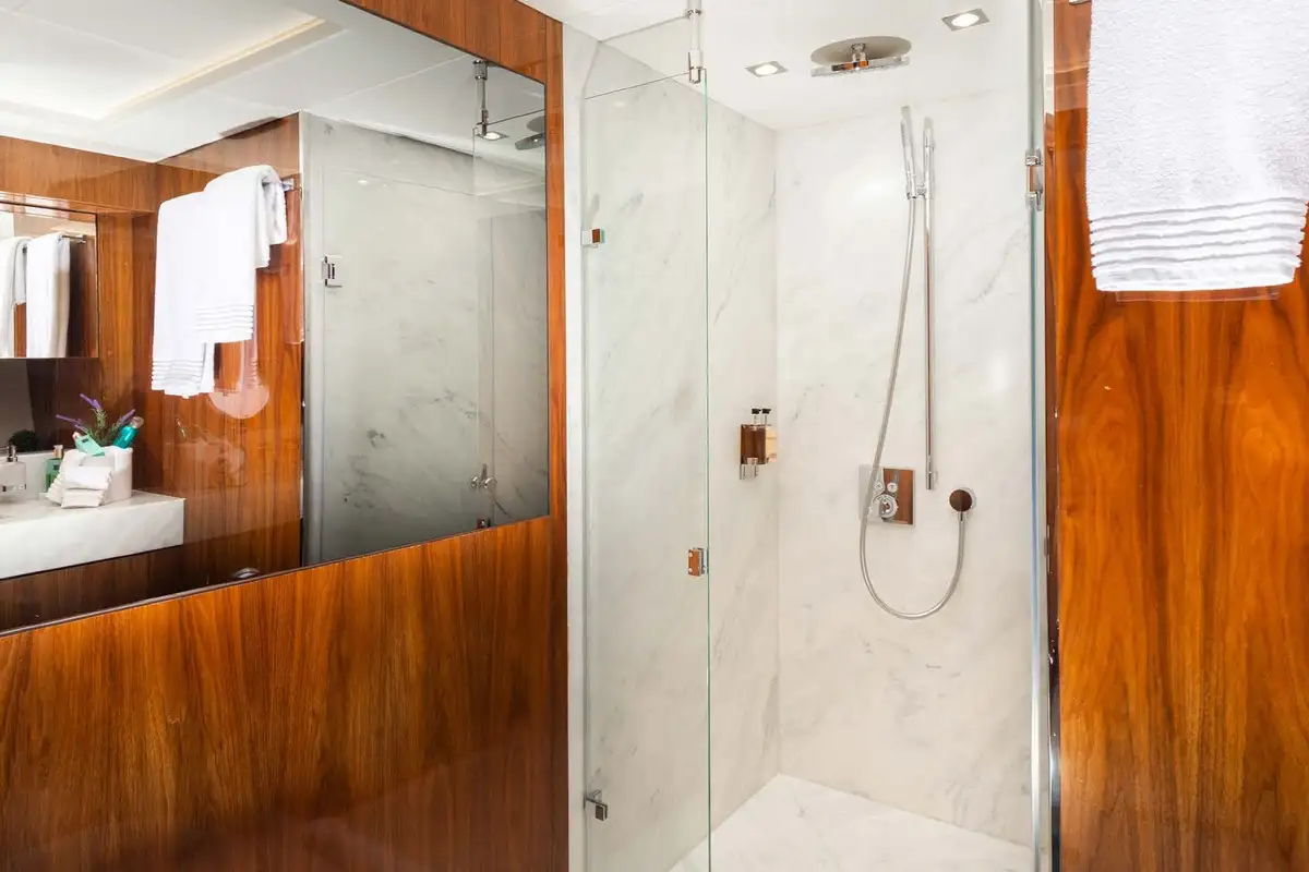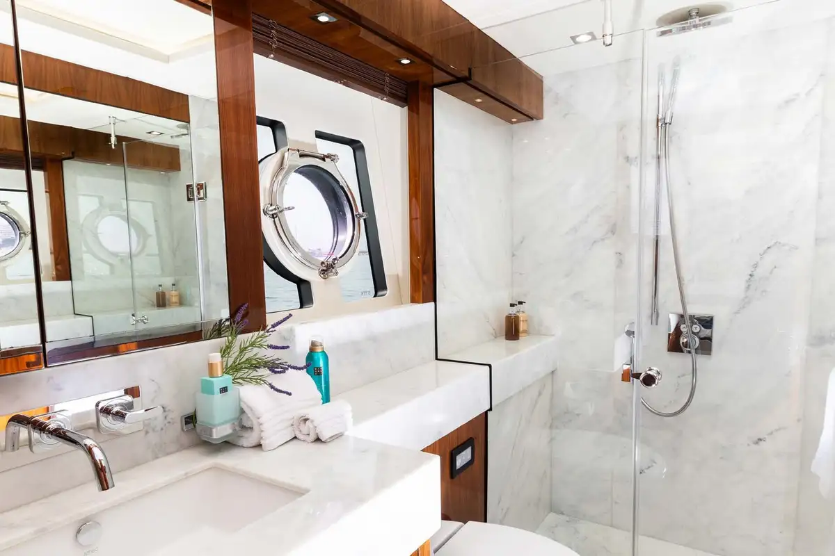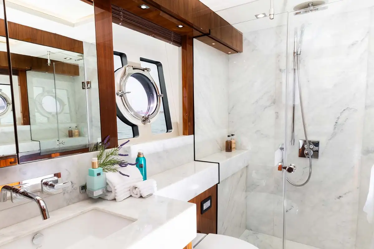 The snorkelling exceeded expectations, and the afternoon was spent deciding which sunpad was the best; with a collection of sun loungers, forward and aft sunpads, it was a difficult task, but one the children rose to. While some had decided to use the deck shower, you’d prefer to make the most of the marble-lined en suite bathroom in the master suite to freshen up before going to explore ashore.