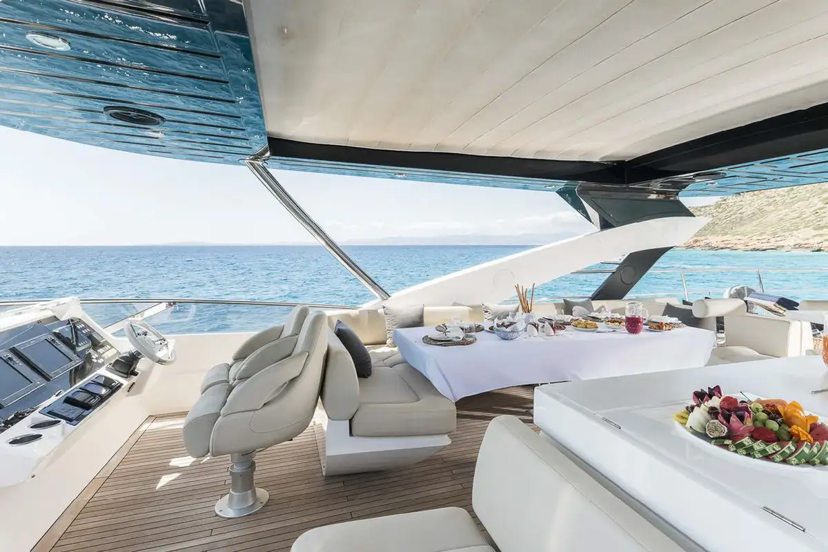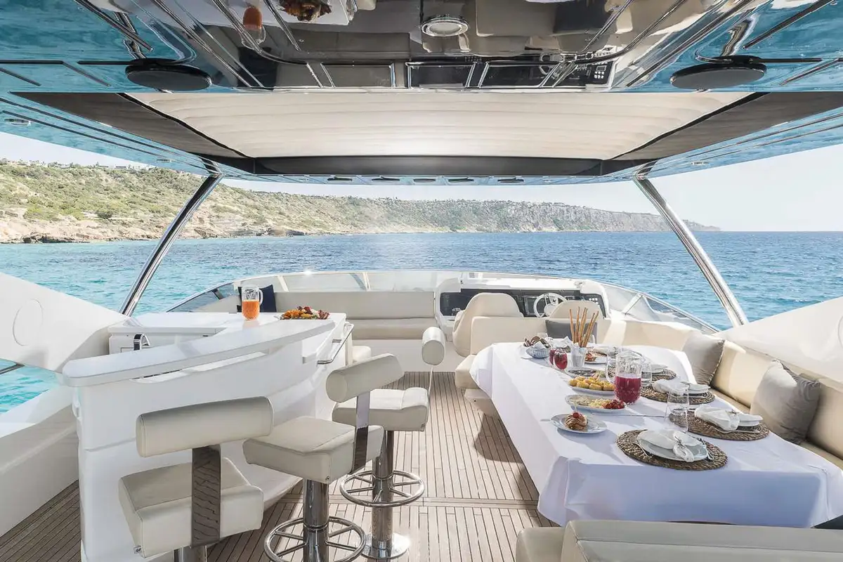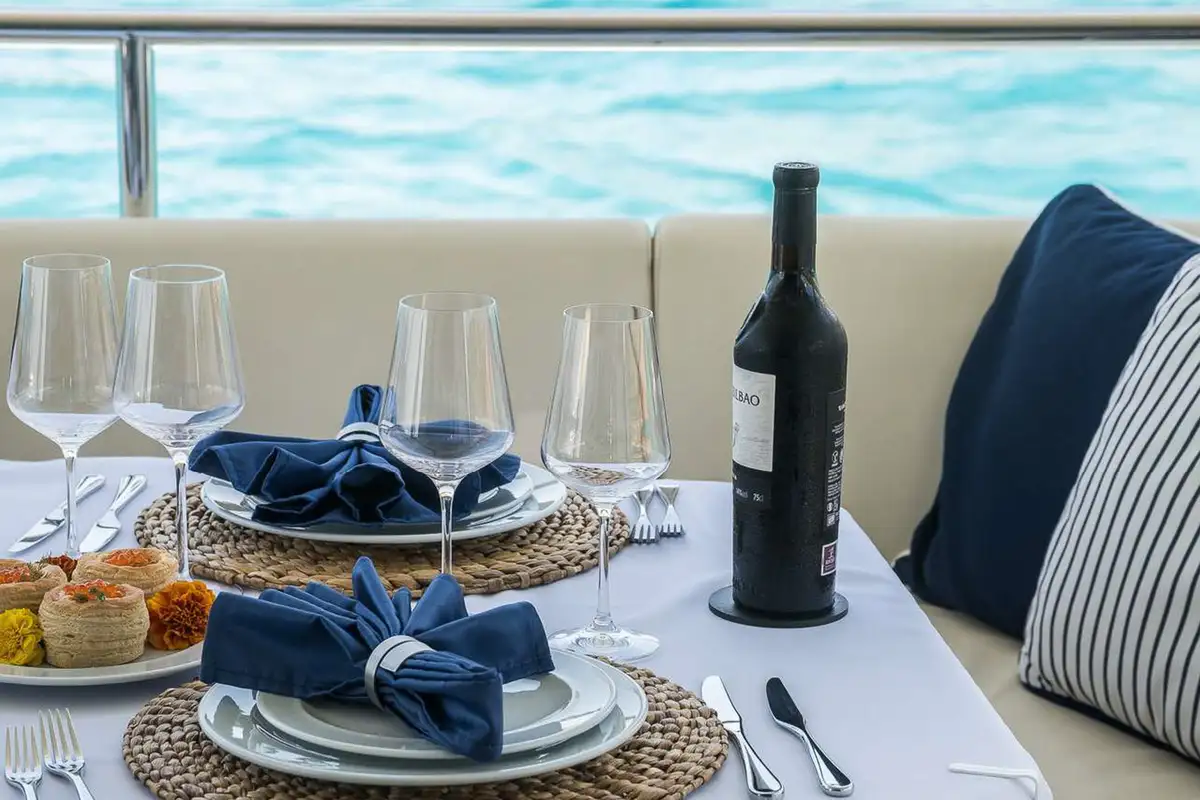 You’d asked to spend your first night at anchor, where you and your family and friends could enjoy the sunset from the glorious forward al fresco lounge. The captain had delivered a tranquil anchorage with an uninterrupted view to watch the sun dip below the horizon. Canapes were served while you watched a kaleidoscope of colour fill the skies above. Dinner was taken in the cockpit, the warm breeze filling the air with the aroma from the galley, whetting everyone’s appetite. As the fine dining creations adorned the table, conversation filled the air.