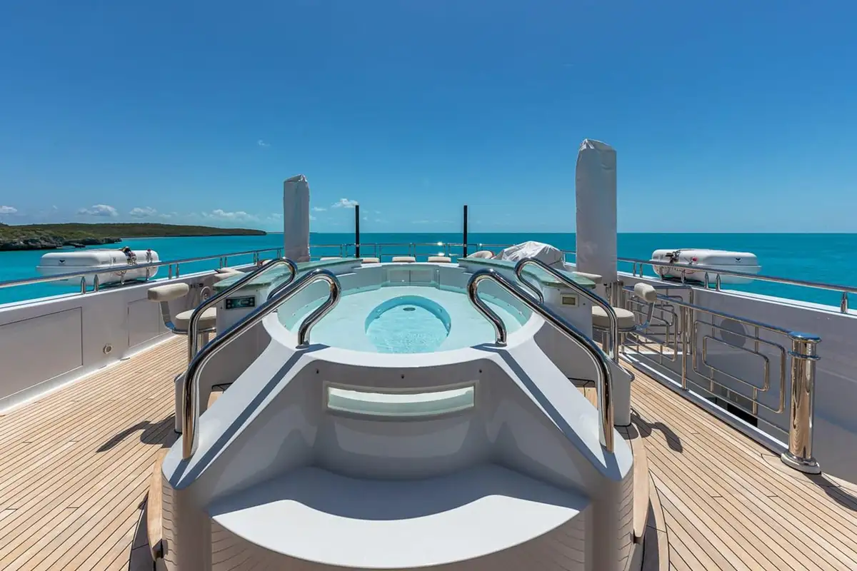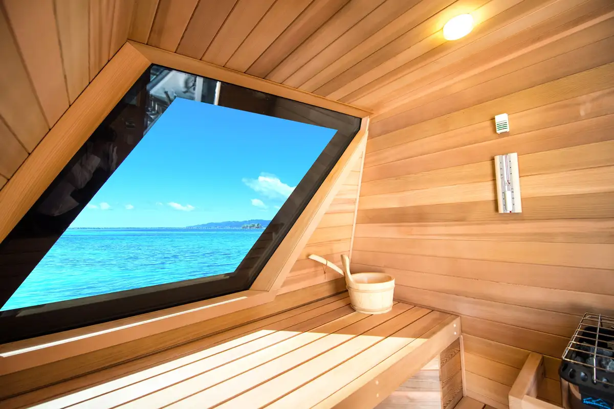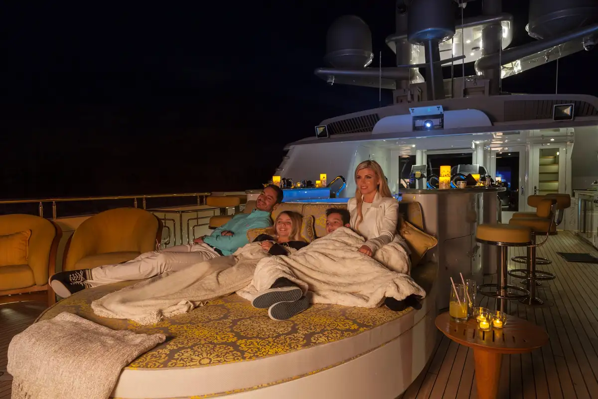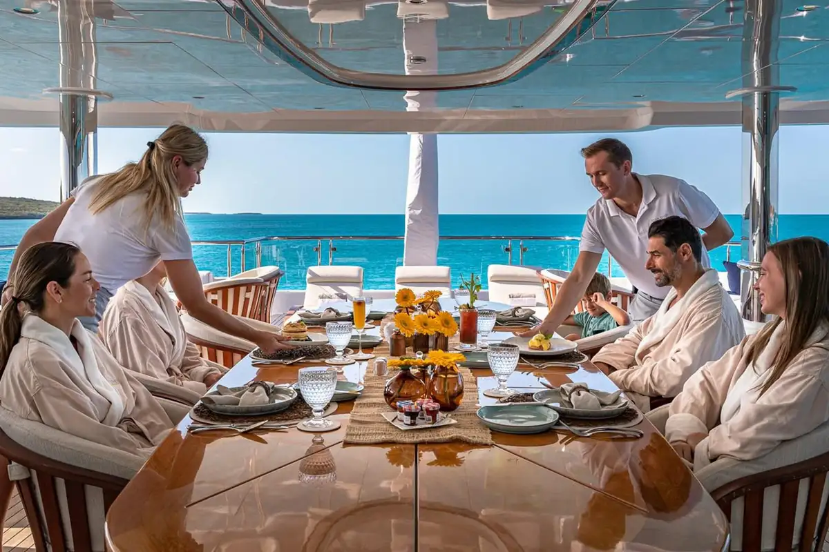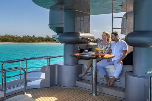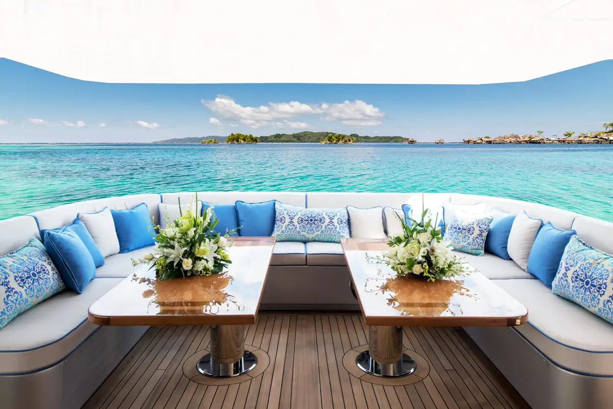 This exciting new space includes an outdoor cinema with a 132" screen, a new, oversized, waterfall jacuzzi with a swim-up bar on two sides, sauna, gym equipment, spacious outdoor dining area and luxurious sun beds. The pristine new beach club has created a whole new area for guests to unwind in, or deliberate over which watersports to try out next, while the crow's nest provides spectacular panoramic views from a table, chairs and sun pad high up on the mast.