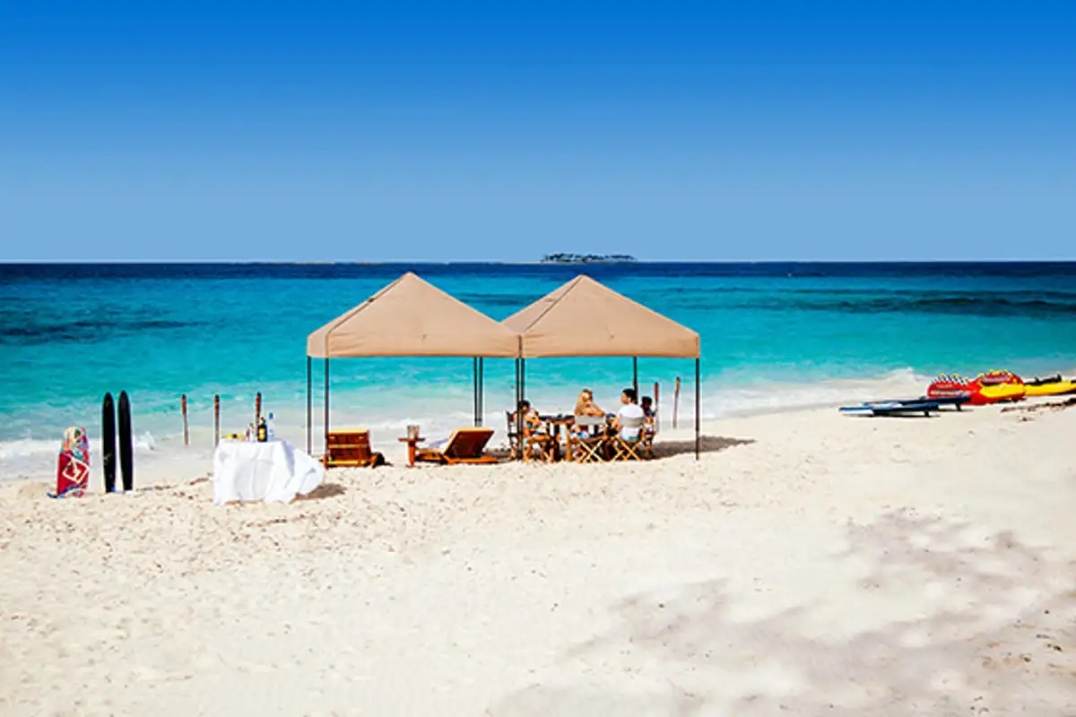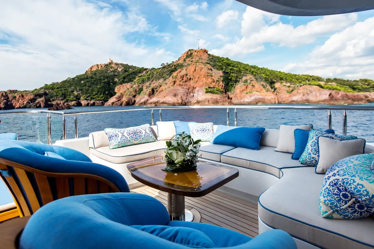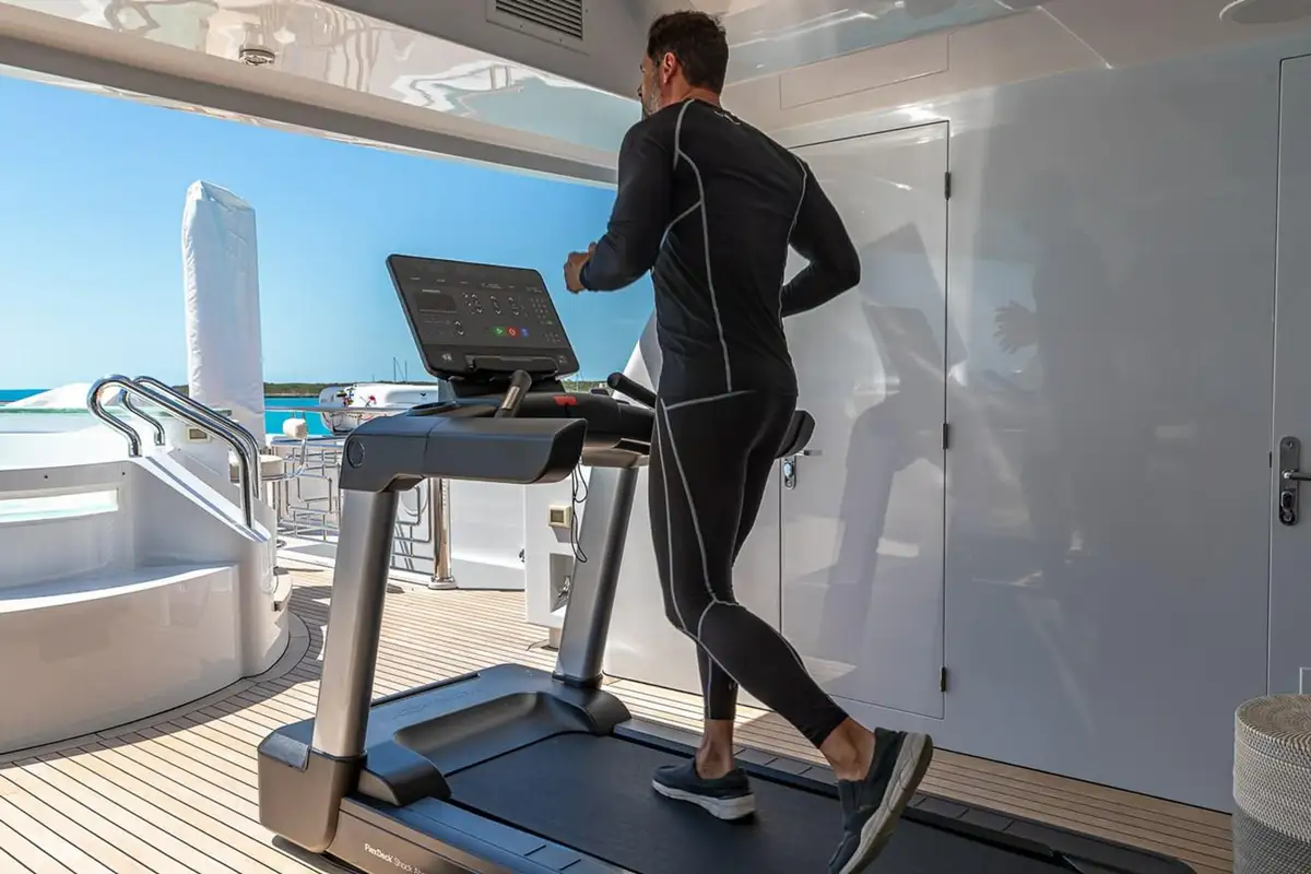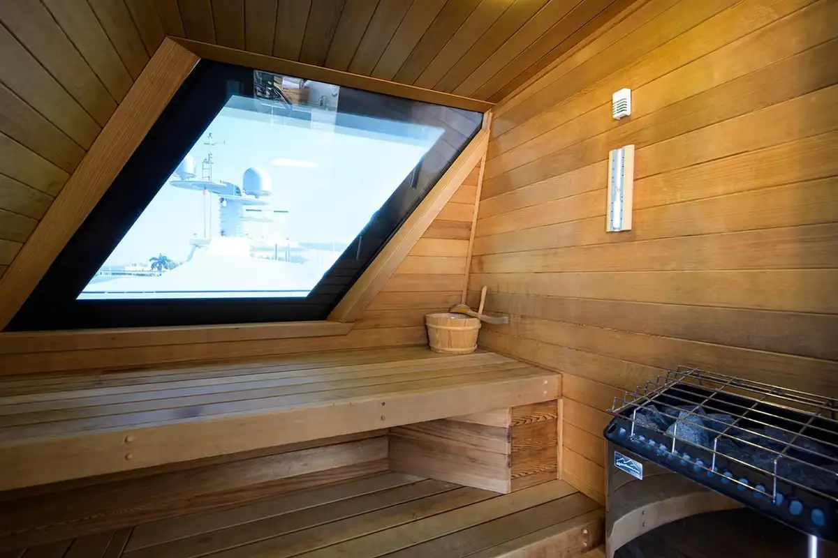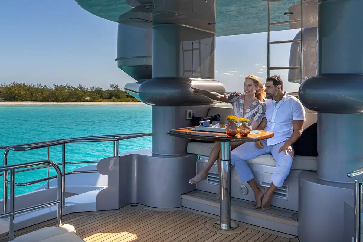 This exciting new space includes an outdoor cinema with a 132" screen, a new, oversized, waterfall jacuzzi with a swim-up bar on two sides, sauna, gym equipment, spacious outdoor dining area and luxurious sun beds. The pristine new beach club has created a whole new area for guests to unwind in, or deliberate over which watersports to try out next, while the crow's nest provides spectacular panoramic views from a table, chairs and sun pad high up on the mast.