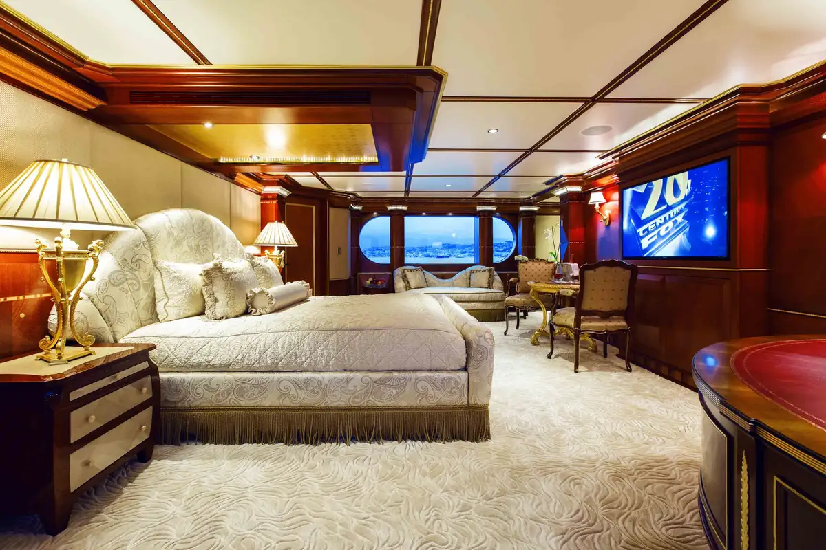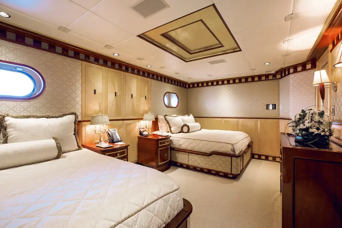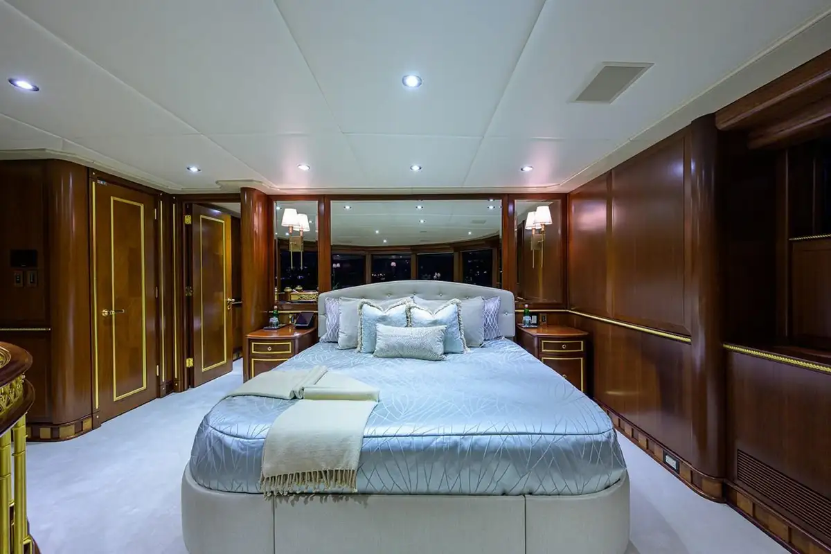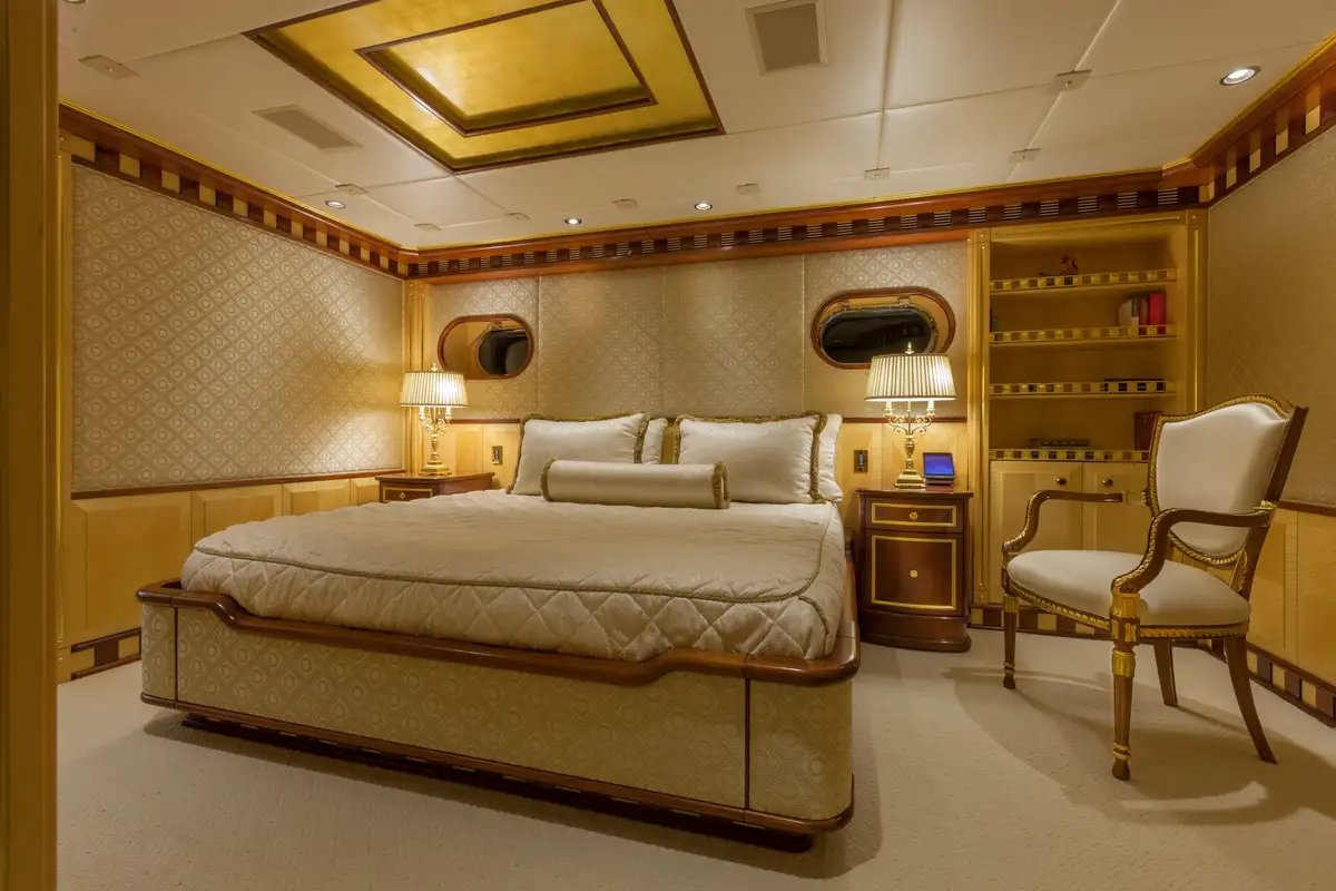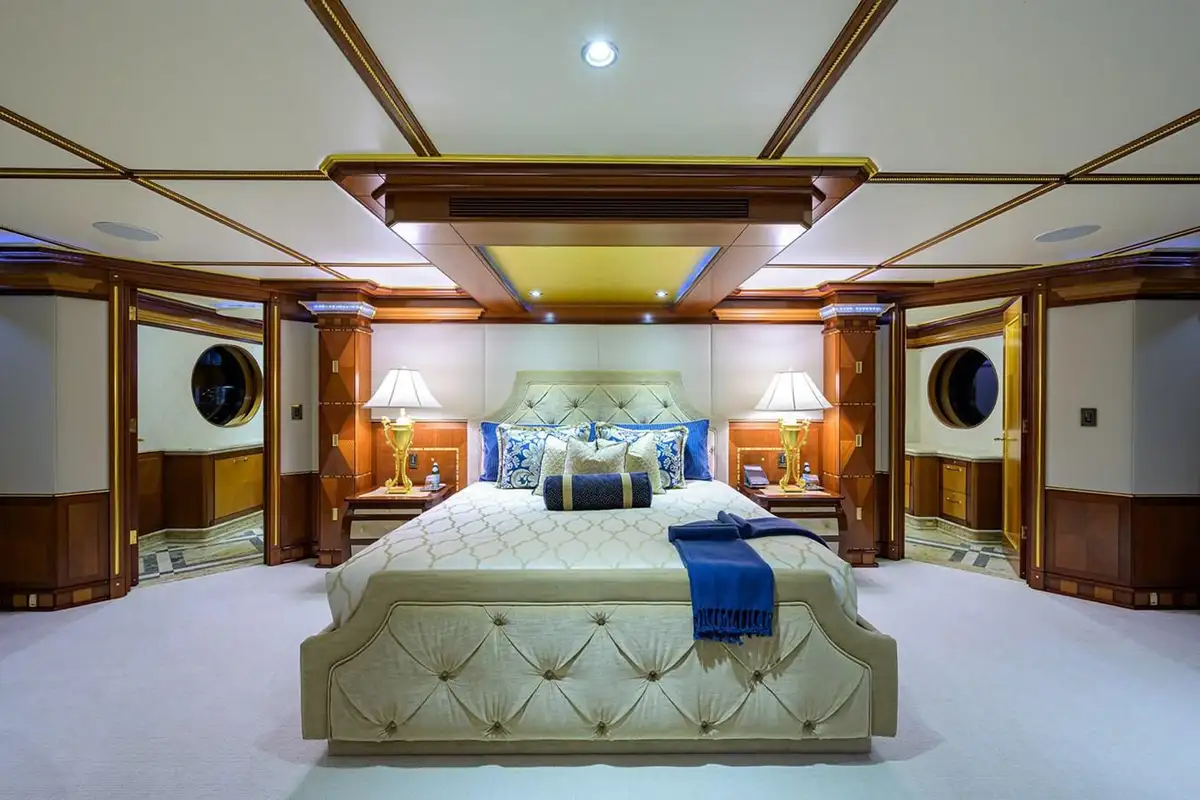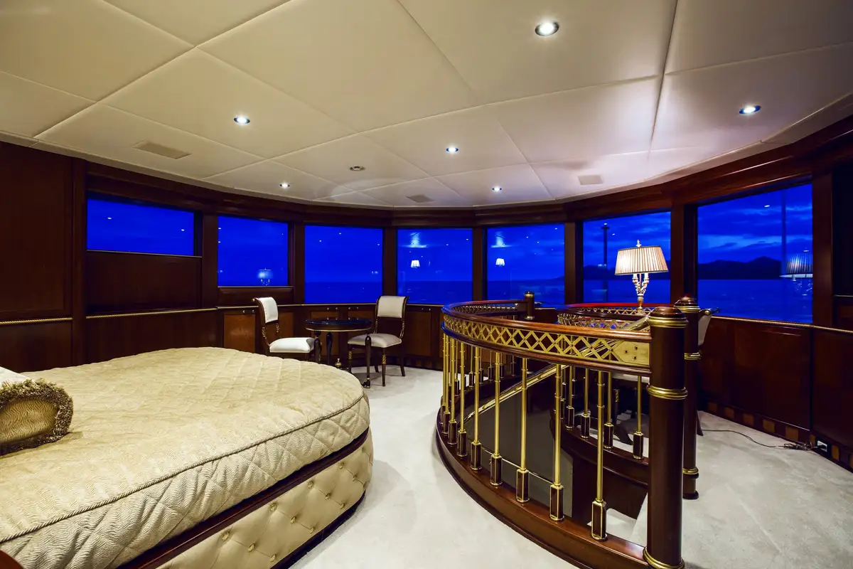 This yacht accommodates up to 12 guests in a master suite, VIP and four double cabins. The brand new VIP suite was created on the upper deck, allowing guests to relax in bed while enjoying a 180 degree view of the ocean.