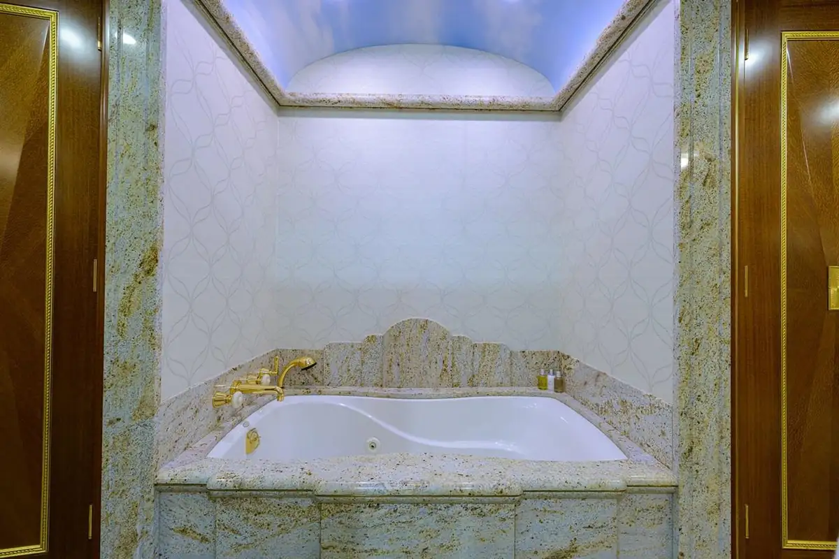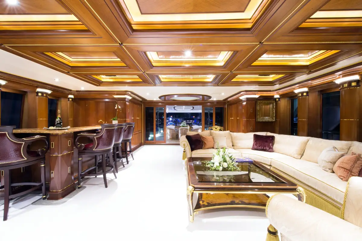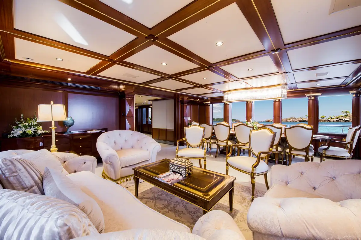 STARSHIP's stunning new interior features magnificent white marble throughout, and ornate fittings brushed with 22 karat gold leaf. The sky lounge boasts a state-of-the-art curved TV that is connected to a submarine camera showing the tropical ocean below. Or guests can enjoy a banquet created by the world-class chef in the plush dining room on the main deck.