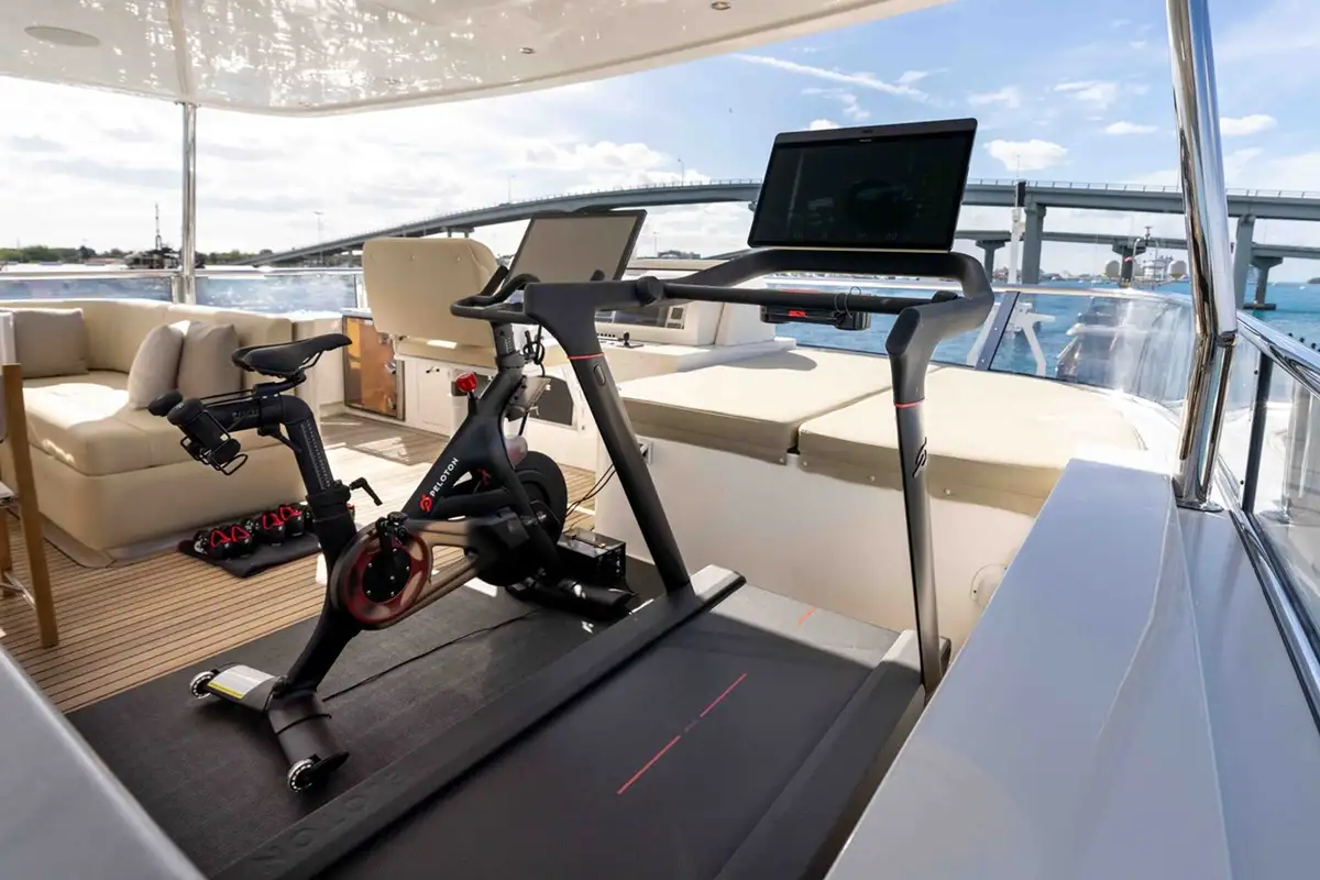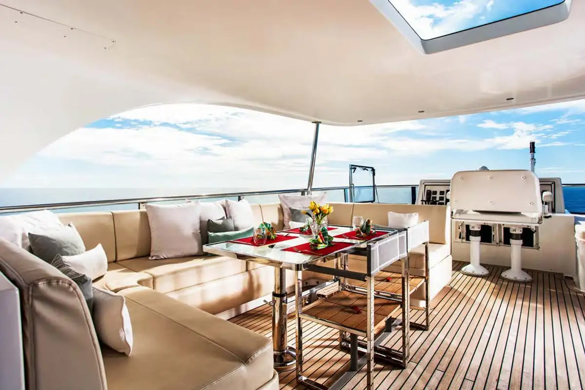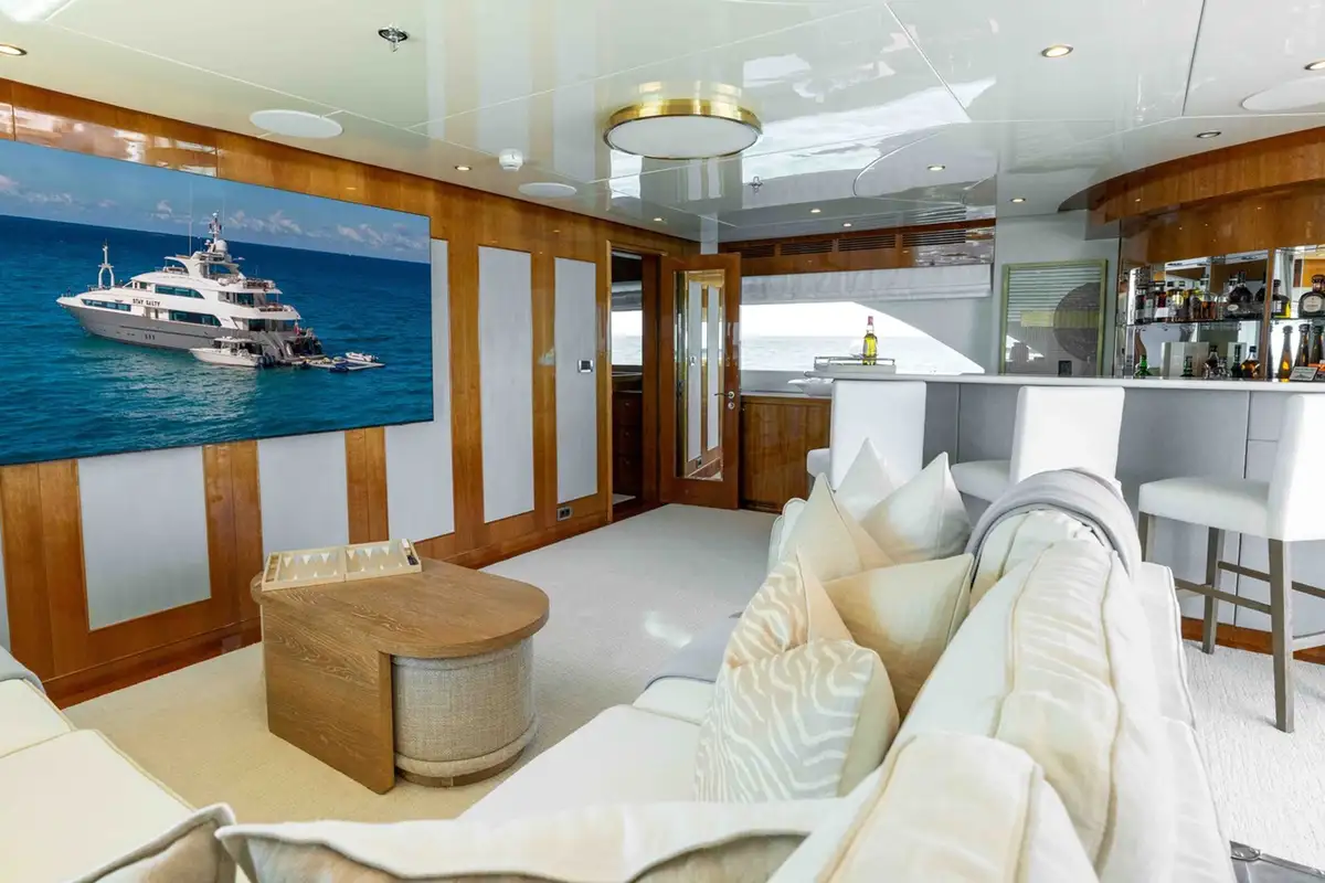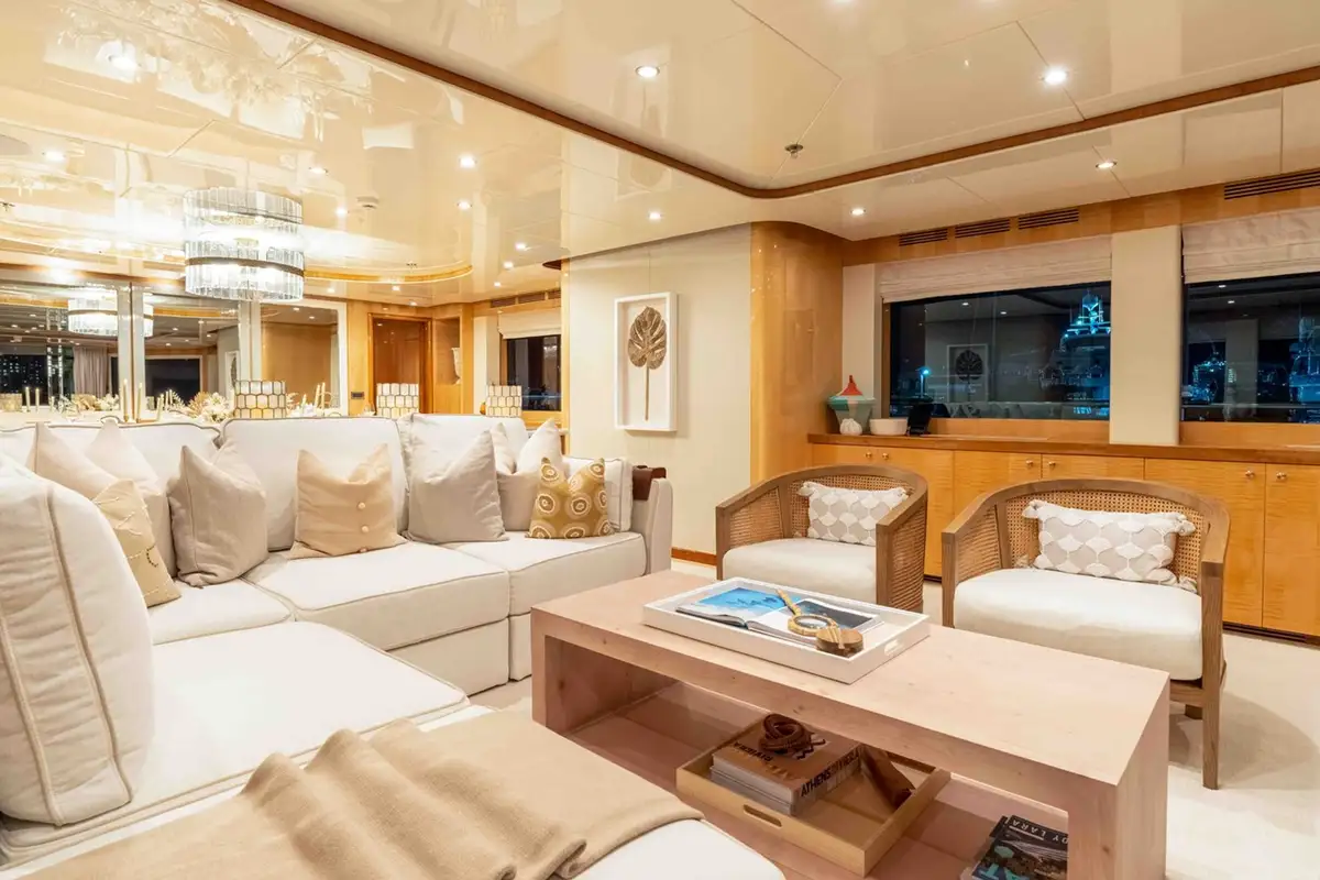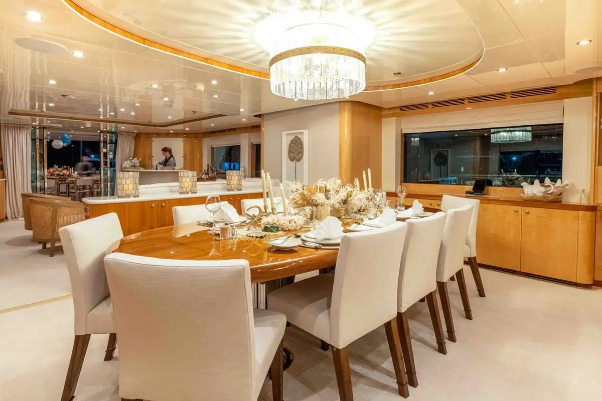 The interior styling is clean and timeless, with a high-gloss varnished hardwood finish in most of the guest areas, comfortable contemporary furniture and marble bathrooms. The main deck lounge is a large, inviting open plan space with a sociable lounge and an elegant dining area with a large oval table. She also has a dedicated gym and a sauna.