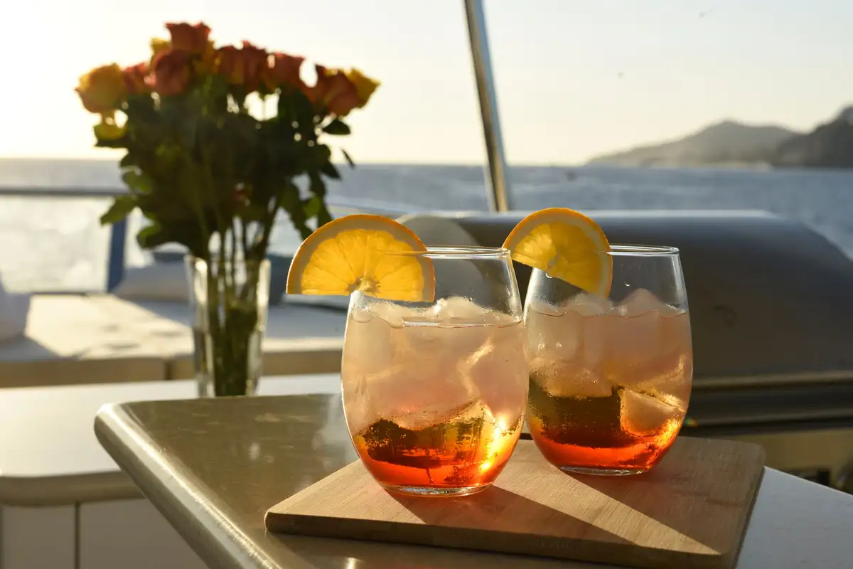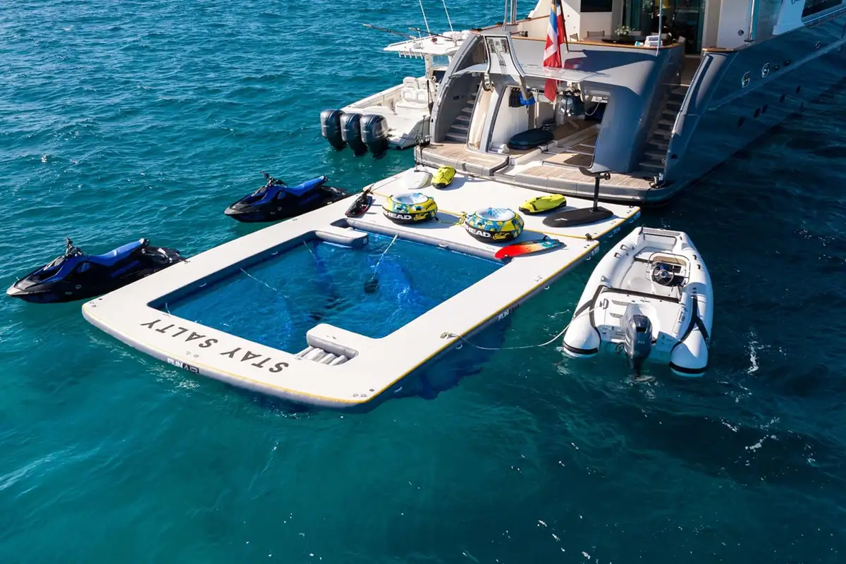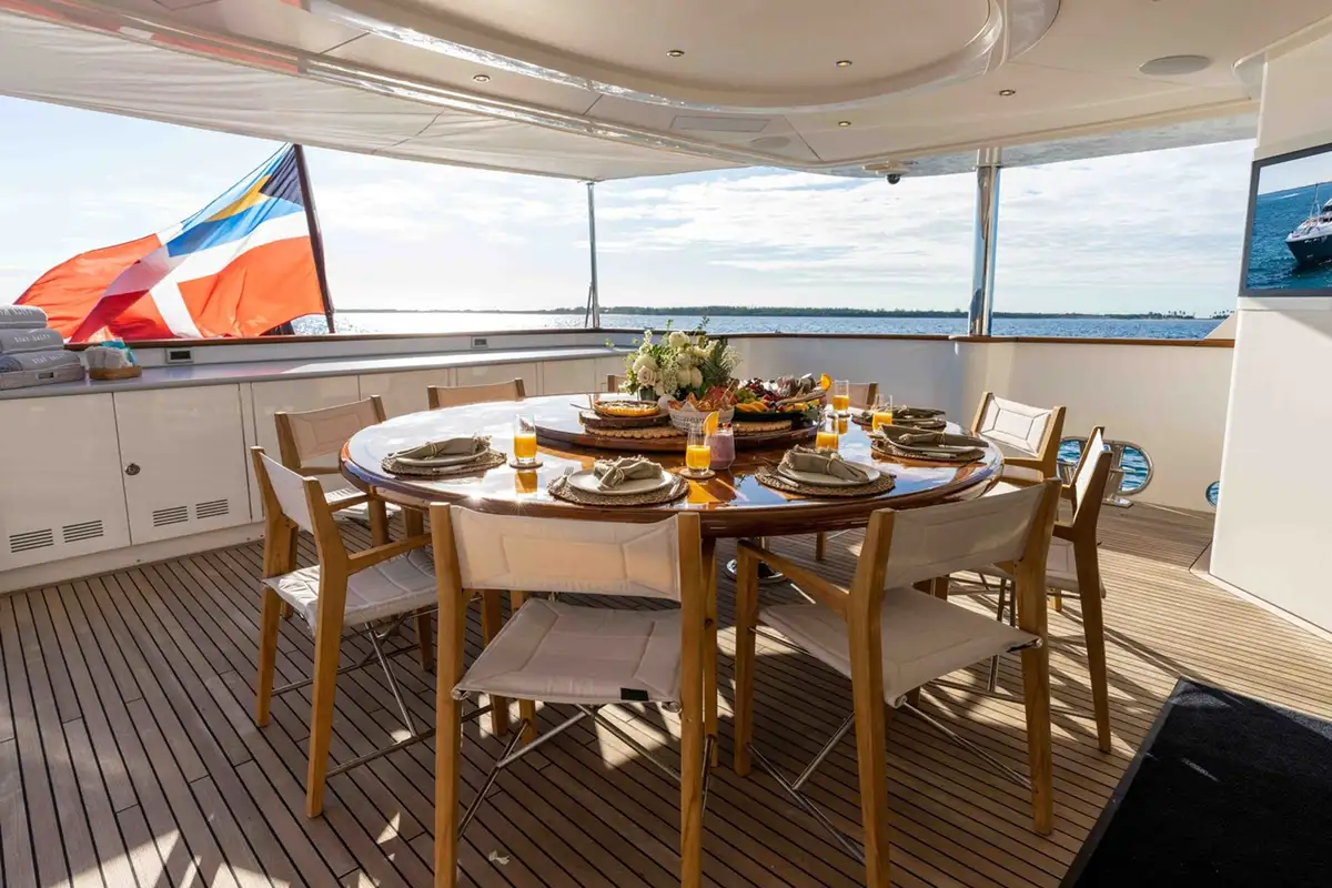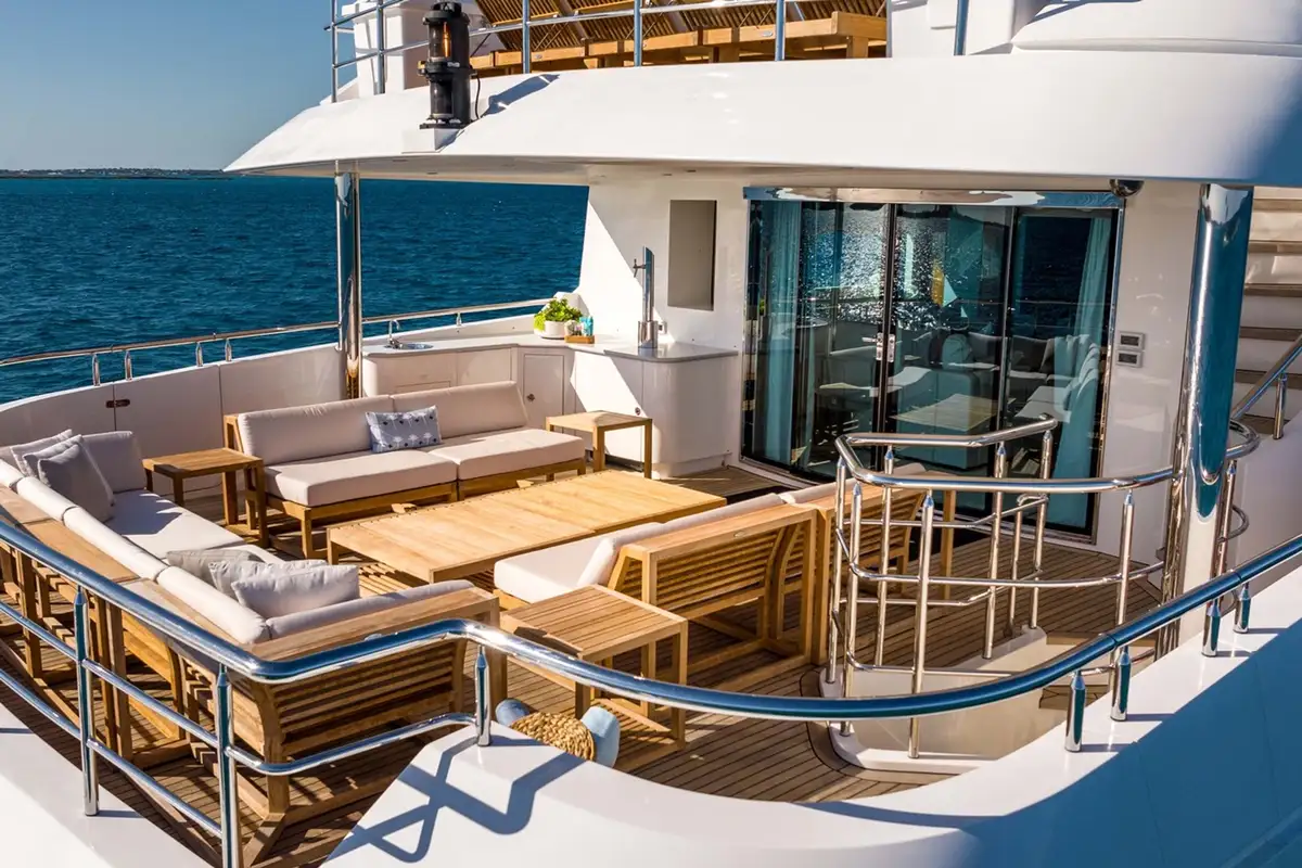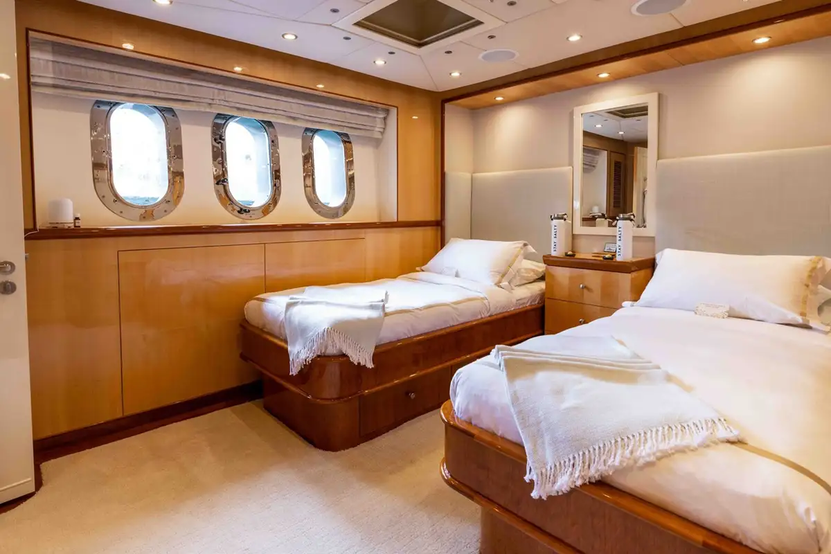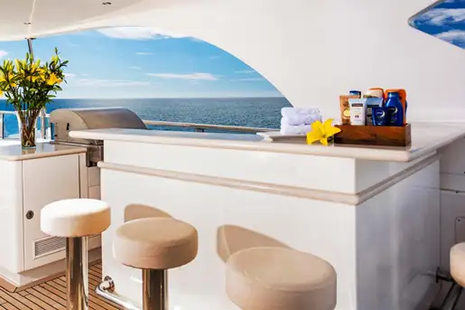 The interior styling is clean and timeless, with a high-gloss varnished hardwood finish in most of the guest areas, comfortable contemporary furniture and marble bathrooms. The main deck lounge is a large, inviting open plan space with a sociable lounge and an elegant dining area with a large oval table. She also has a dedicated gym and a sauna.