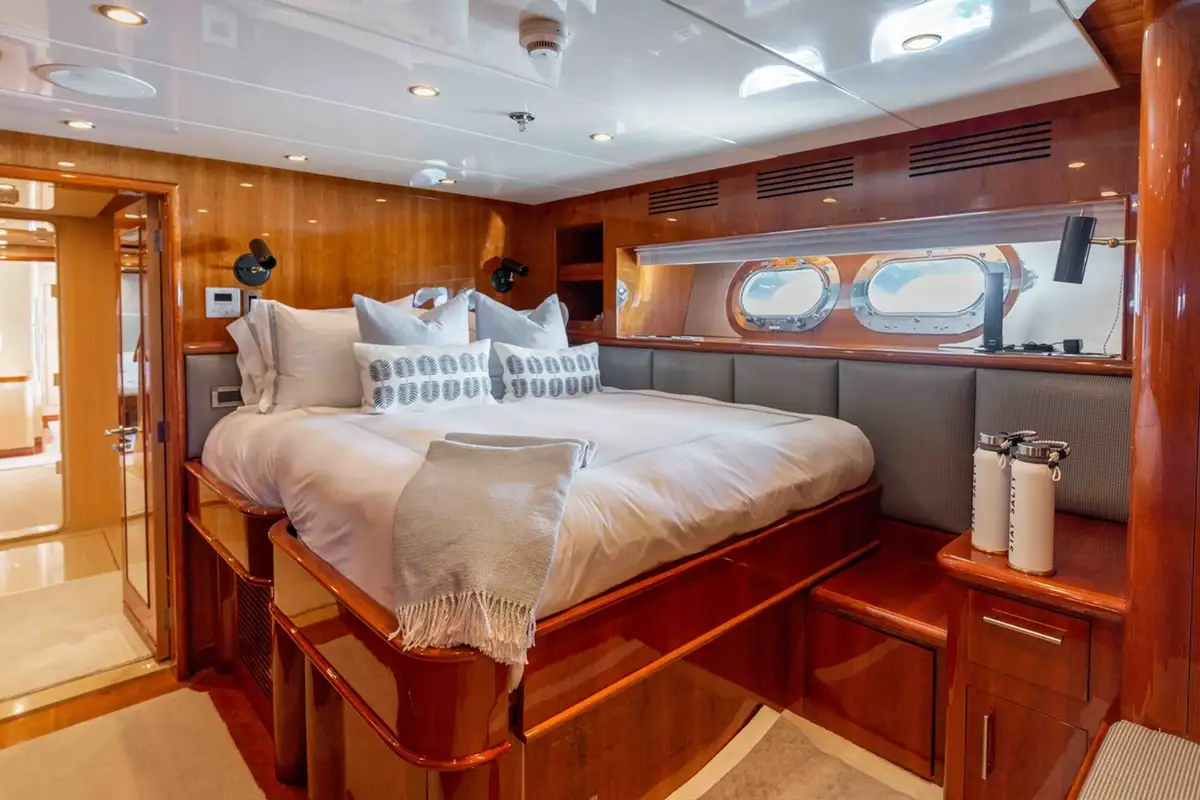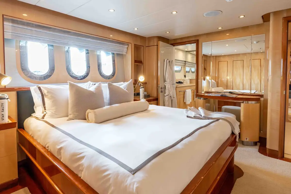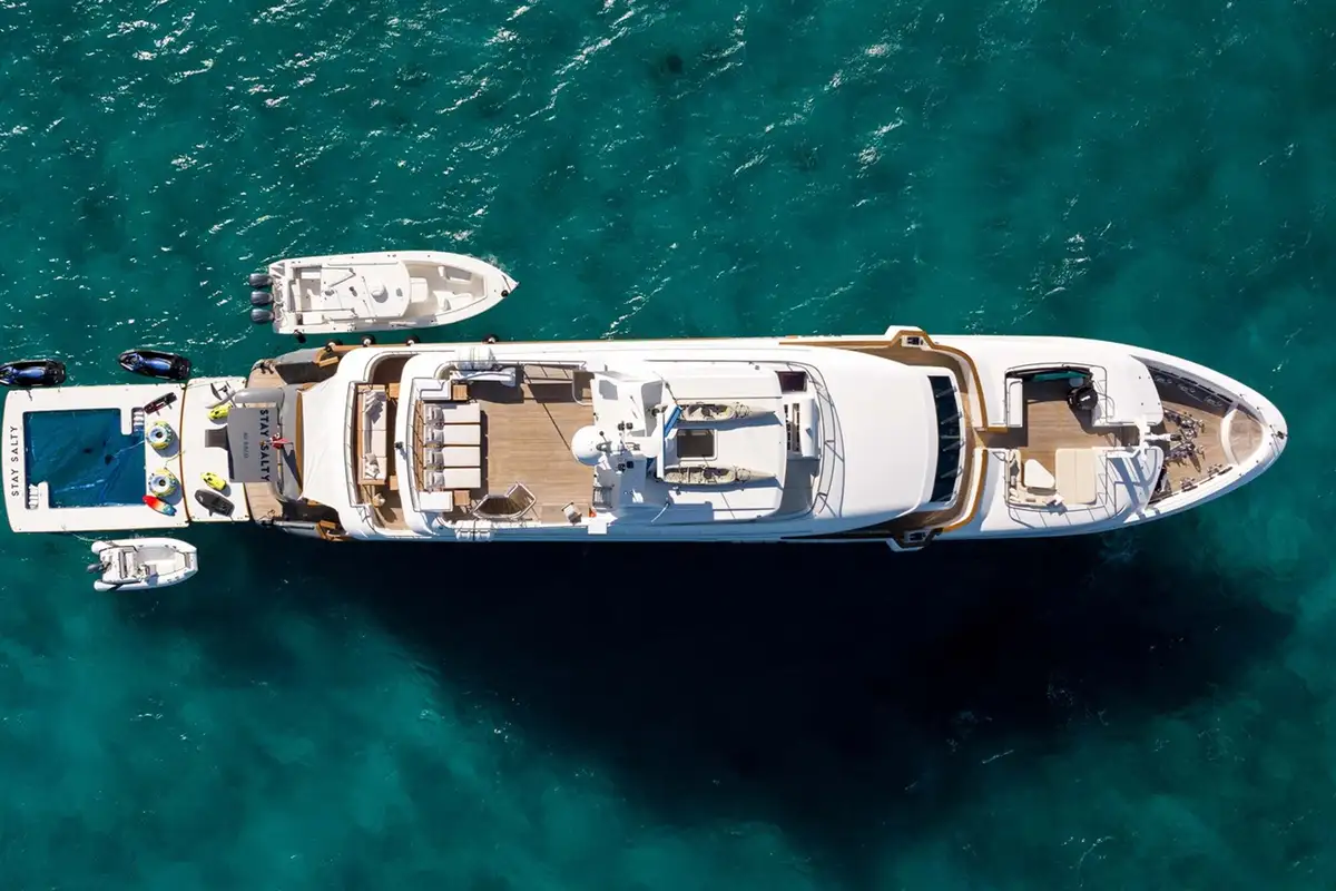 One stand-out feature, hard to find on a yacht of this size, is STAY SALTY’s private owner’s deck. The entire bridge deck (apart from the wheelhouse, which has separate access) is dedicated to the master suite including the upper aft deck, which serves as a private outside lounge terrace, and the sky lounge, which is the master suite’s living room and study. This connects directly with the full-beam master cabin, which also has a door leading out onto the port-side companionway.