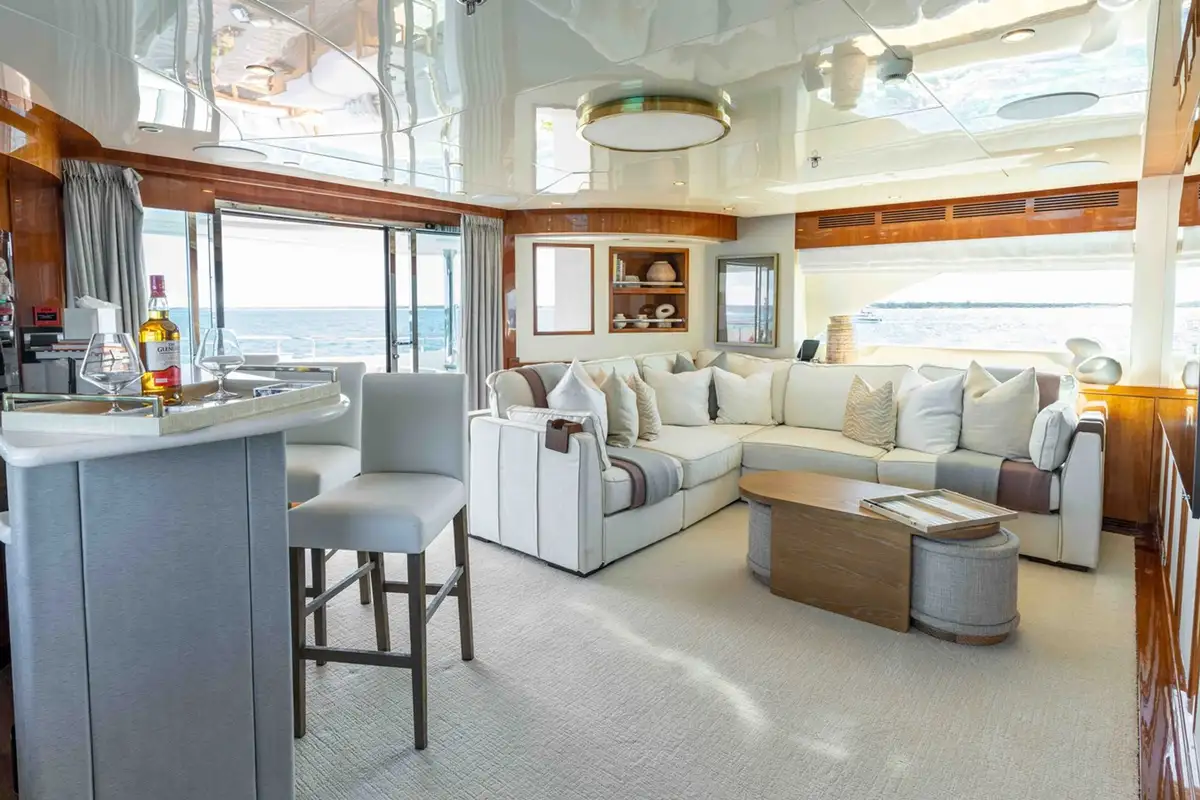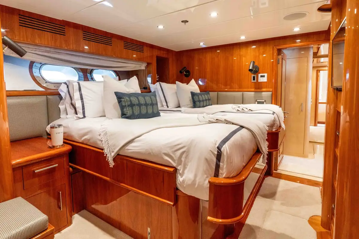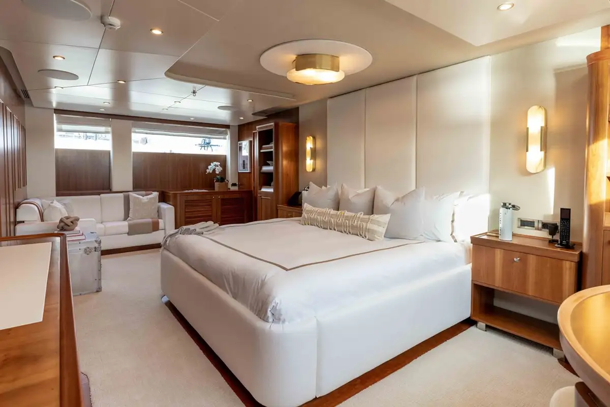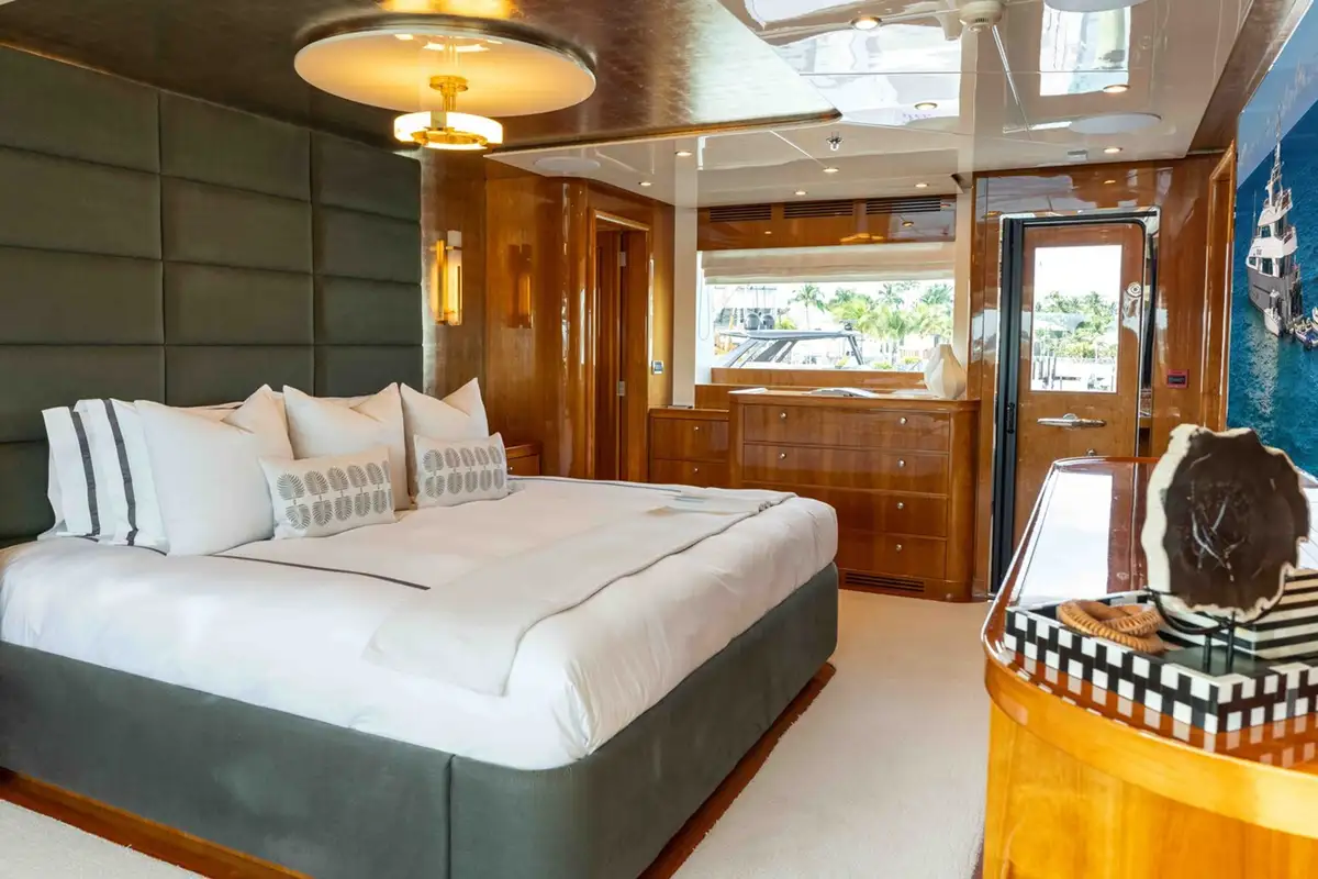 One stand-out feature, hard to find on a yacht of this size, is STAY SALTY’s private owner’s deck. The entire bridge deck (apart from the wheelhouse, which has separate access) is dedicated to the master suite including the upper aft deck, which serves as a private outside lounge terrace, and the sky lounge, which is the master suite’s living room and study. This connects directly with the full-beam master cabin, which also has a door leading out onto the port-side companionway.
