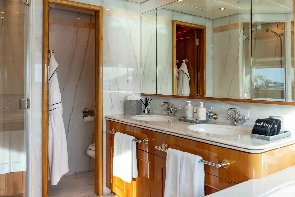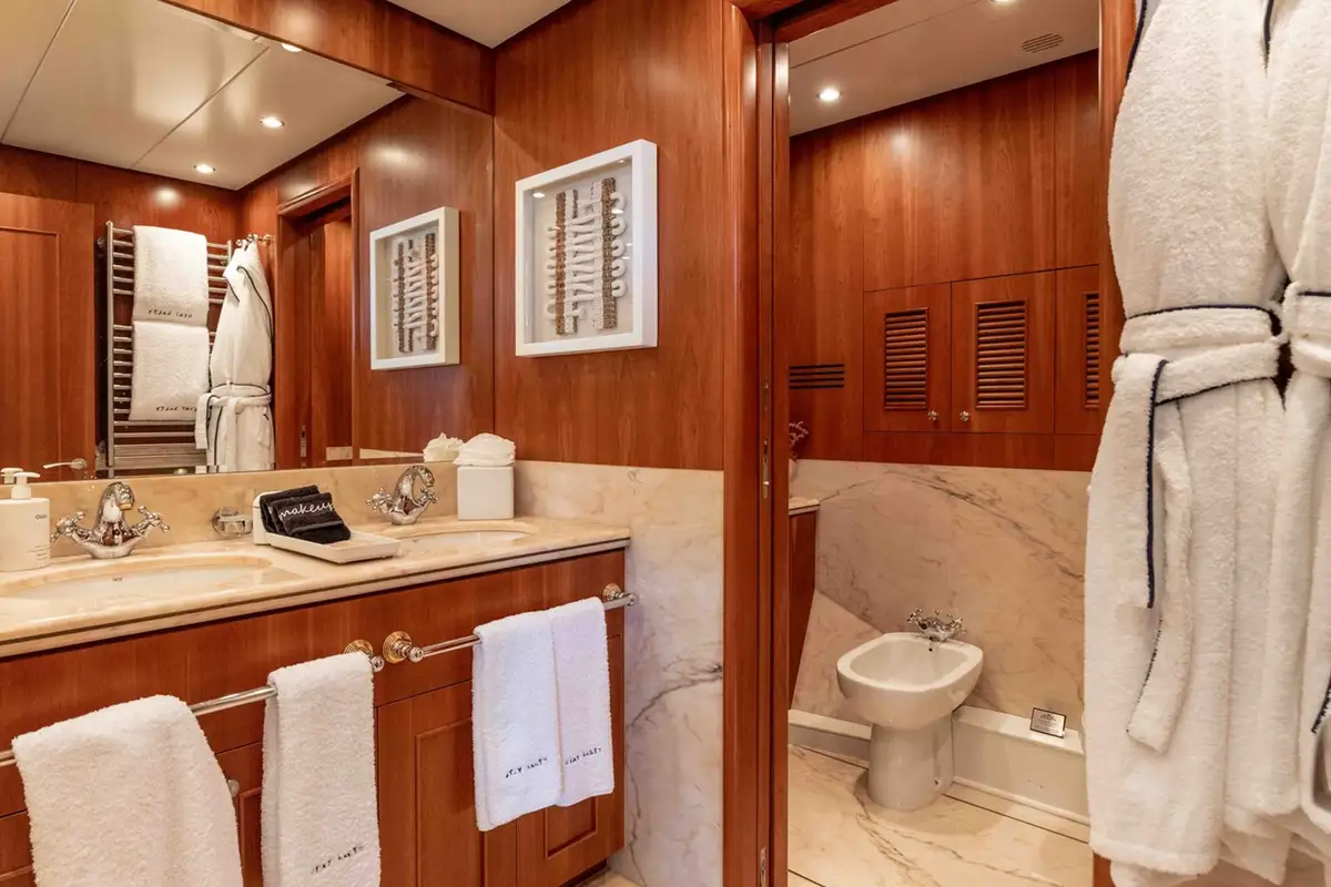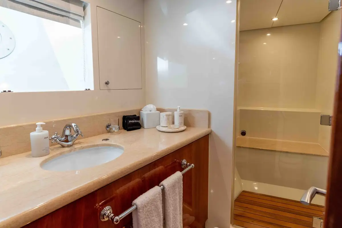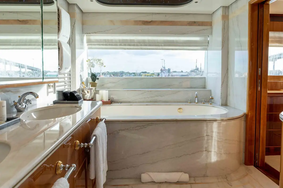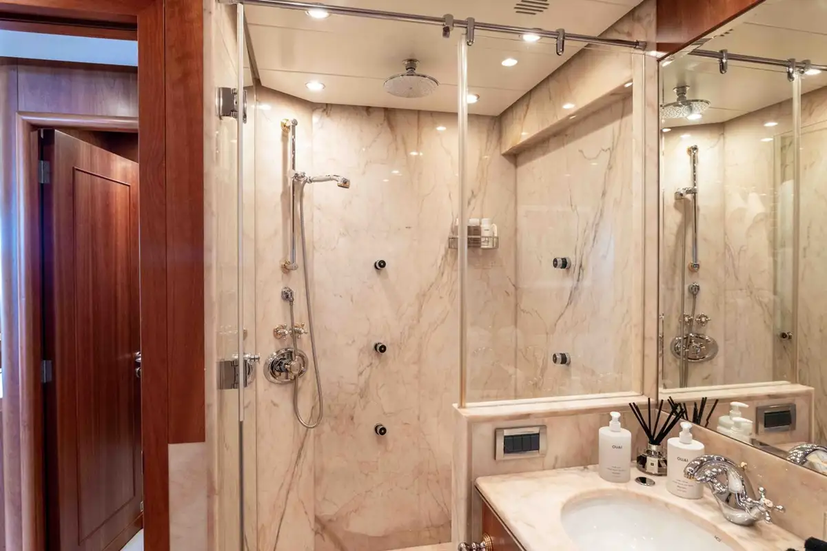 This unusual layout arrangement allows there to be an equally grand and lavish VIP suite at the forward end of the main deck with a large L-shaped sofa on one side of the full-beam cabin and a luxurious marble bathroom, so she’s an ideal yacht for two couples or families sharing a charter. The other three guest cabins on the lower deck are all nicely finished in the same timeless contemporary-classic style.