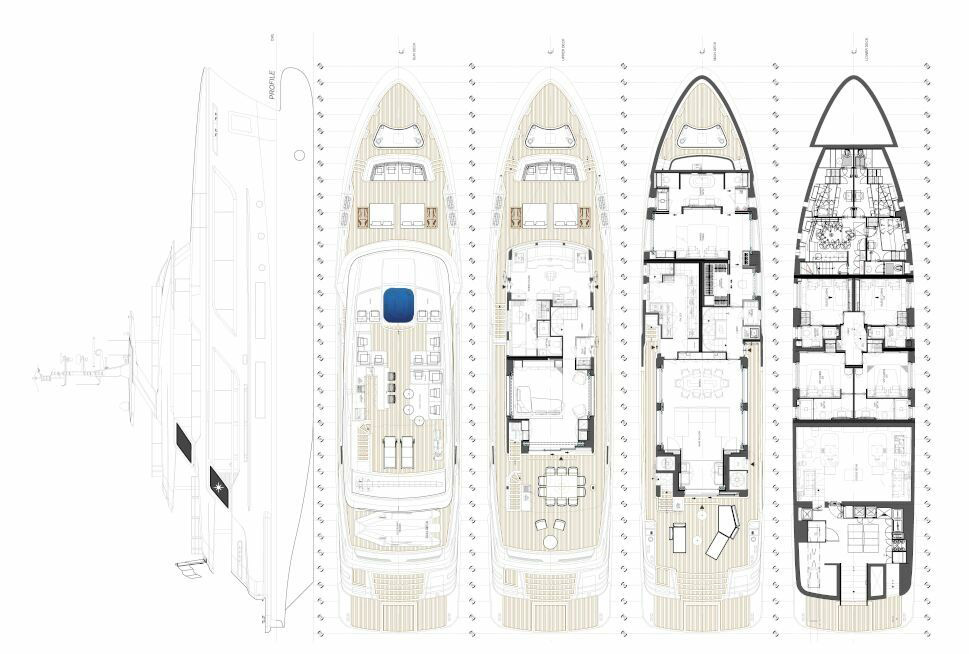 The exterior and interior design seamlessly blend traditional yacht aesthetics with cutting-edge solutions, offering optimal comfort and safety, with limitless cruising capabilities to the world’s most secluded destinations. With an emphasis on outdoor spaces, STELLAMAR's spacious lounging and dining areas on all decks invite you to bask in the sun and sea breeze, with the sundeck jacuzzi providing an excellent vantage point for spectacular views while at anchor. Even when relaxing in the interior spaces, the vast windows in the main and upper salons ensure a constant connection to the natural environment. Up to twelve guests are accommodated in five modern ensuite cabins with vast windows for optimal natural light. The four guest cabins are located on the lower deck, while the master stateroom on the main deck forward offers a private haven and includes a walk-in wardrobe and private study. The master ensuite features his and hers sinks, separate heads, a full-length bath, shower, and a sauna. The experienced crew of seven enjoys comfortable quarters on the lower deck, ensuring seamless service throughout the voyage.