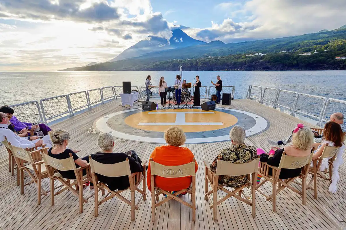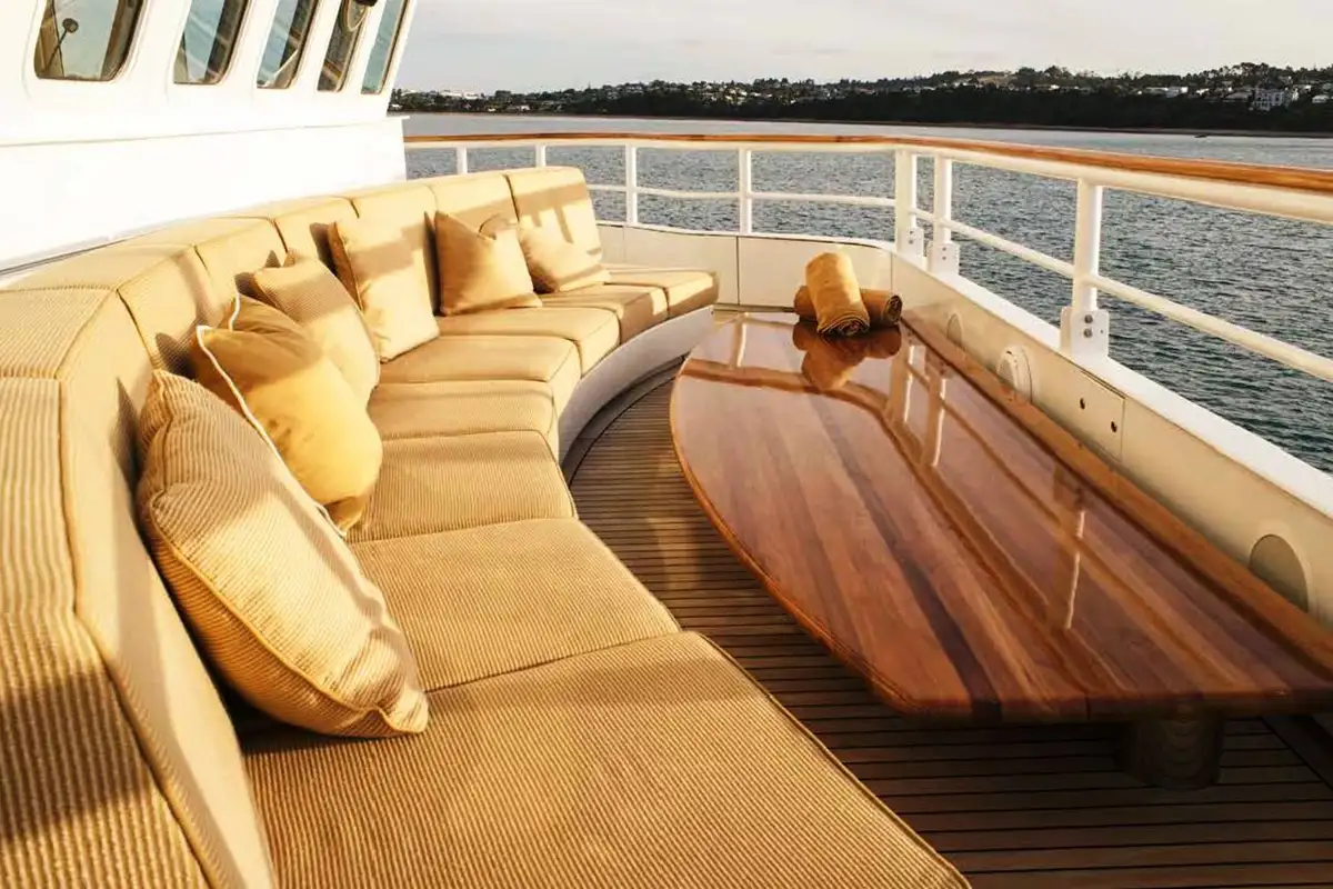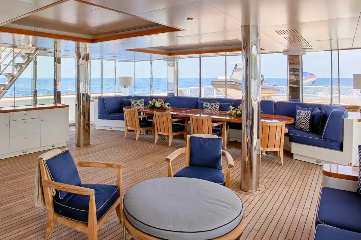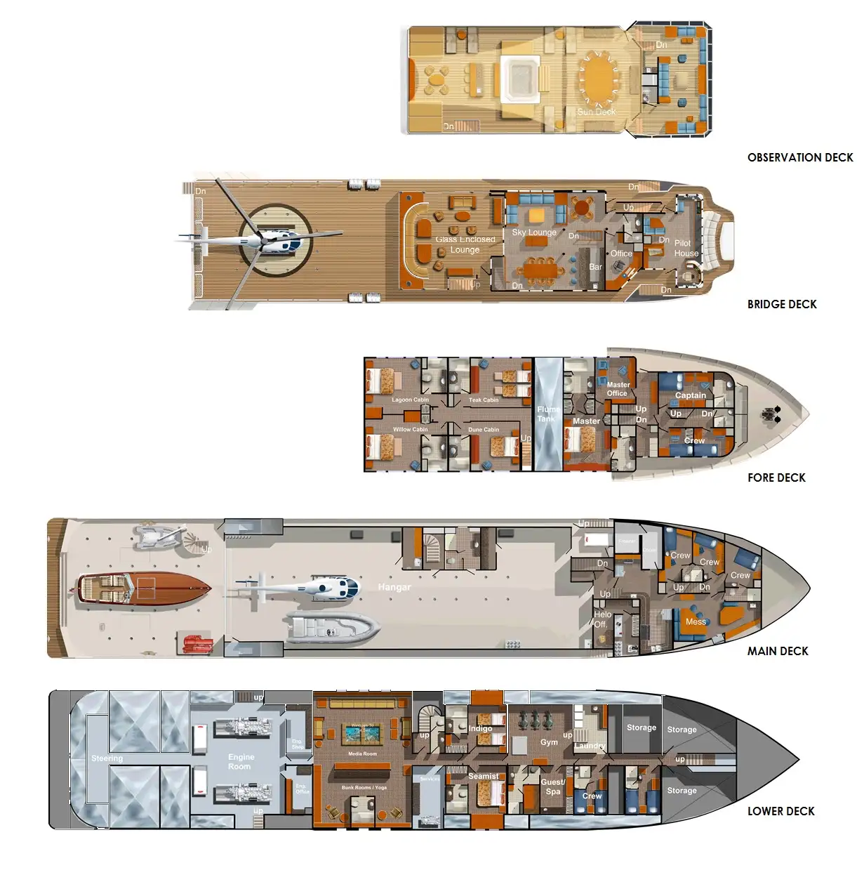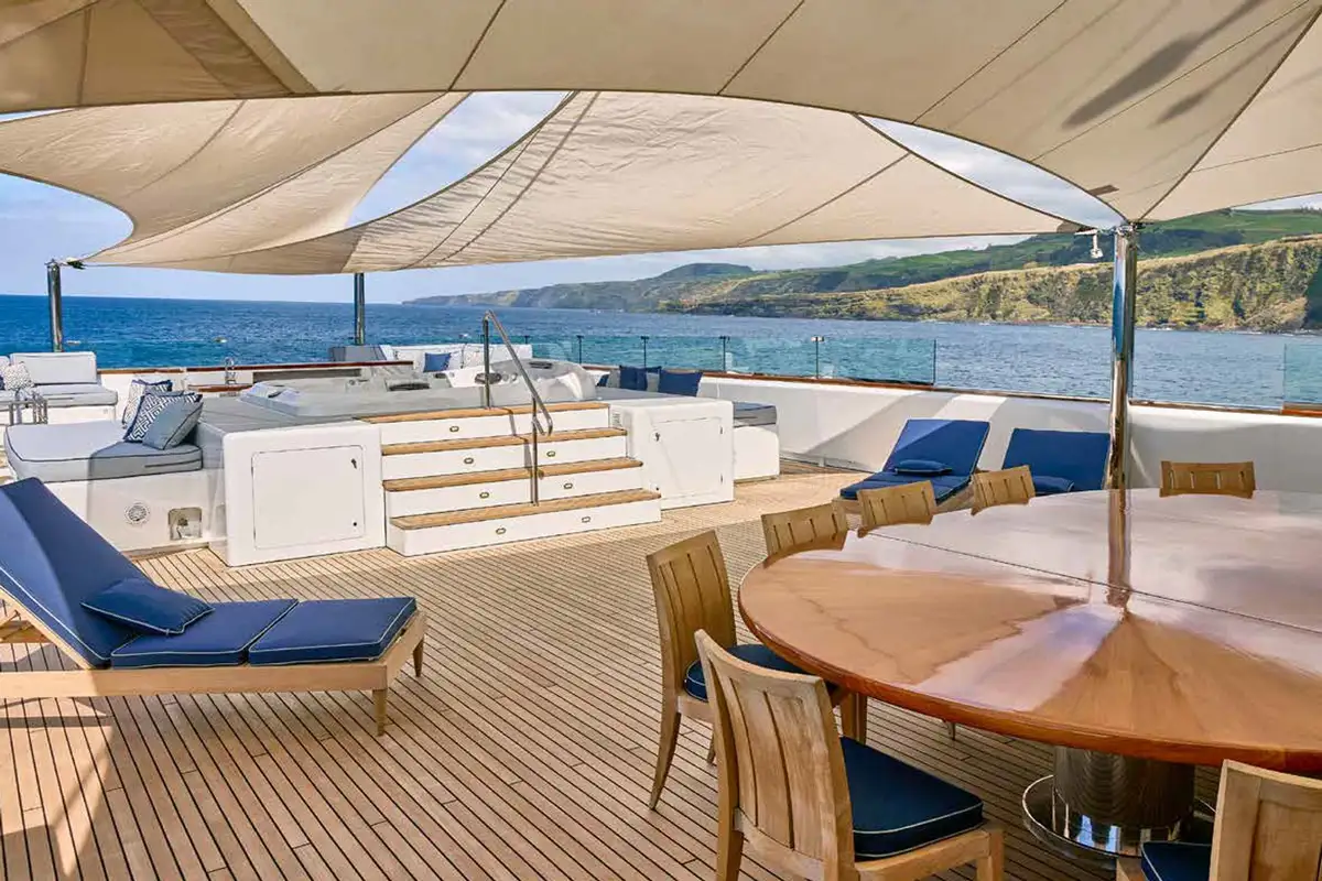 She has a glass enclosed lounge on the bridge deck overlooking the helipad, a sky lounge with bar and dining table and a Portuguese bridge forward of that. Her upper deck has a master suite with his and hers bathrooms and a private office along with four VIP suites, each with huge picture windows. A further double cabin and twin cabin on the lower deck complete accommodation for 12 in seven guest cabins and 20 crew attend to your every need.