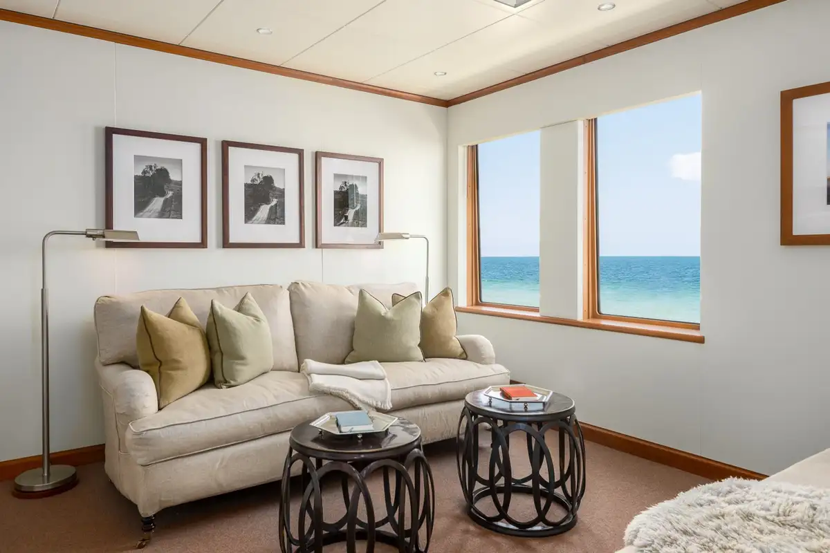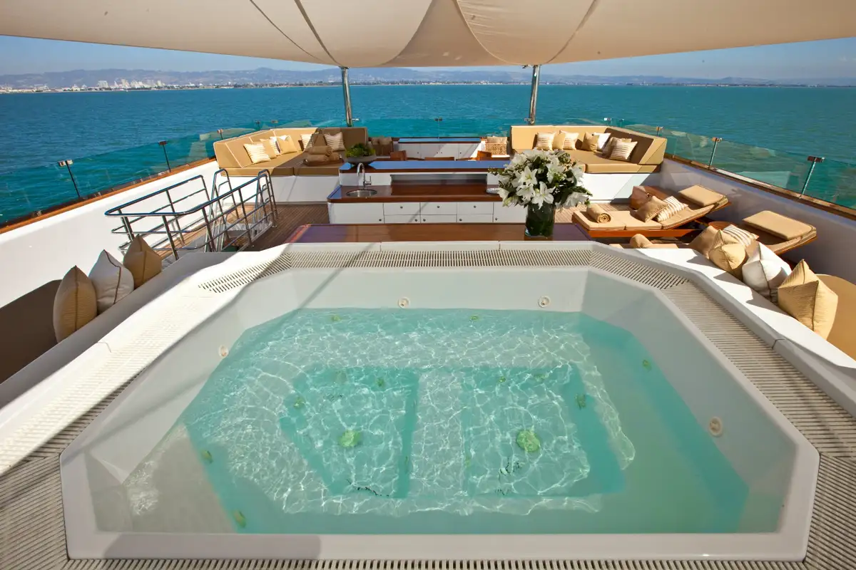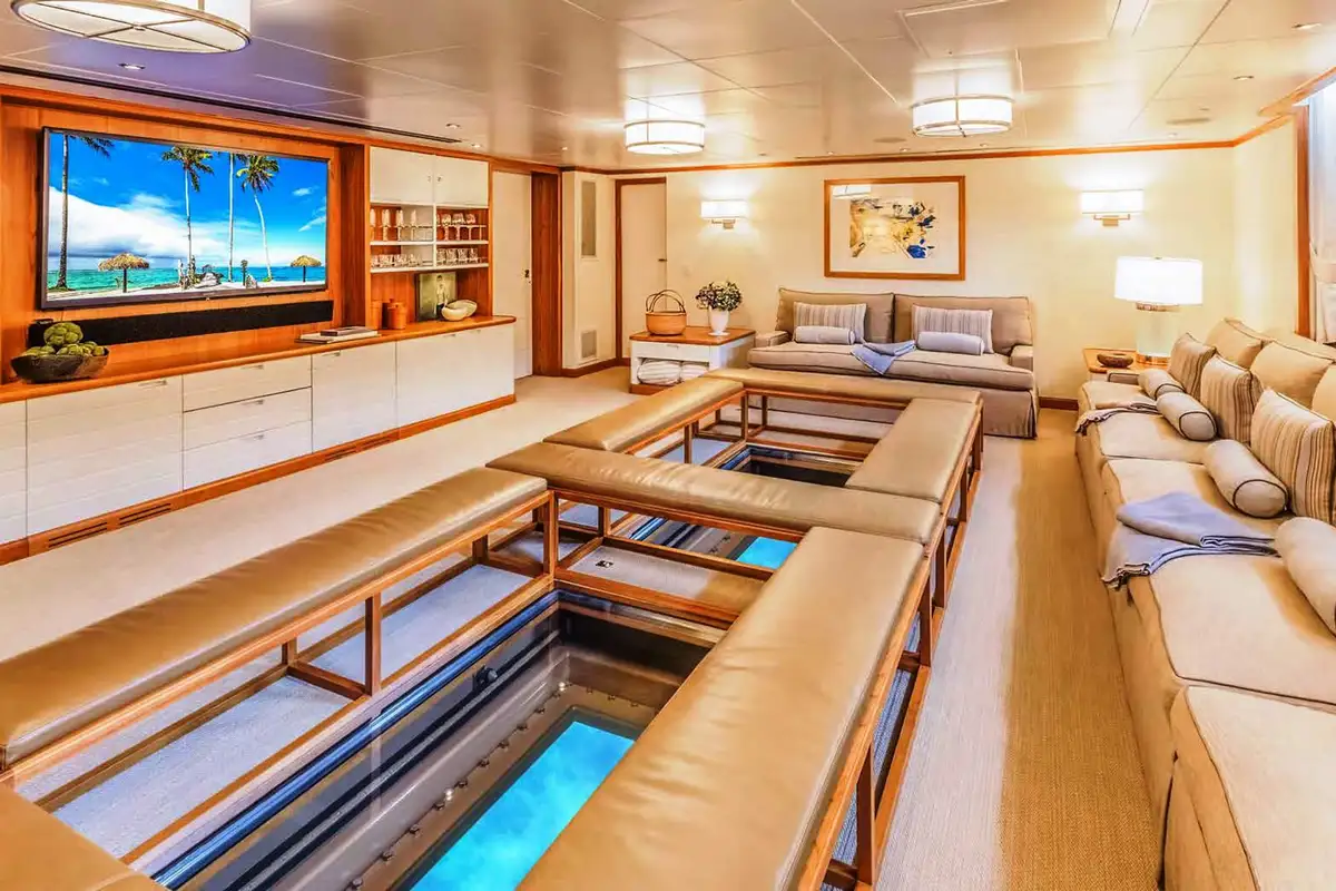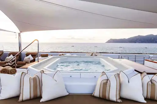 She ticks all the superyacht boxes, with al fresco dining shaded by awnings and a large jacuzzi on the sun deck with an observation lounge delivering amazing views forward. Workout in the lower deck's dedicated gym, watch movies in the media room - if you can tear your eyes from the windows in the floor that bring marine life into view. Enjoy a massage in the spa then cleanse with a team bath, it's all possible on SURI.