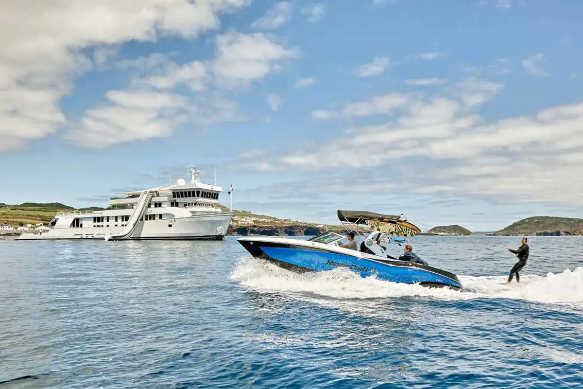 Take the yacht's motorbikes or mountain bikes to the beach in the 7m Munson landing craft tender to explore ashore while the crew sets up the beach BBQ. Send up the seaplane for a bird's eye view of your destination or take the helicopter to find snowy peaks for heli-skiing.