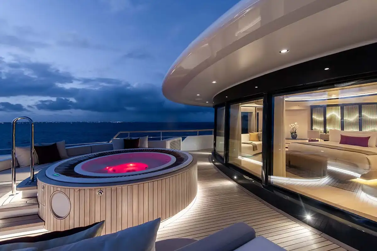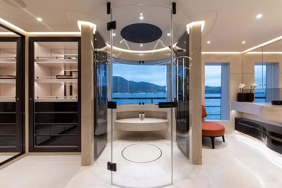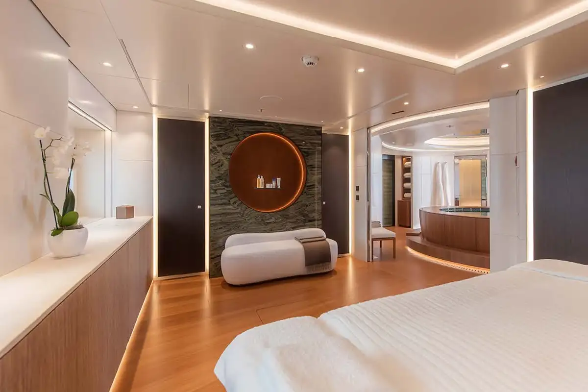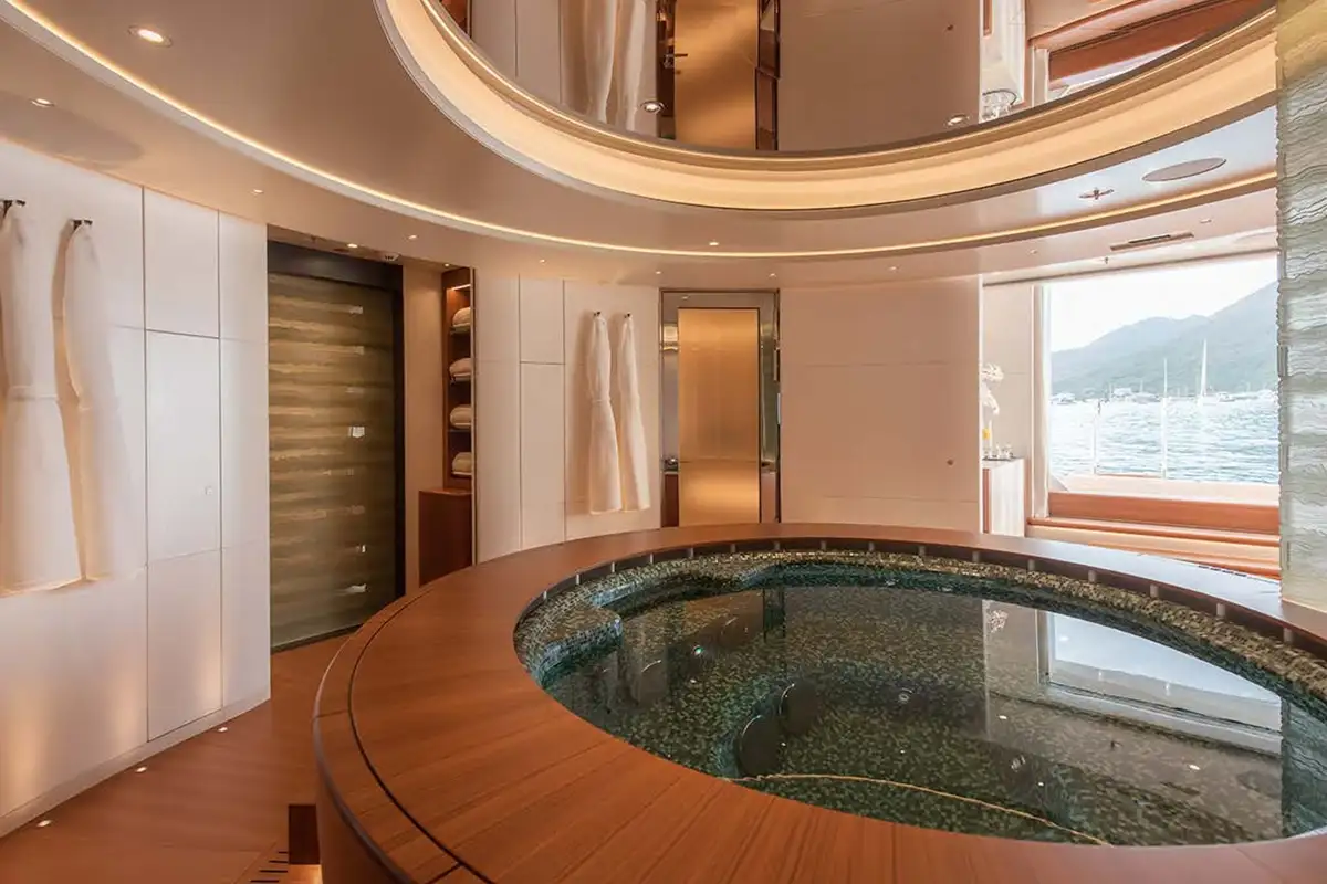 On the lower deck is a vast full-beam wellness suite dedicated to unwinding and relaxing. With a massage suite, hammam, sauna, and sea terrace encircling a central spa and sculptural glass centrepiece, you and your guests can find personal time to reflect on what you’ll do next.