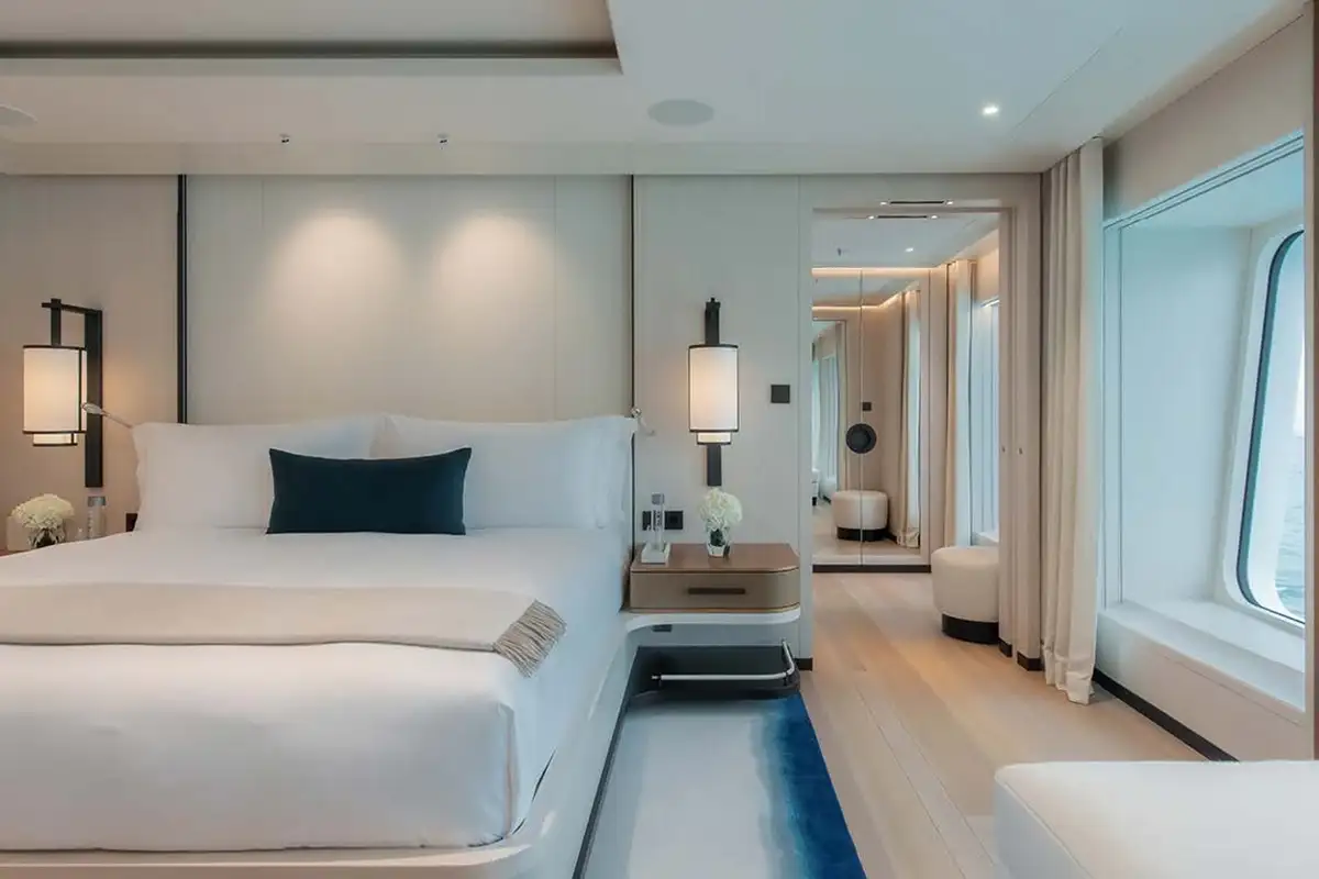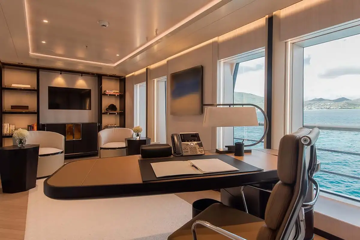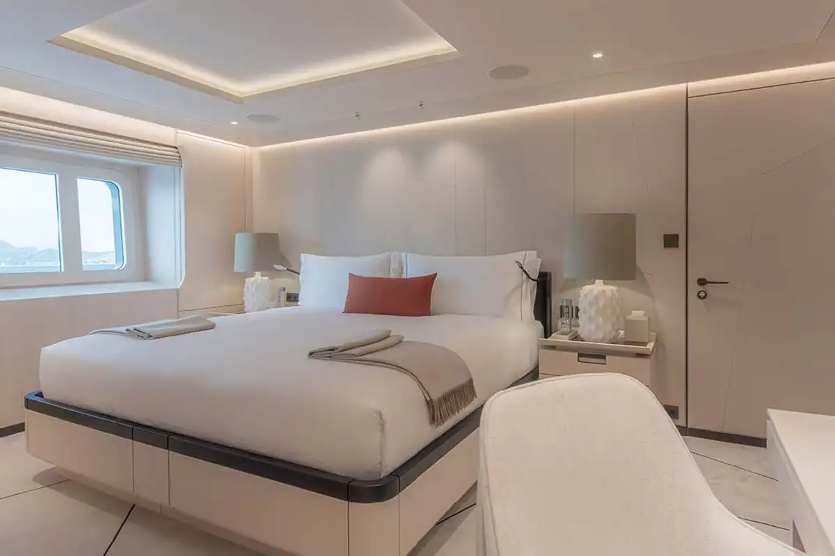 In between days you’ll have your luxurious suites to delight in. The beautifully elegant master suite is found on the owner’s deck. 180-degree panoramic windows look forward from the king-sized island berth to a private jacuzzi sunpad and al fresco lounge area. You can revitalise in the large lavish his and hers bathrooms; each with an adjoining dressing room. There is an office, dining and lounge for your sole use too.
